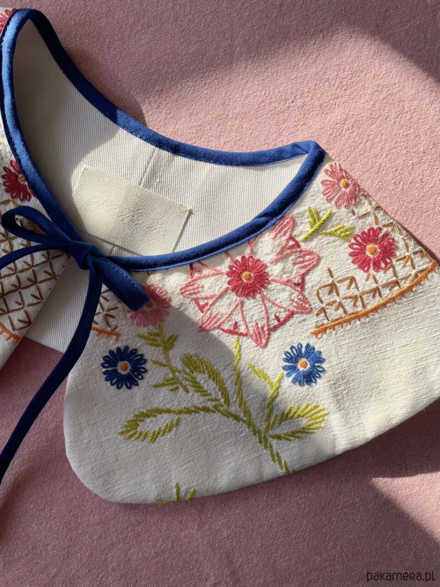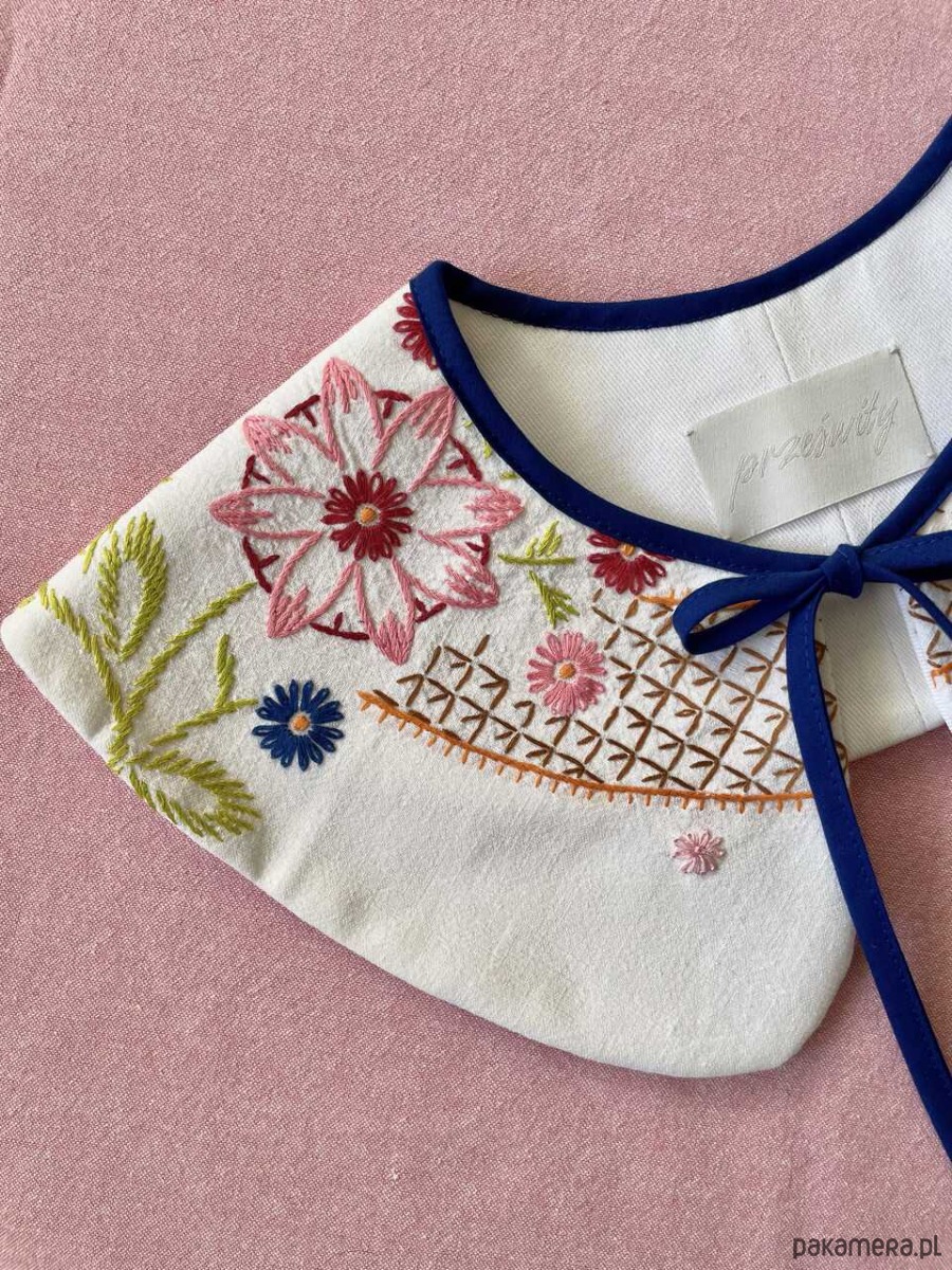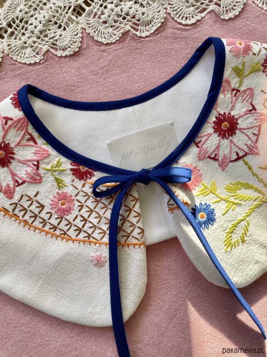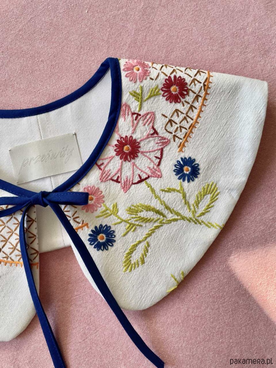 Każdy kołnierzyk powstaje z tkanin z drugiego obiegu, dlatego mogą pojawić się na nich niewielkie ślady użytkowania. Zawsze staramy się je odczarować: haftem, kompozycją, detalem. Prosimy o wyrozumiałość, to naturalna część pracy z materiałami, które już miały swoje życie.