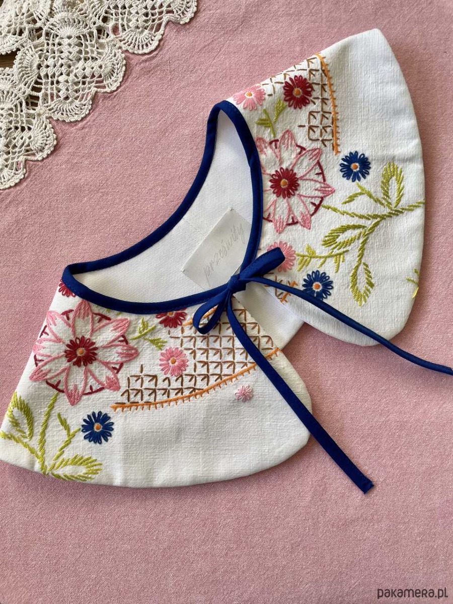 Kołnierzyk uszyty ręcznie z bawełnianego obrusa z kwiatowym haftem z drugiego obiegu.