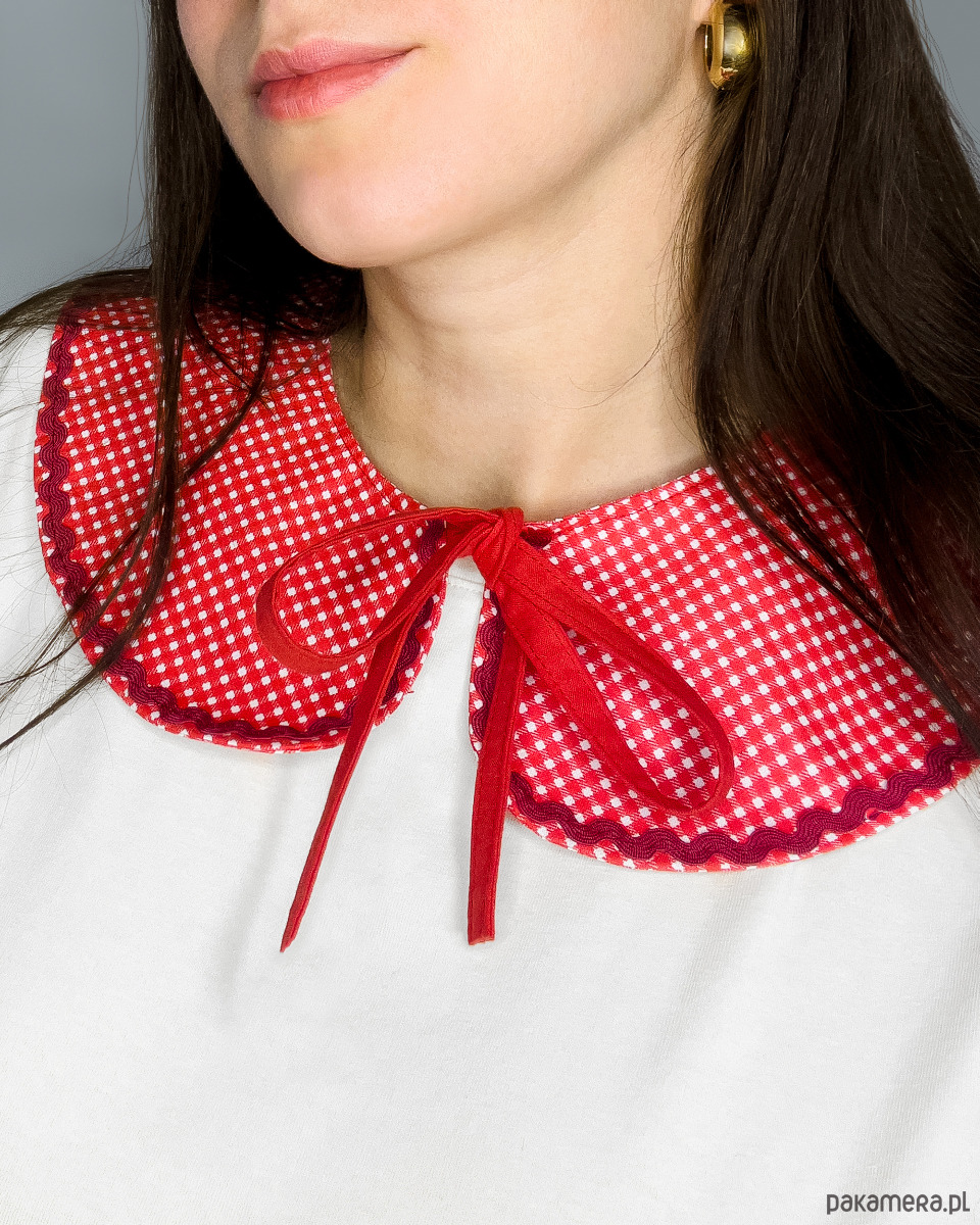 Piękny stylowy kołnierzyk, wiązany na dwa troczki, wzór to czerwona krateczka.