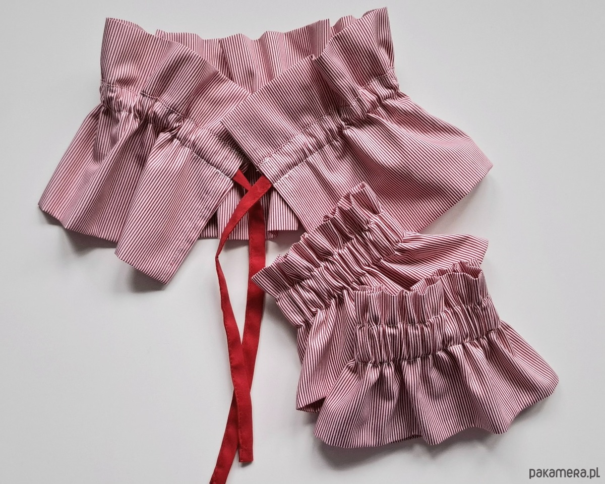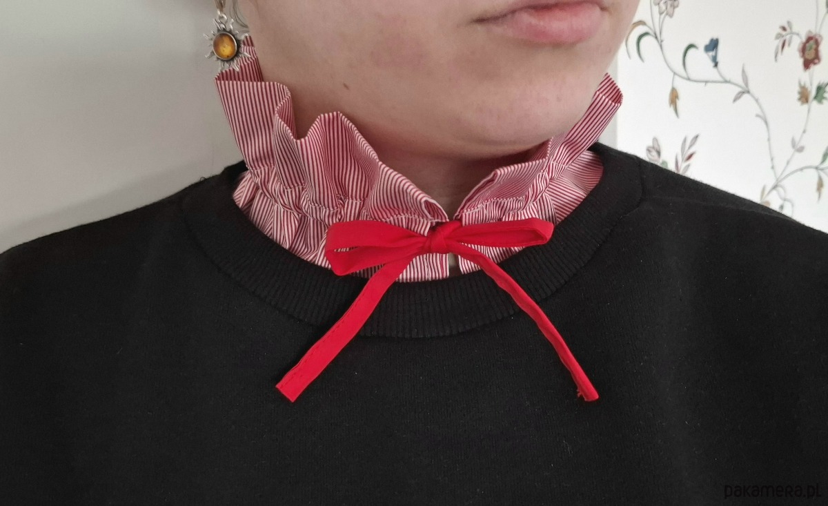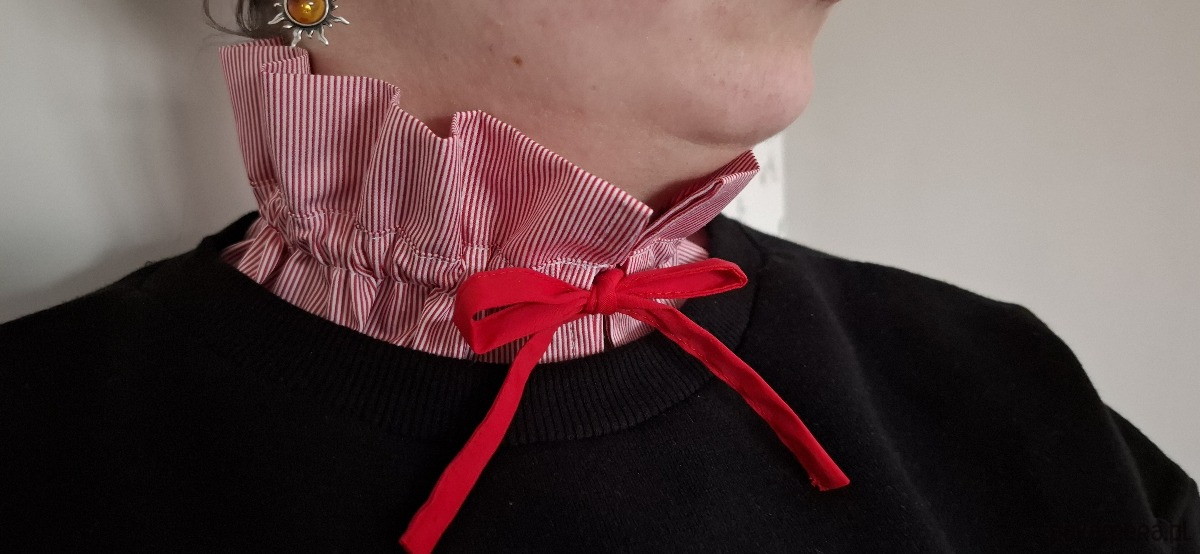 Kołnierzyk i mankiety uszyte z tkaniny bawełnianej dodadzą charakteru Twojej stylizacji. Do bluzy, sukienki czy sweterka. Marszczenie i wiązanie ułatwią dopasowanie.