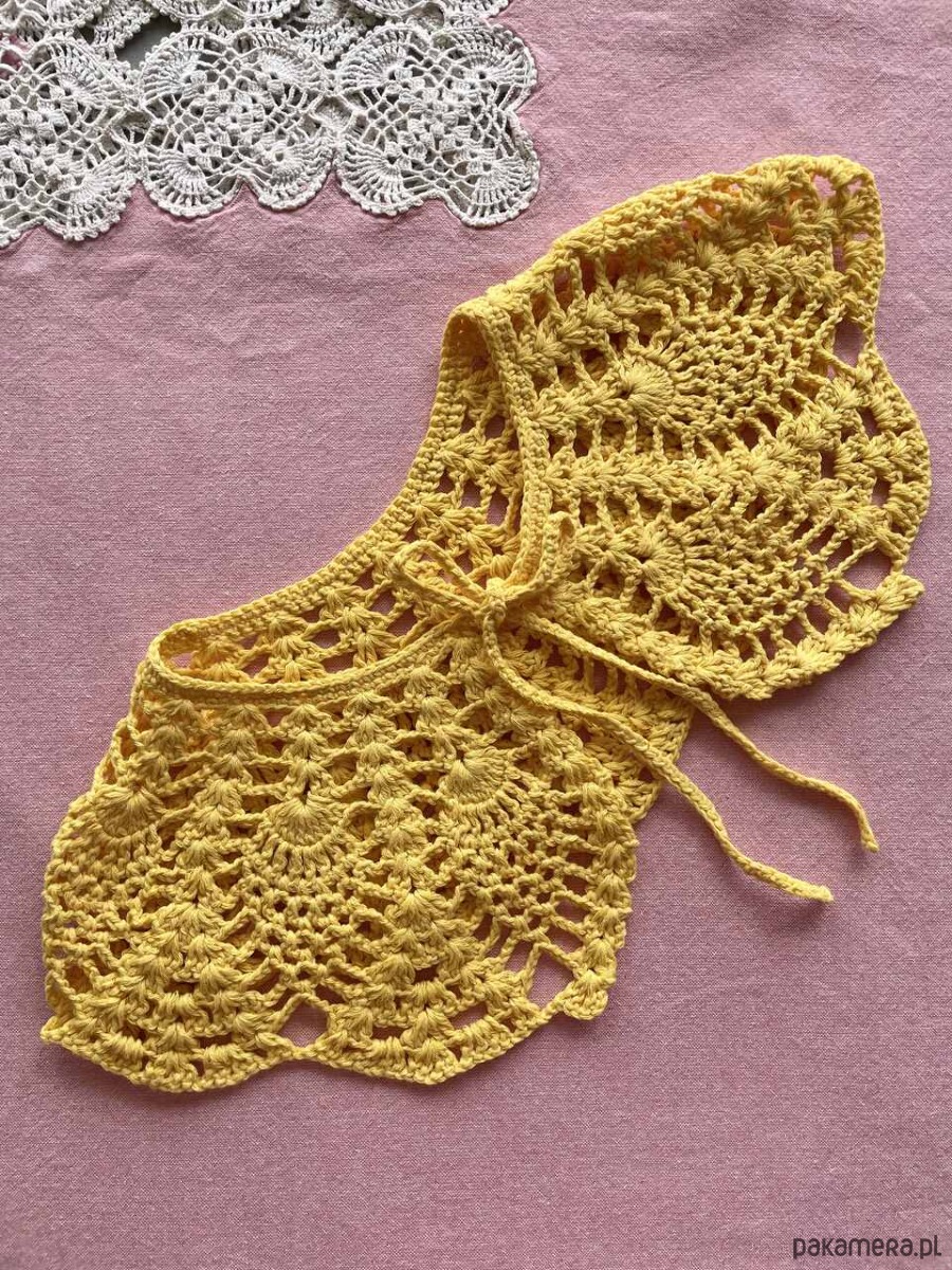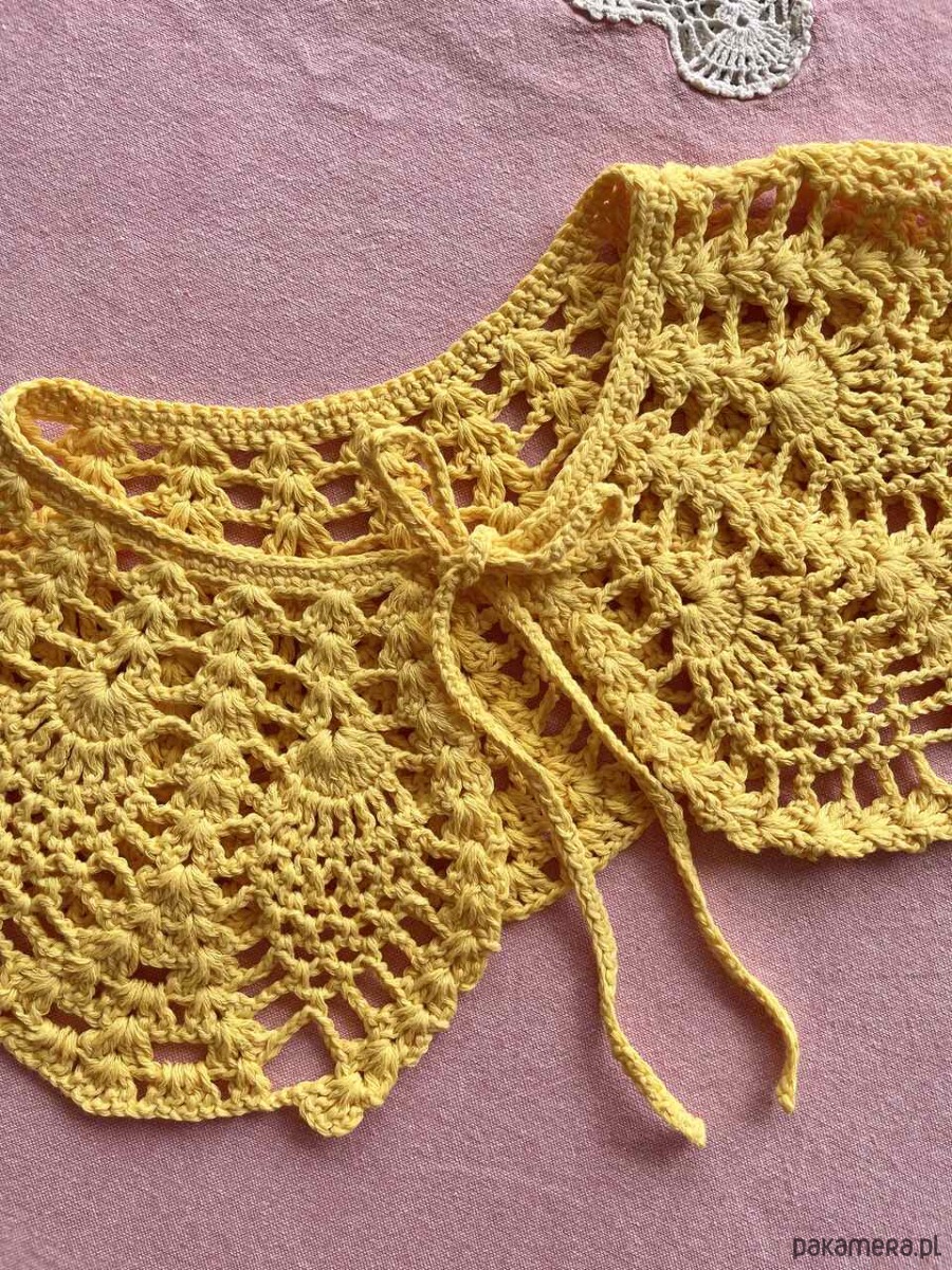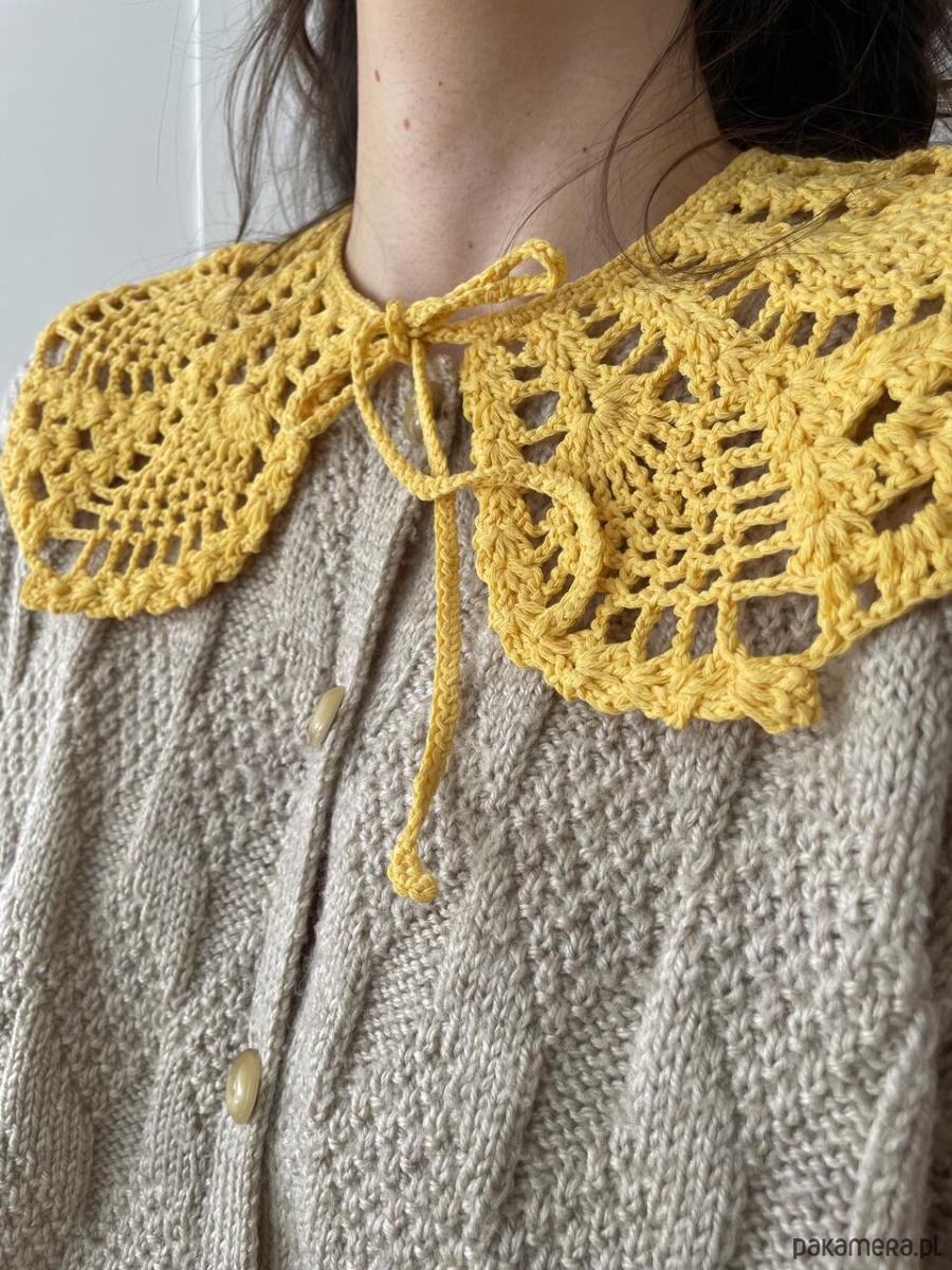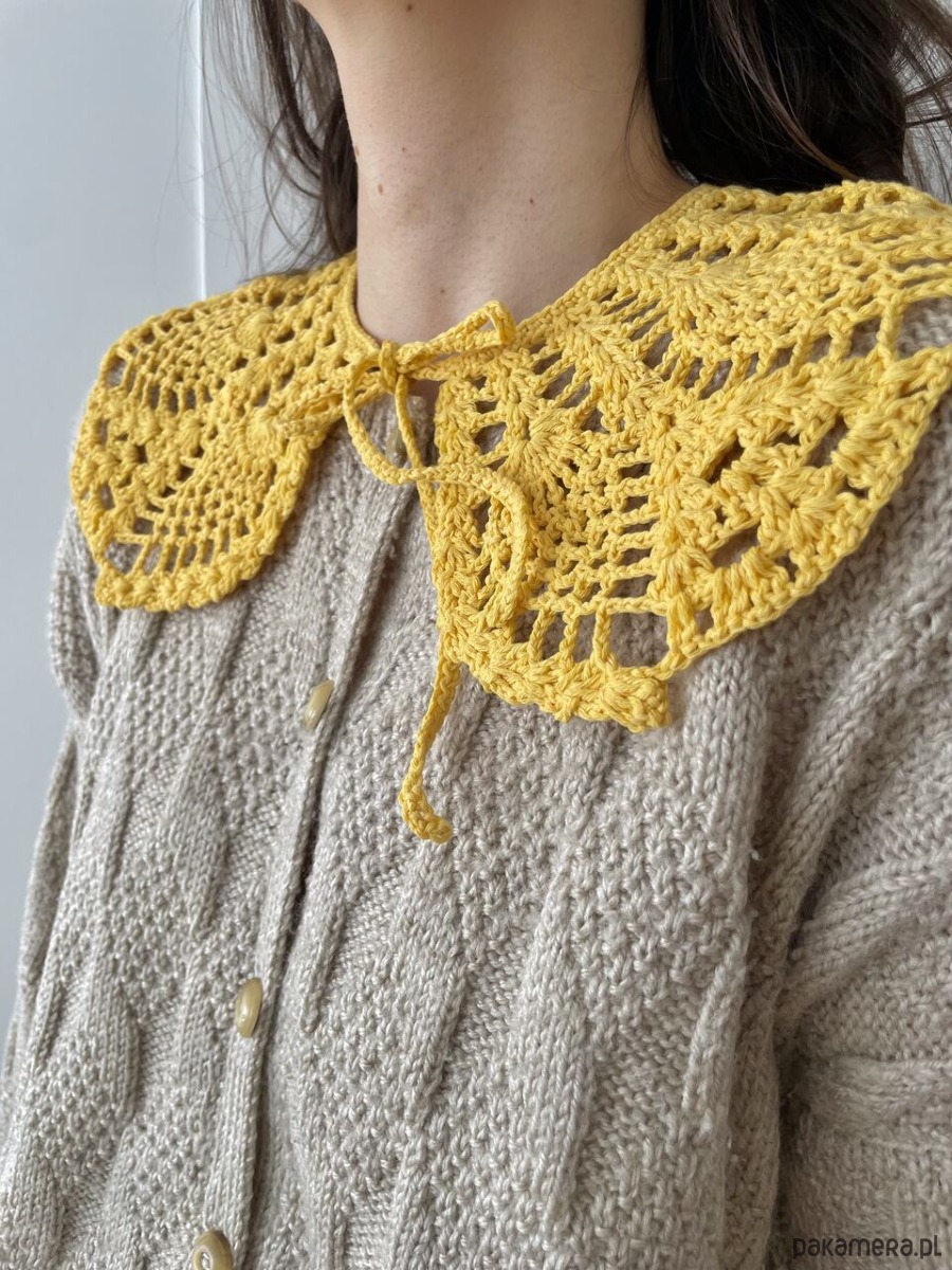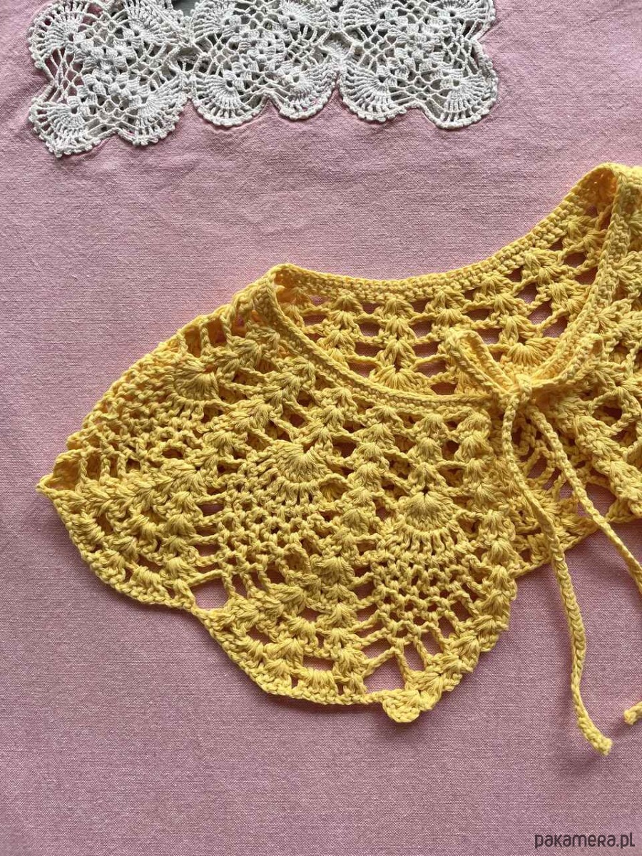 Szydełkowy bawełniany żółty kołnierzyk, wykonany ręcznie z bawełny w ażurowy wzór przypominający dawne koronki - trochę babcine, romantyczne, trochę bajkowe.