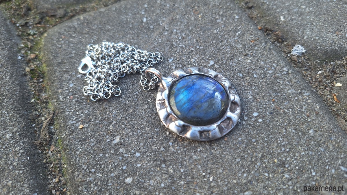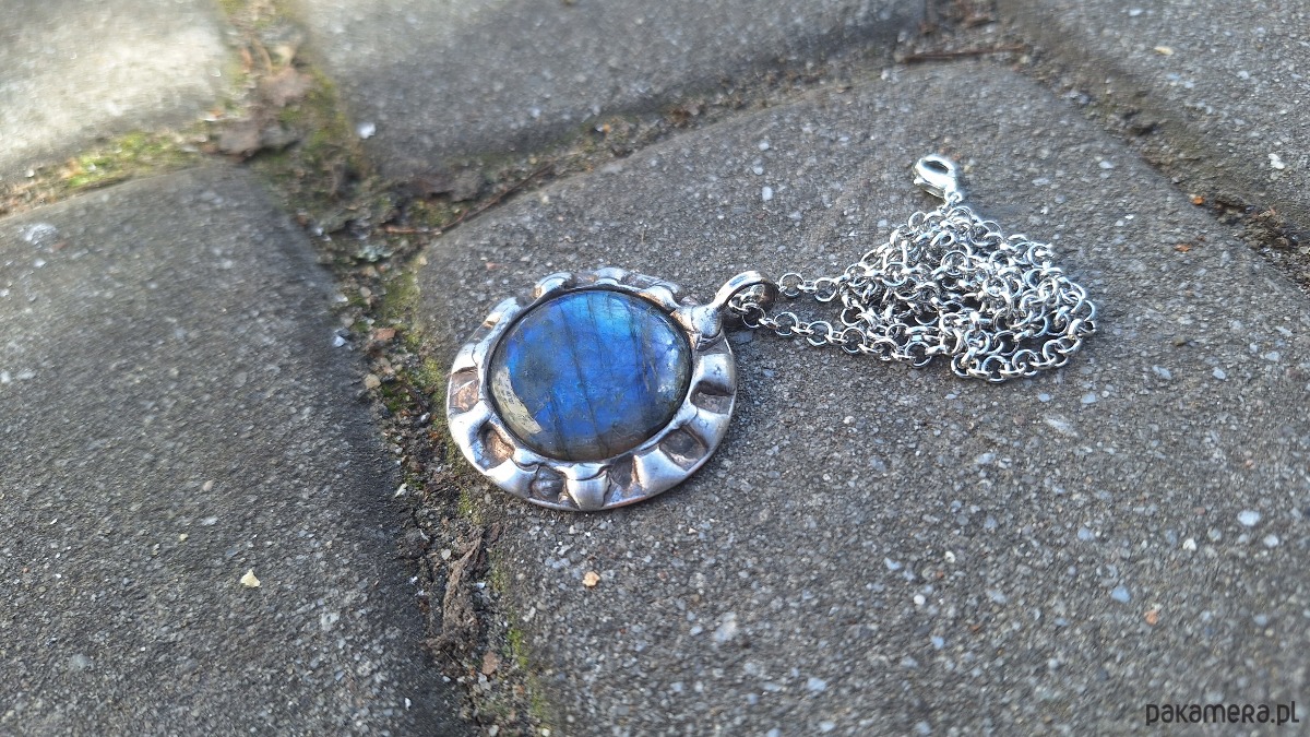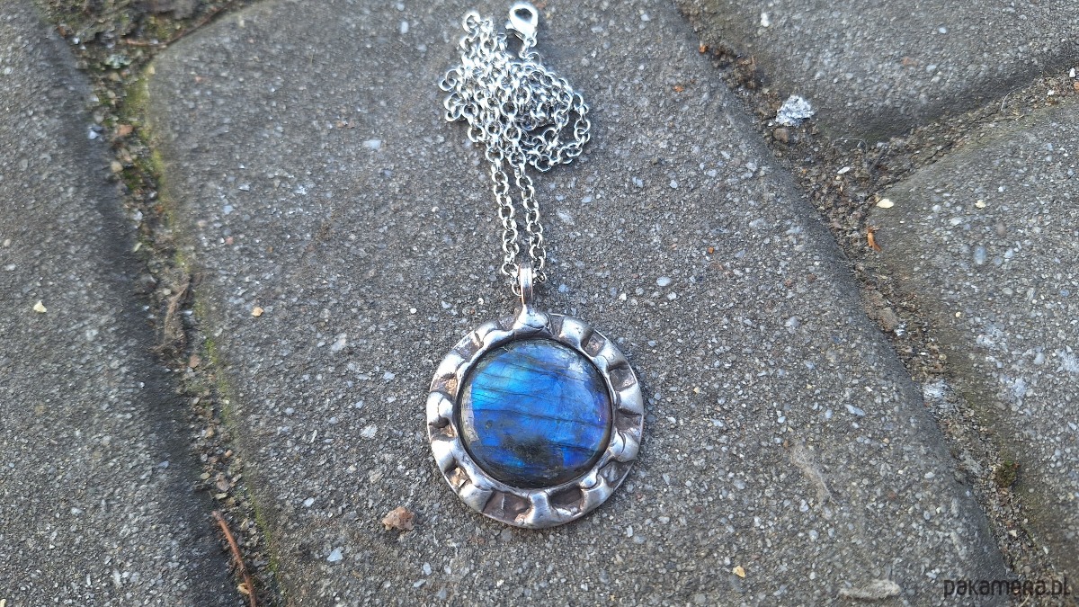 Wisiorek wykonany z miedzi, cyny i labradorytu. Wymiary ok. 3.5 na 3.5 cm. Zawieszony na łańcuszku o długości ok. 50 cm.