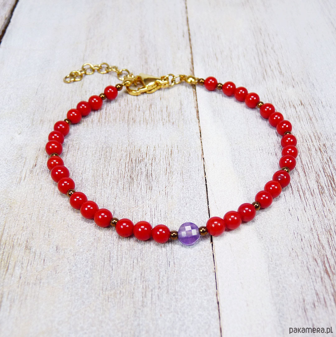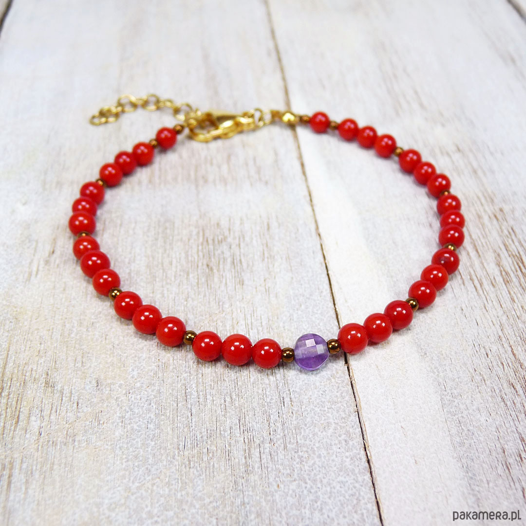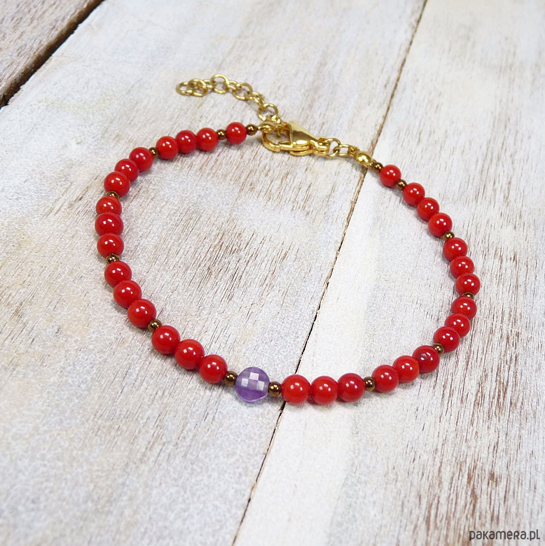 koral czerwony 4 mm, ametyst fasetowany pastylka 5 mm, hematyt stare złoto, stal szlachetna złota