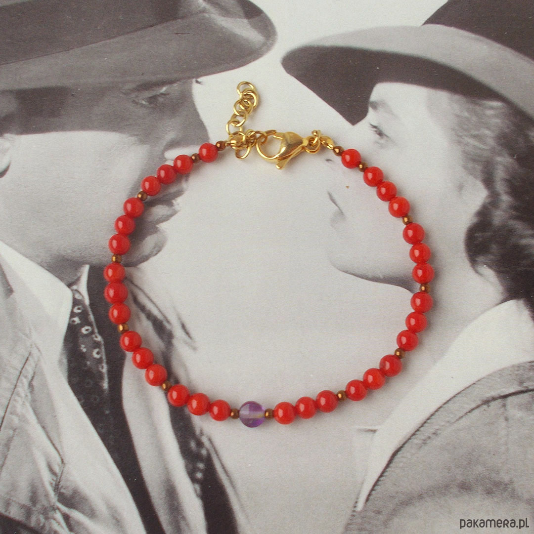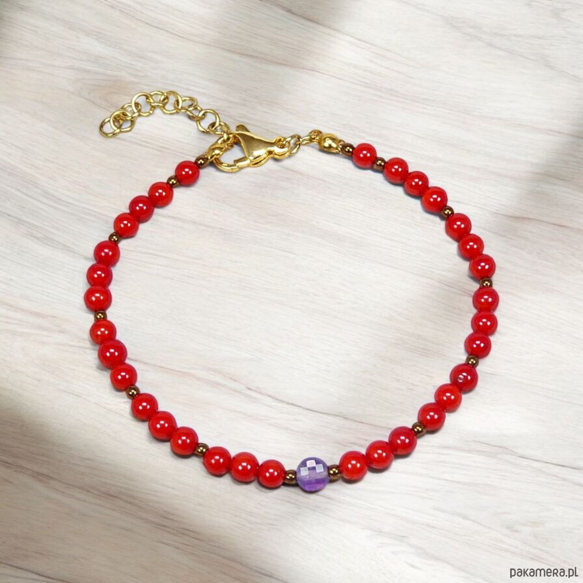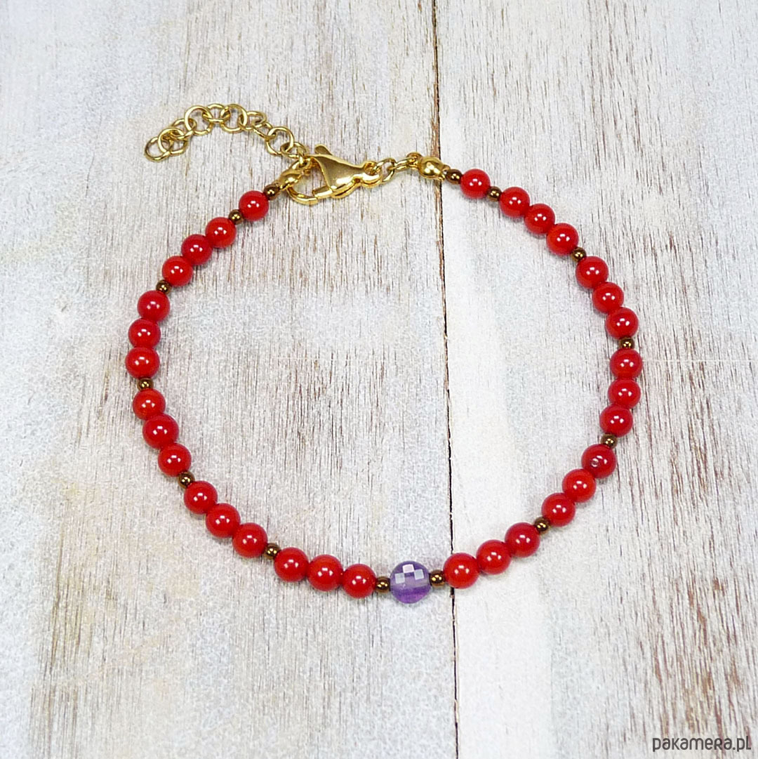 koral czerwony 4 mm, ametyst fasetowany pastylka 5 mm, hematyt stare złoto, stal szlachetna złota