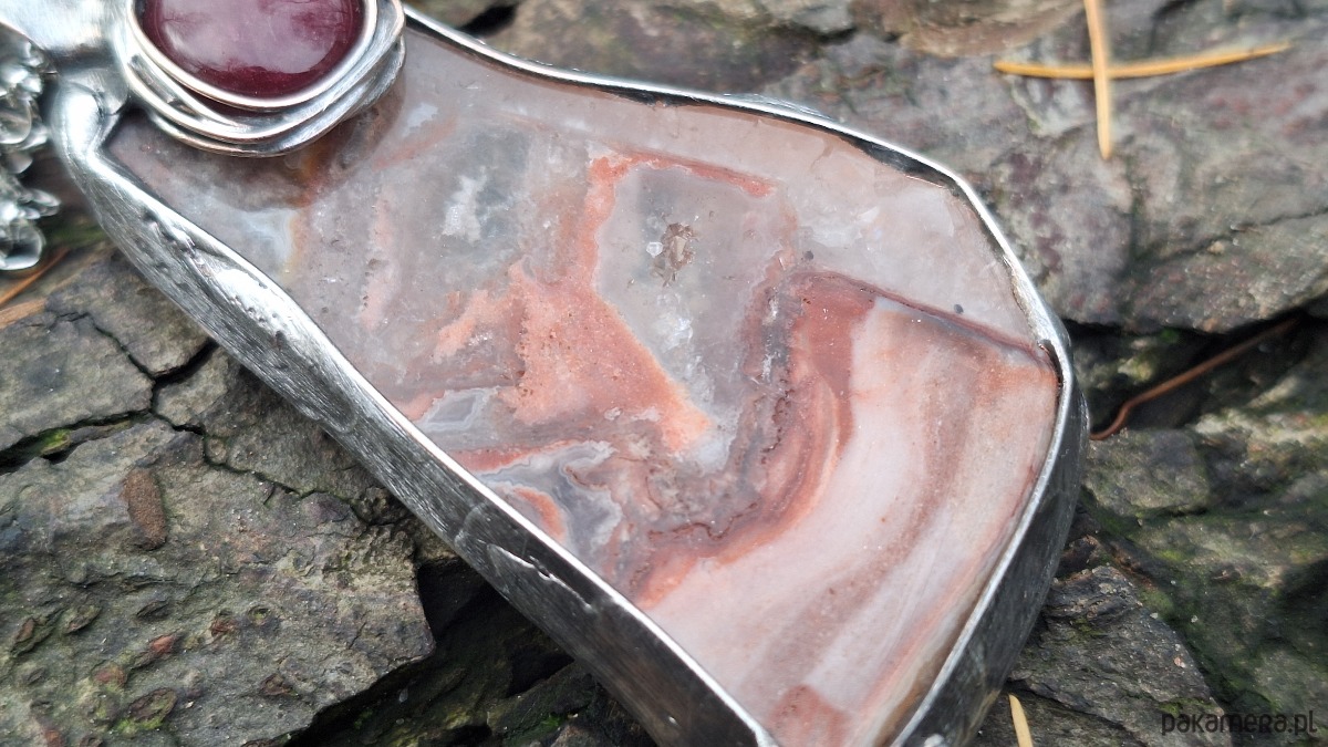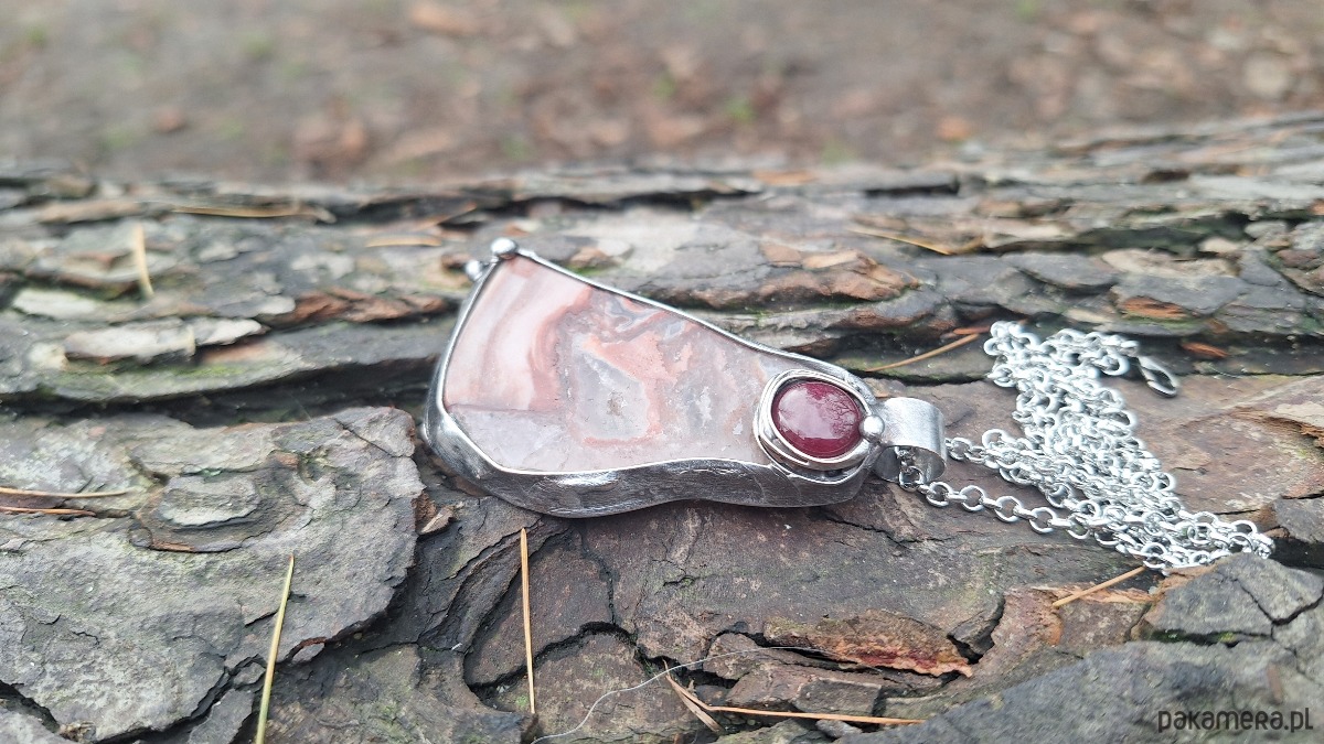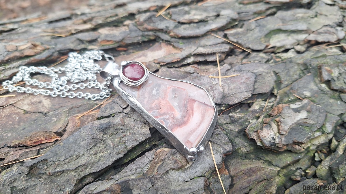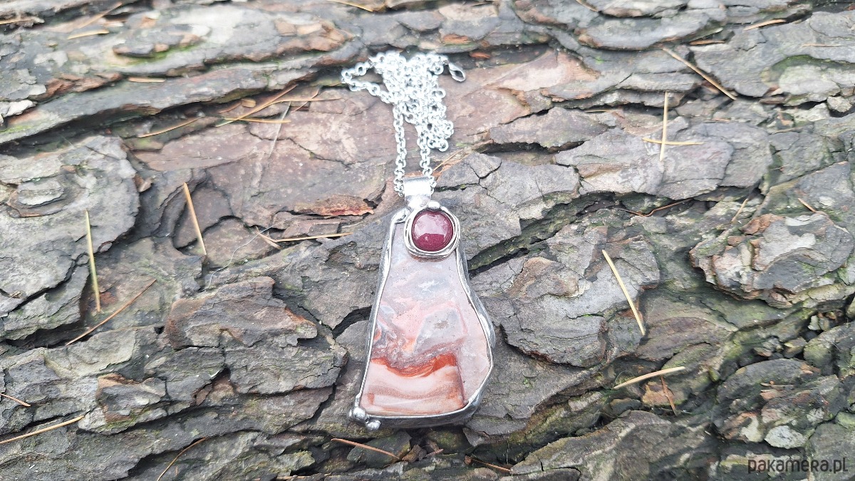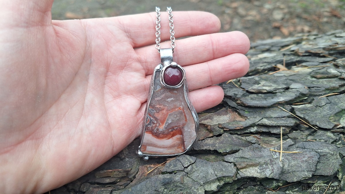 Wisiorek wykonany z miedzi, cyny i agatów. Wymiary ok. 6 na 3.5 cm. Zawieszony na łańcuszku o długości ok. 50 cm.