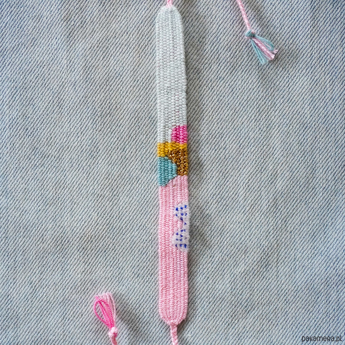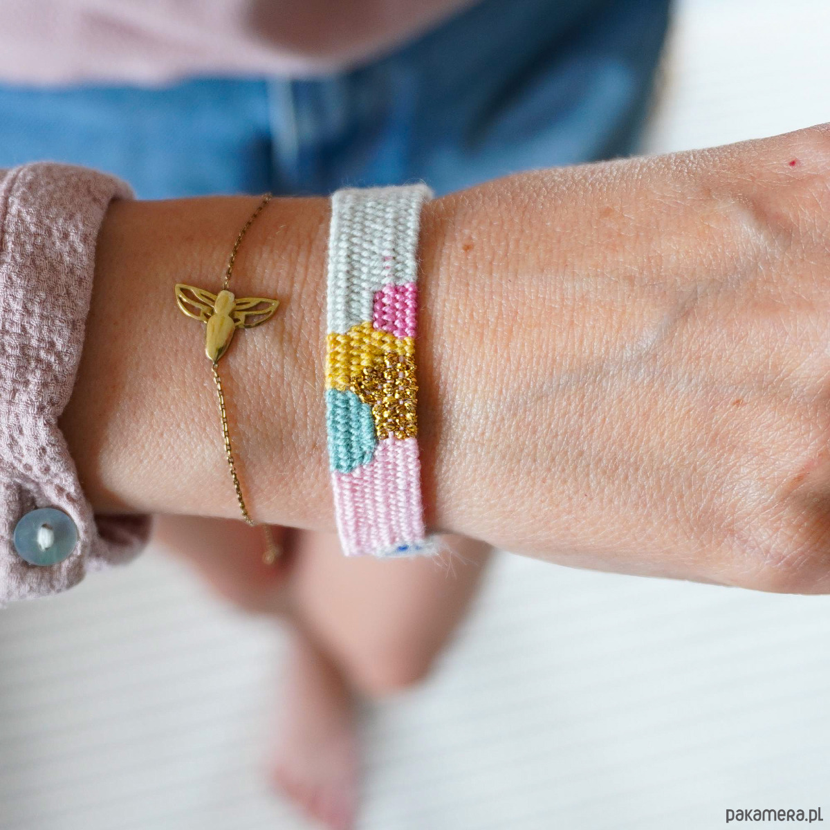 Cudna bransoletka ręcznie tkana w pastelowych kolorach. Szerokość około 1,5 cm , długość części tkanej około 14,15 cm plus sznureczki do samodzielnego wiązania. Polecam serdecznie ♡.