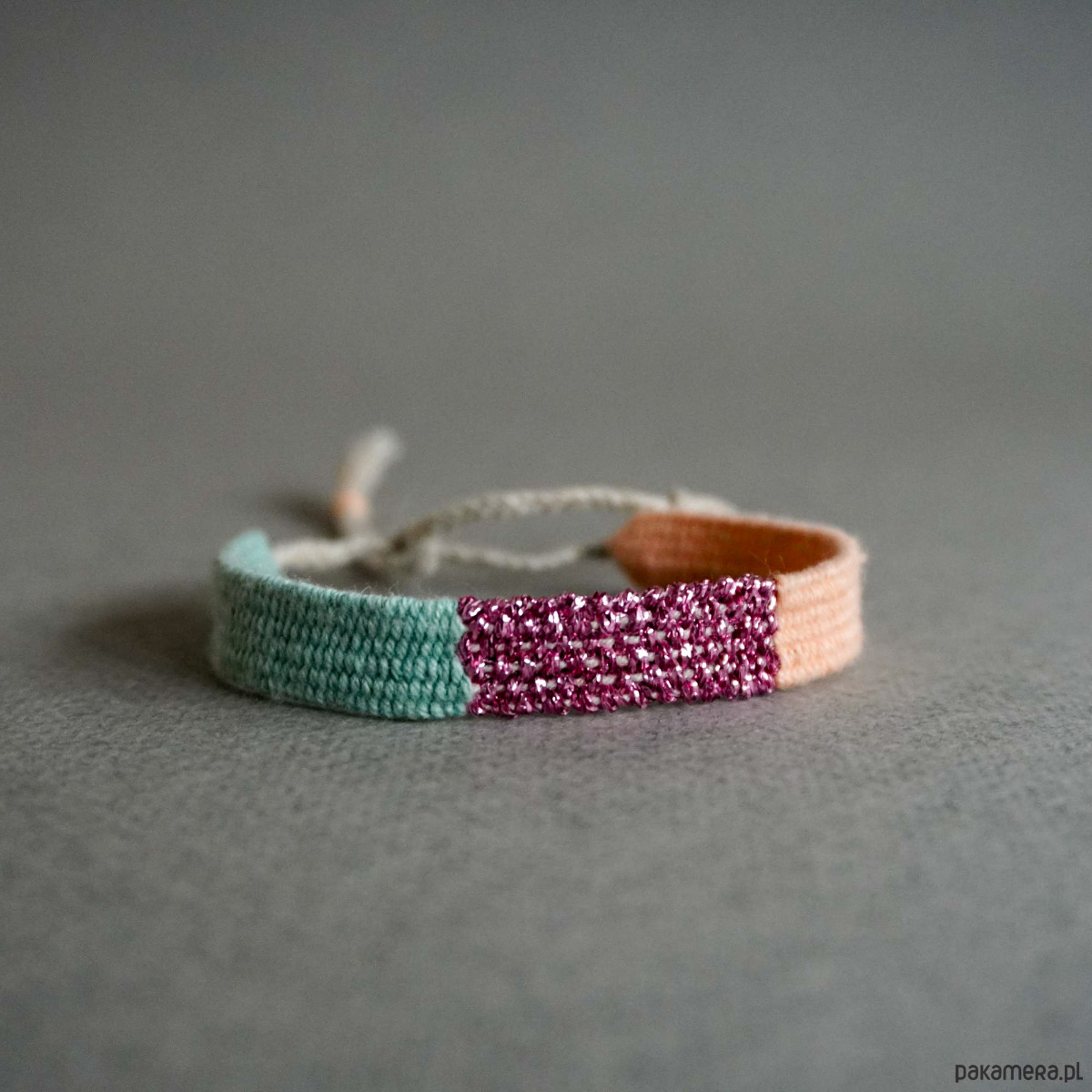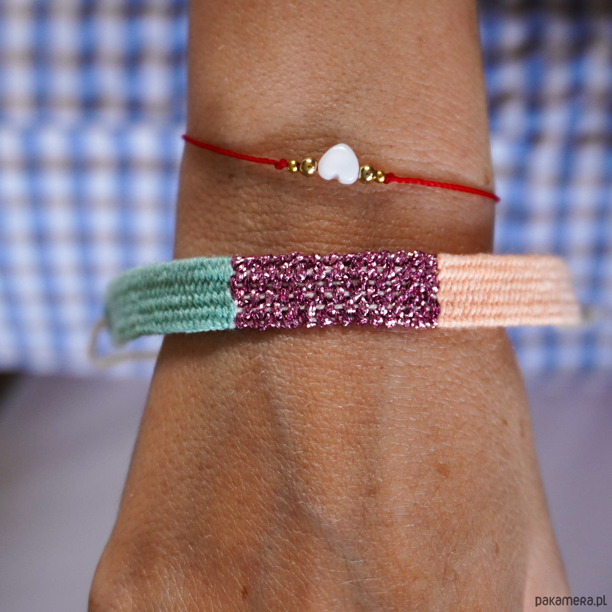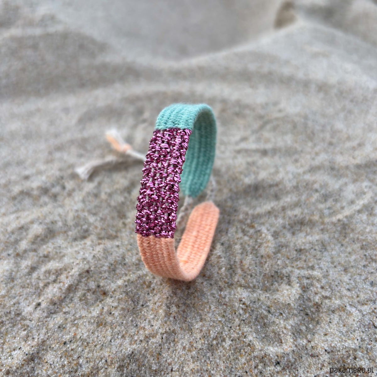 Kolorowa bransoletka ręcznie robiona w wakacyjnym klimacie. Bransoletka ma około 1 cm szerokości, długość części tkanej to około 14, 15 cm. Dochodzą sznureczki do samodzielnego wiązania na supełek. Lekka, oryginalna bransoletka idealna na ciepłe dni 💛. Polecam serdecznie.