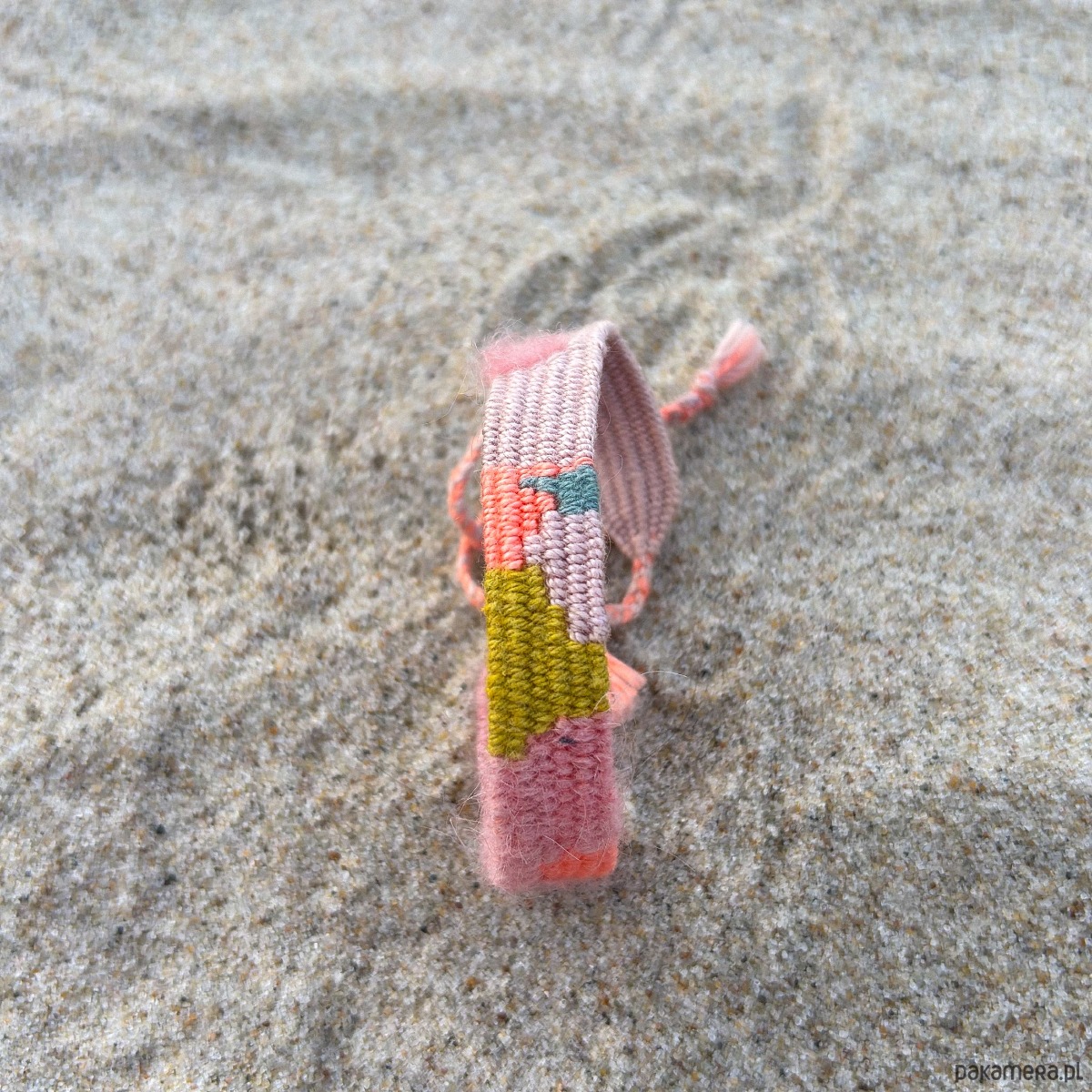 Bransoletka ręcznie wykonana na krośnie. Bransoletka została wykonana z włóczki bawełnianej, wełnianej (alpaka, moher) i lnianej. Szerokość około 1 cm , długość części tkanej około 14, 15 cm. W tej ofecie w sprzedaży jest bransoletka kolorowa, złota dostępna jest w innej mojej ofercie. Polecam serdecznie