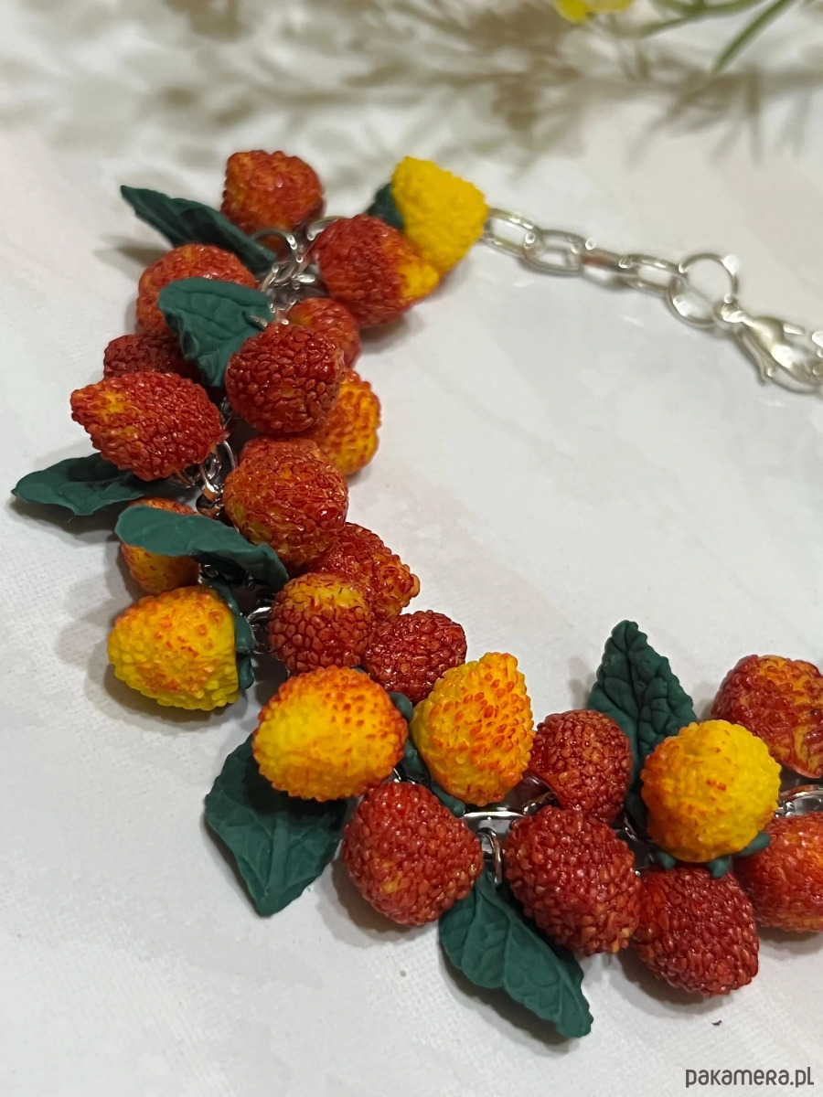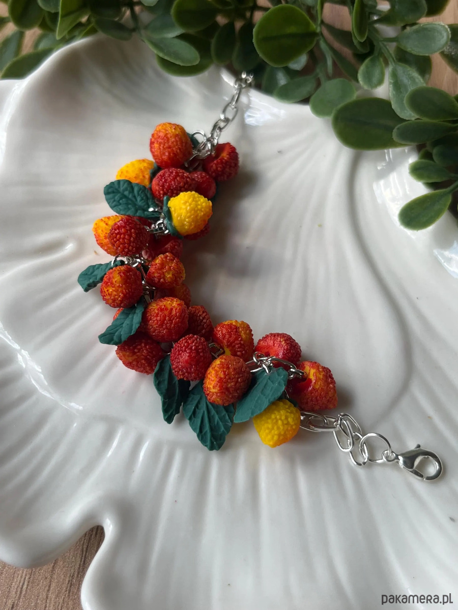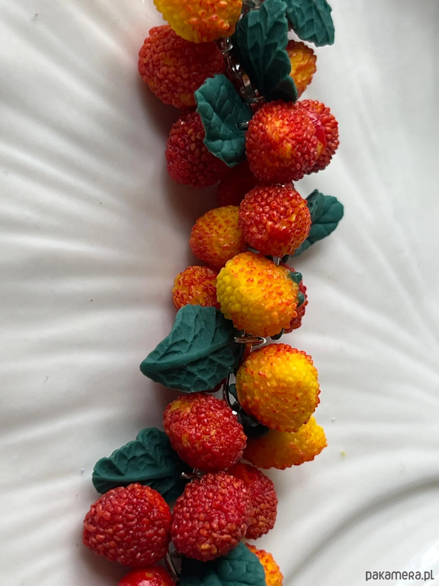 Dodaj koloru do swojej stylizacji dzięki tej unikalnej, ręcznie robionej bransoletce! Wykonana z gliny polimerowej, ozdobiona miniaturowymi owocami przypominającymi poziomki lub maliny oraz ciemnozielonymi liśćmi. Idealny dodatek dla miłośników natury, lata i oryginalnej biżuterii.