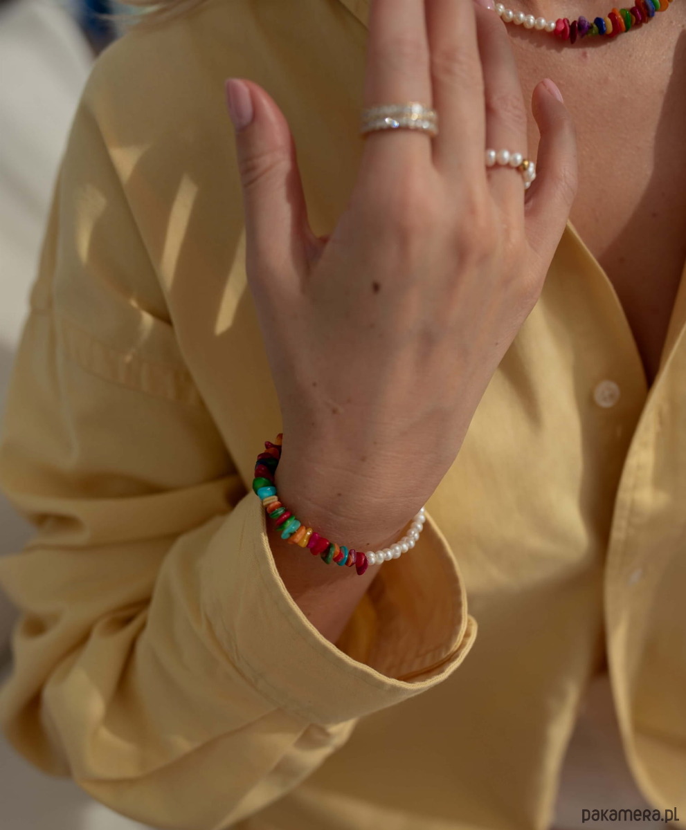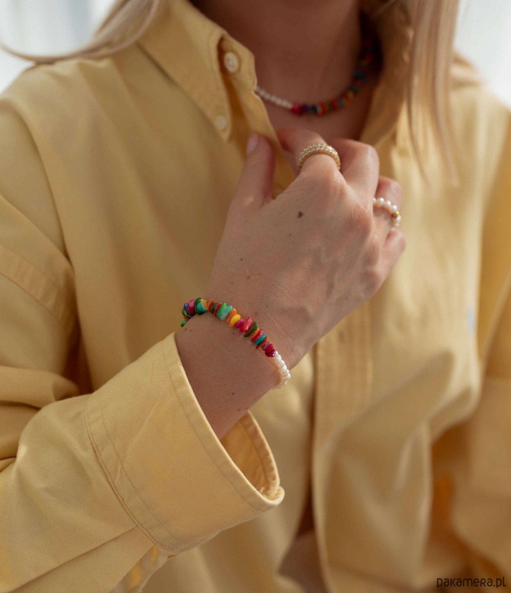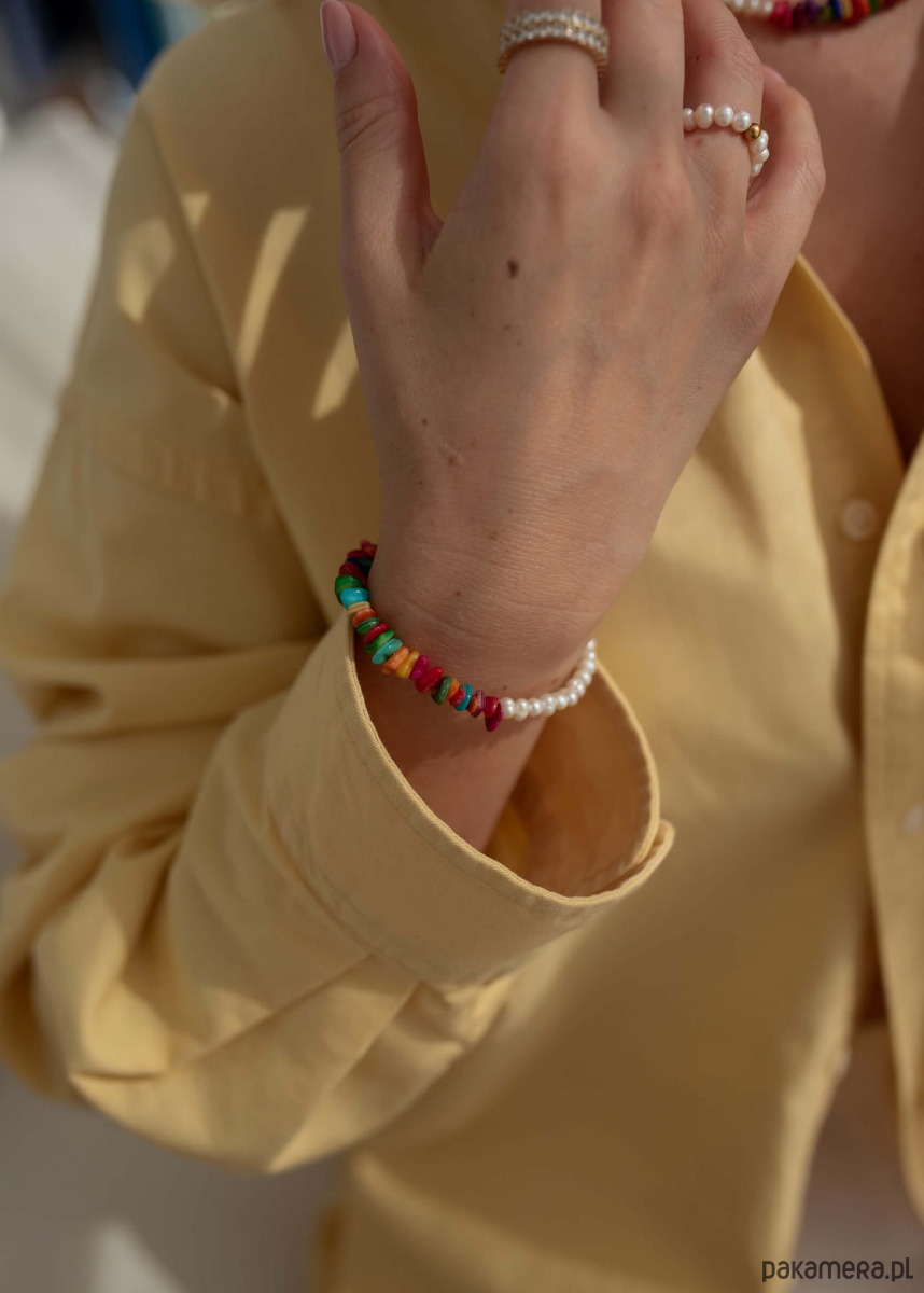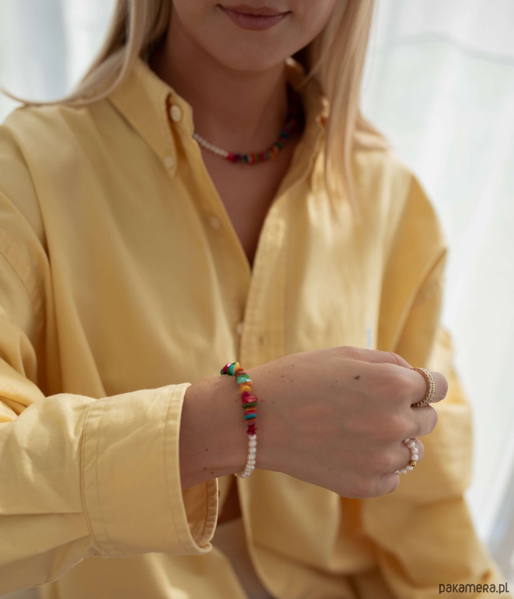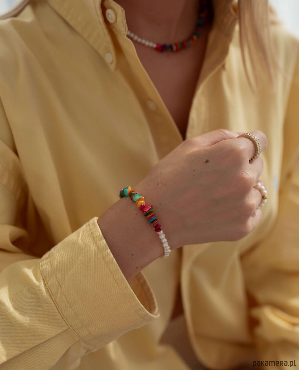 Masz dość biżuterii, która wygląda tak samo? Ta bransoletka to totalna odmiana od nudy! Połączenie klasycznych pereł słodkowodnych z kolorową masą perłową tworzy duet, obok którego nie da się przejść obojętnie. Każdy element został dobrany tak, by zachwycać lekkością, świeżością i dobrą energią - idealny dla kobiet, które kochają wyróżniać się z tłumu, ale nie rezygnują z elegancji.