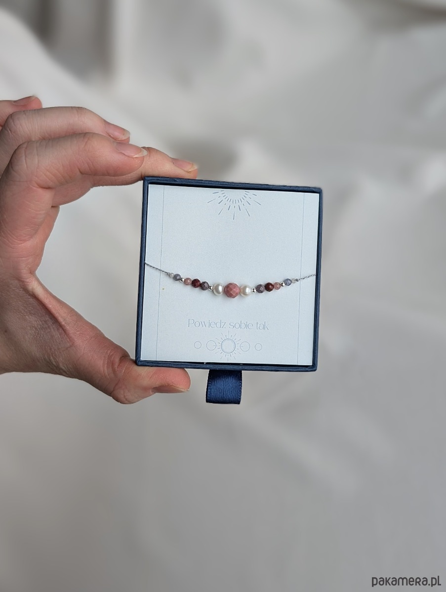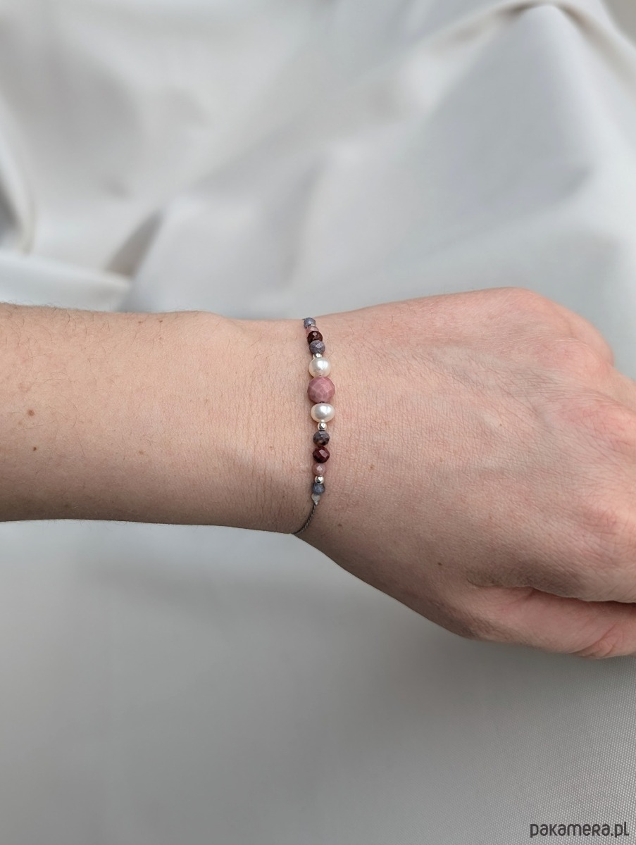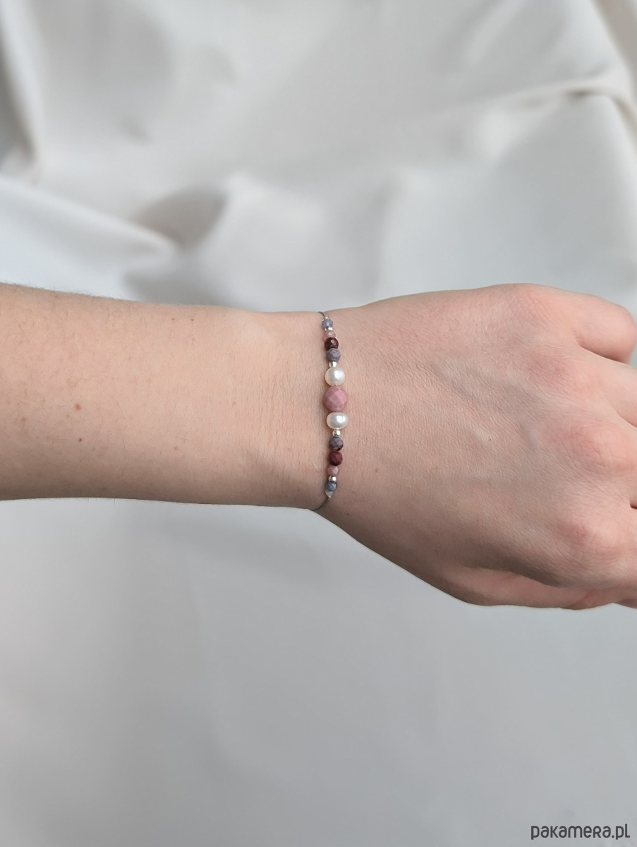 Wyjątkowa i unikalna bransoletka z kolorowych kamieni naturalnych, srebrnych przekładek oraz pereł słodkowodnych. W centrum różowy rodonit, po bokach kianity, granaty, turmaliny i kamienie księżycowe. Jedyna taka sztuka.