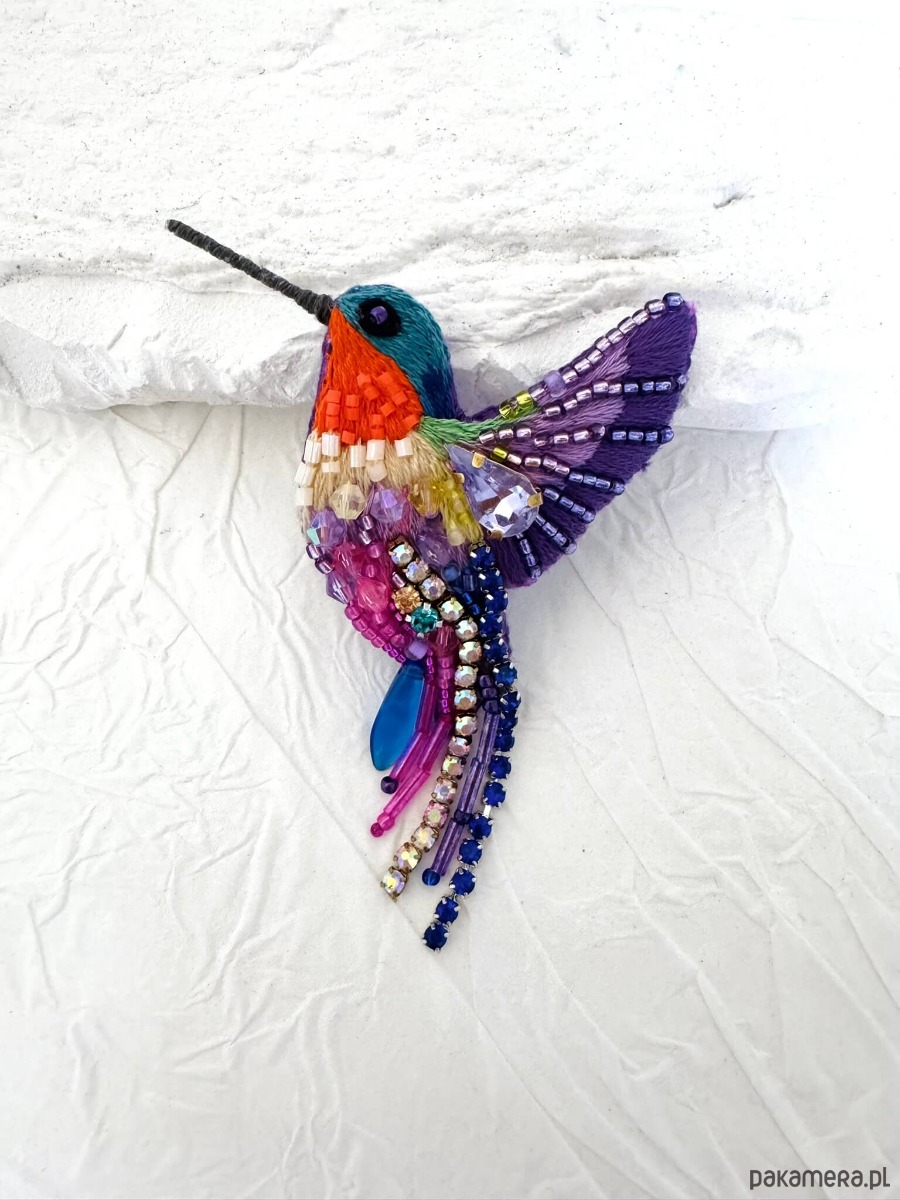 Ręcznie wykonana haftem broszka w kształcie kolibra to małe dzieło sztuki biżuteryjnej.