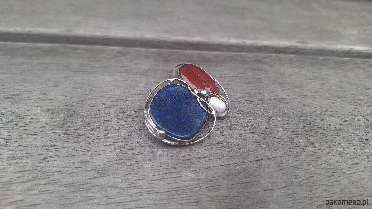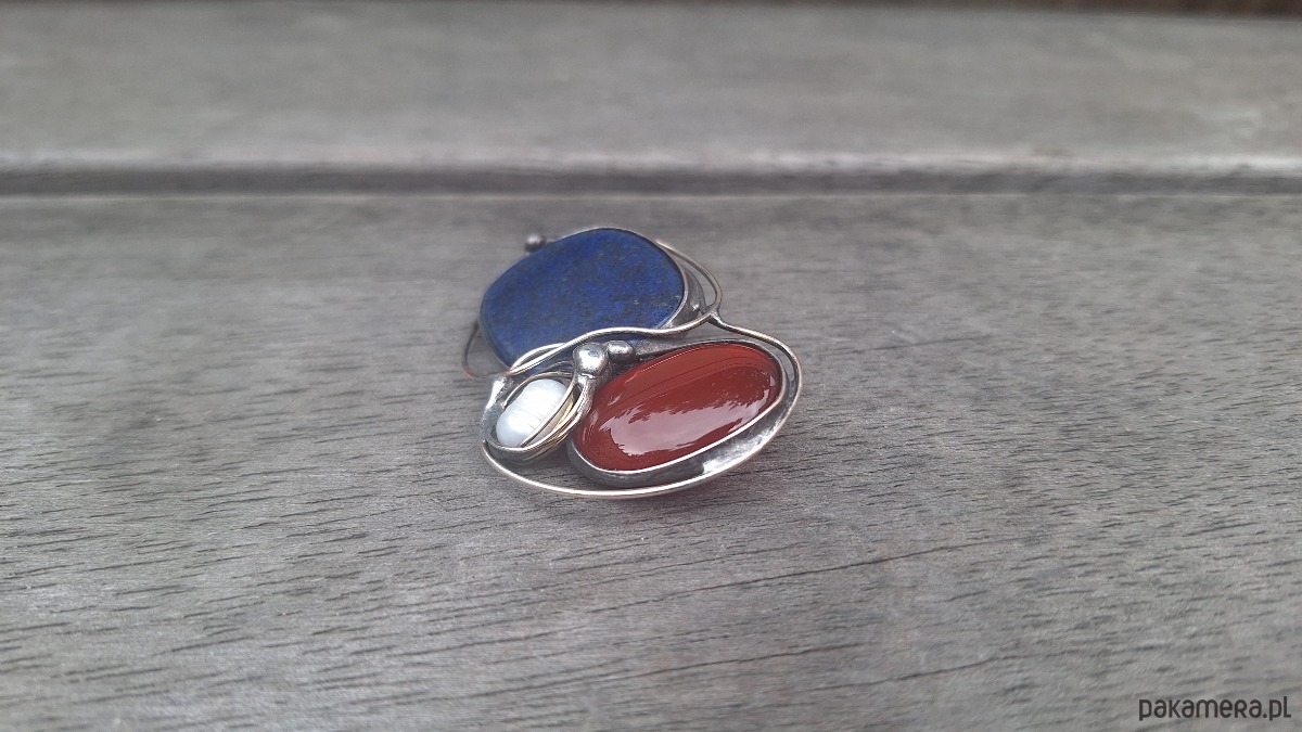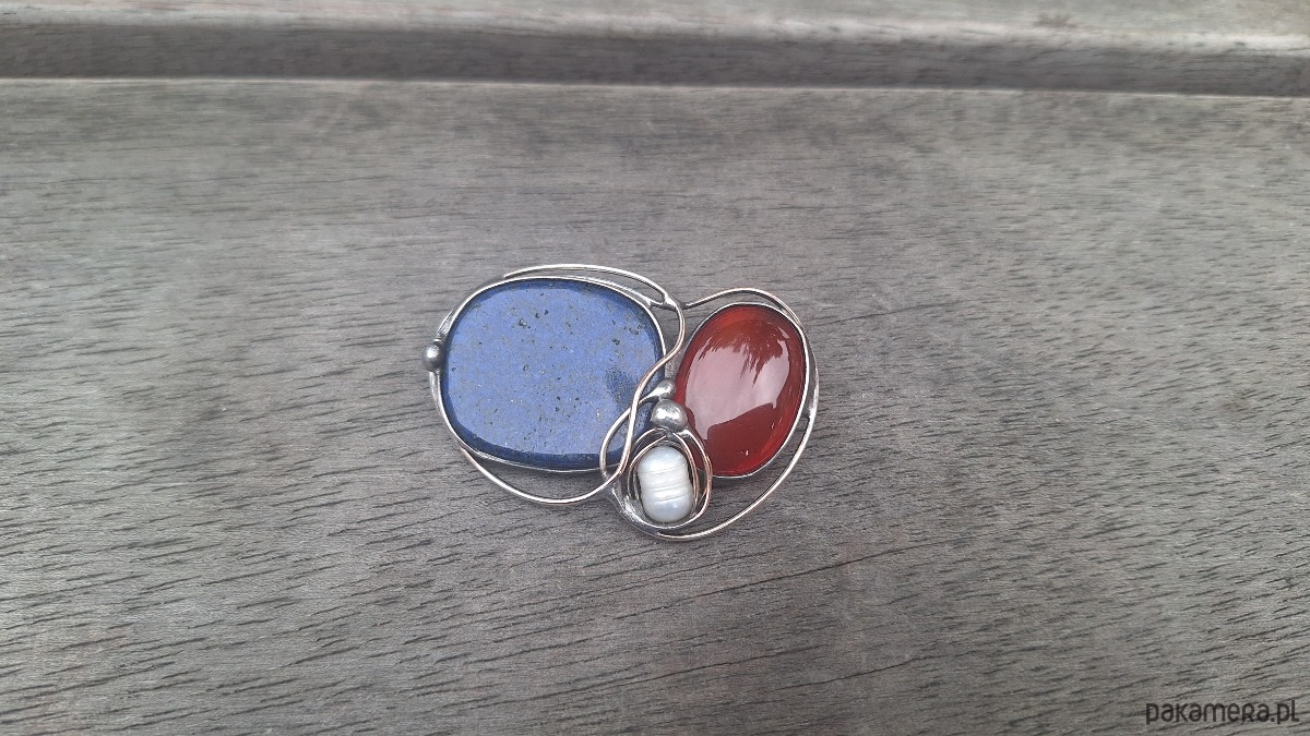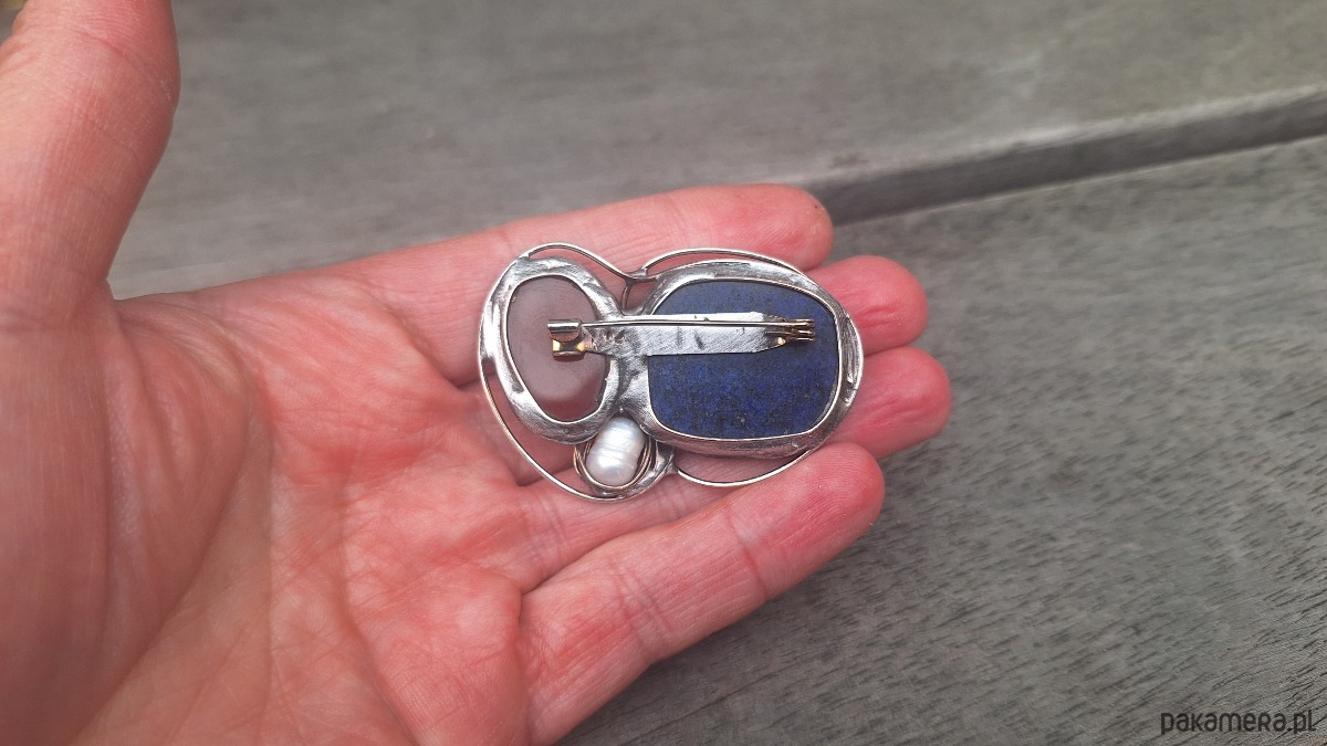 Broszka wykonana z miedzi, cyny, pereł, lapisu i agatu. Wymiary ok. 5 na 3 m. Zapięcie metalowe.