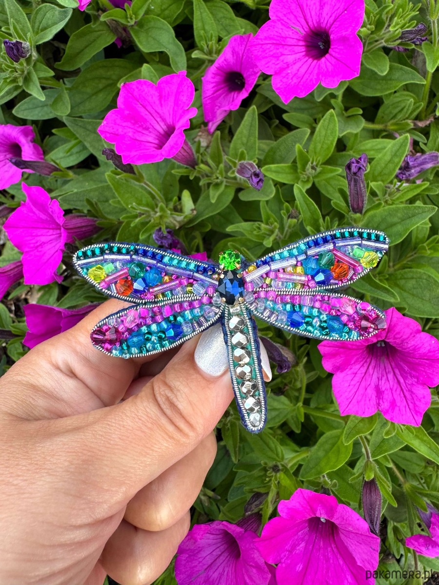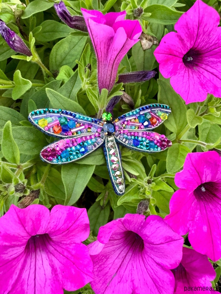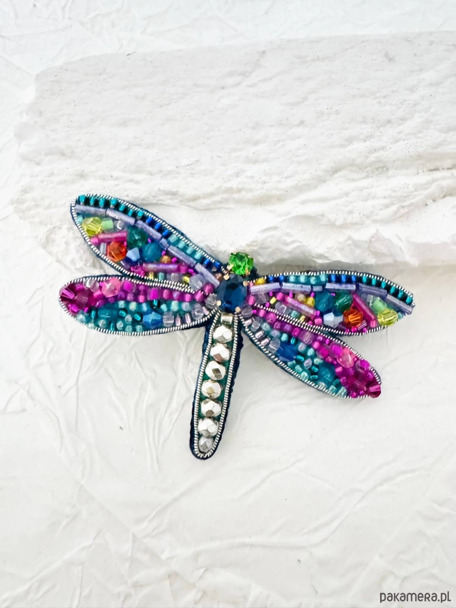 Wyjątkowa broszka w kształcie ważki, która zachwyca bogactwem kolorów i detali. Wykonana z precyzyjnie dobranych koralików i kryształków, tworzy efekt mieniącej się mozaiki, zmieniającej odcień w zależności od światła.