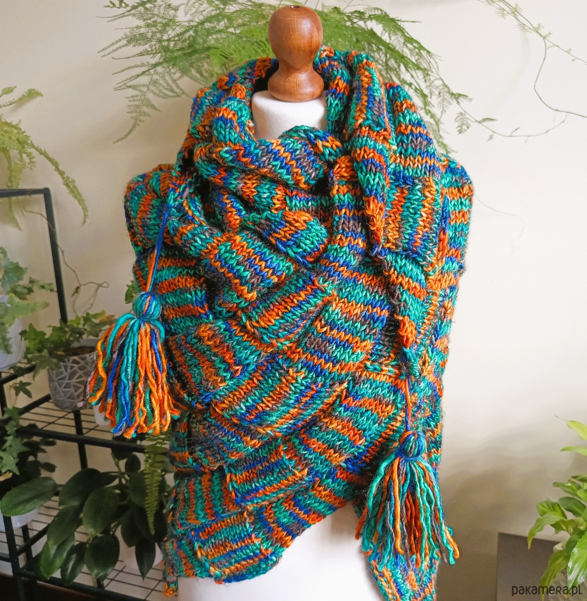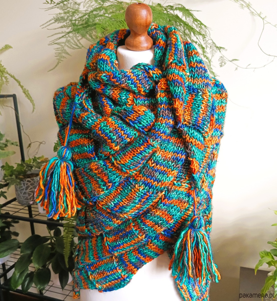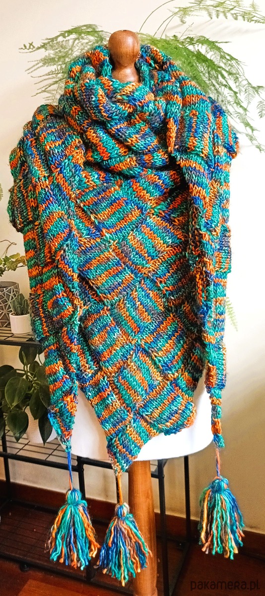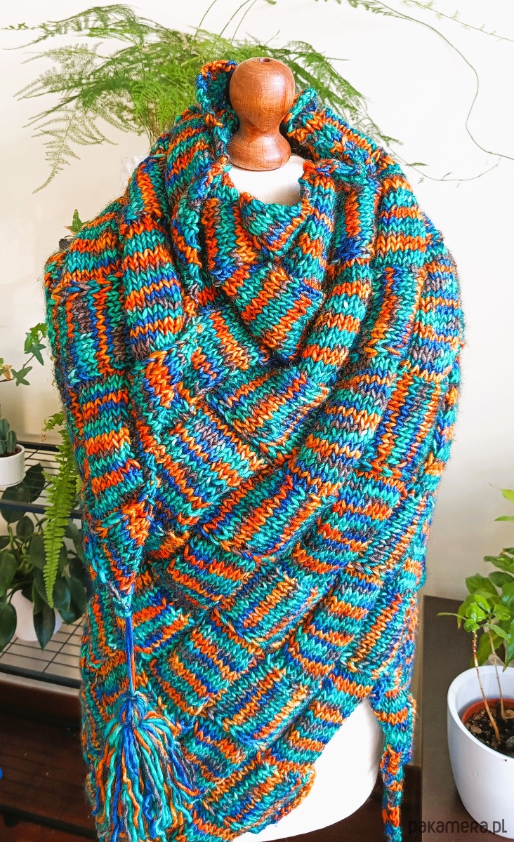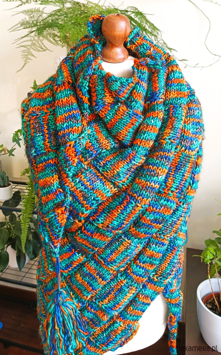 To moja ulubiona chusta. Świetnie się ją dziergało. Wygląda pięknie. Wzór podkreśla żywe kolory. Włóczka jest miękka i niegryząca.
