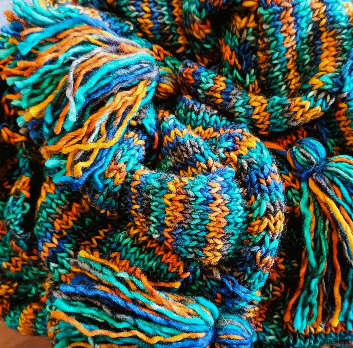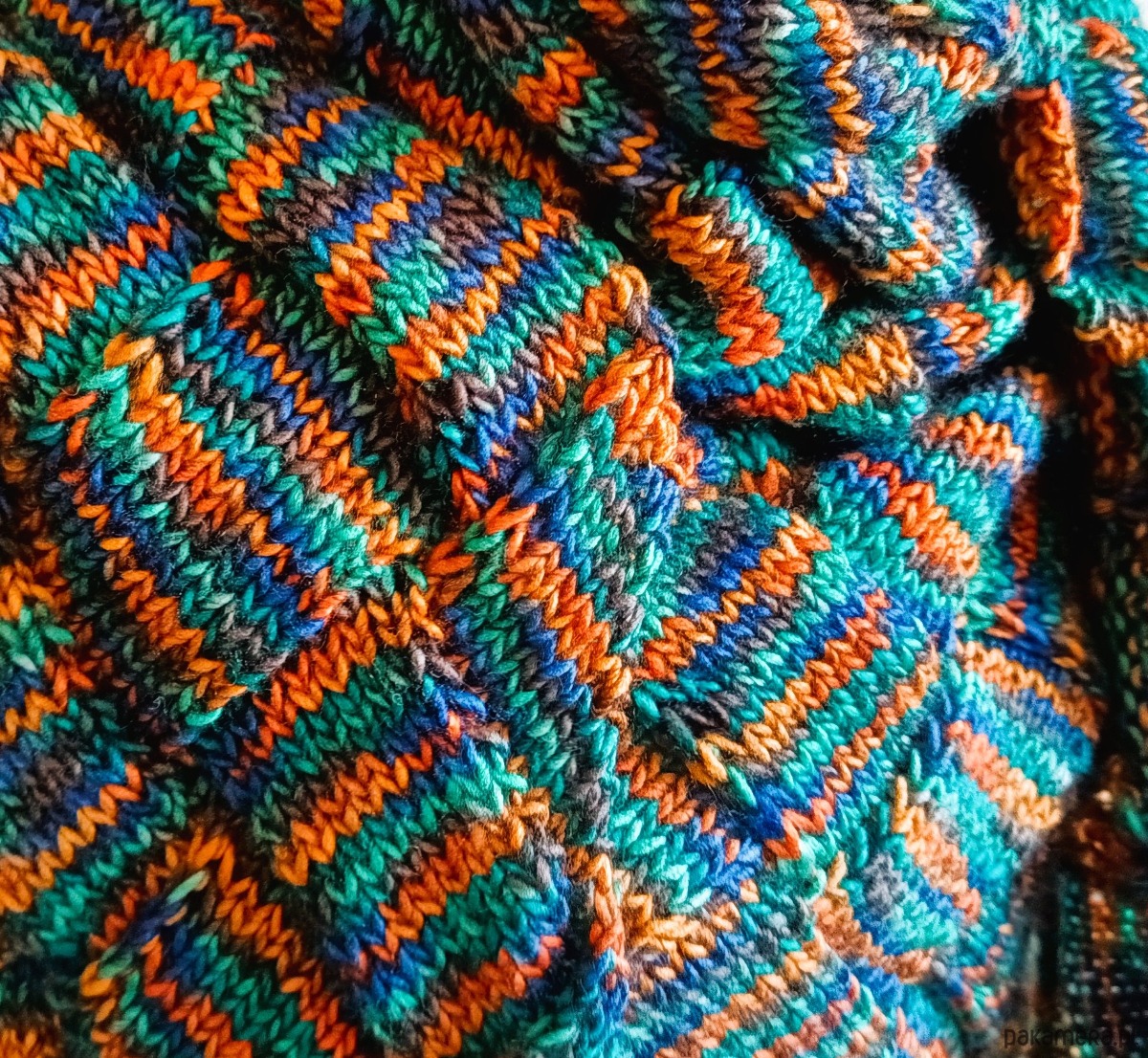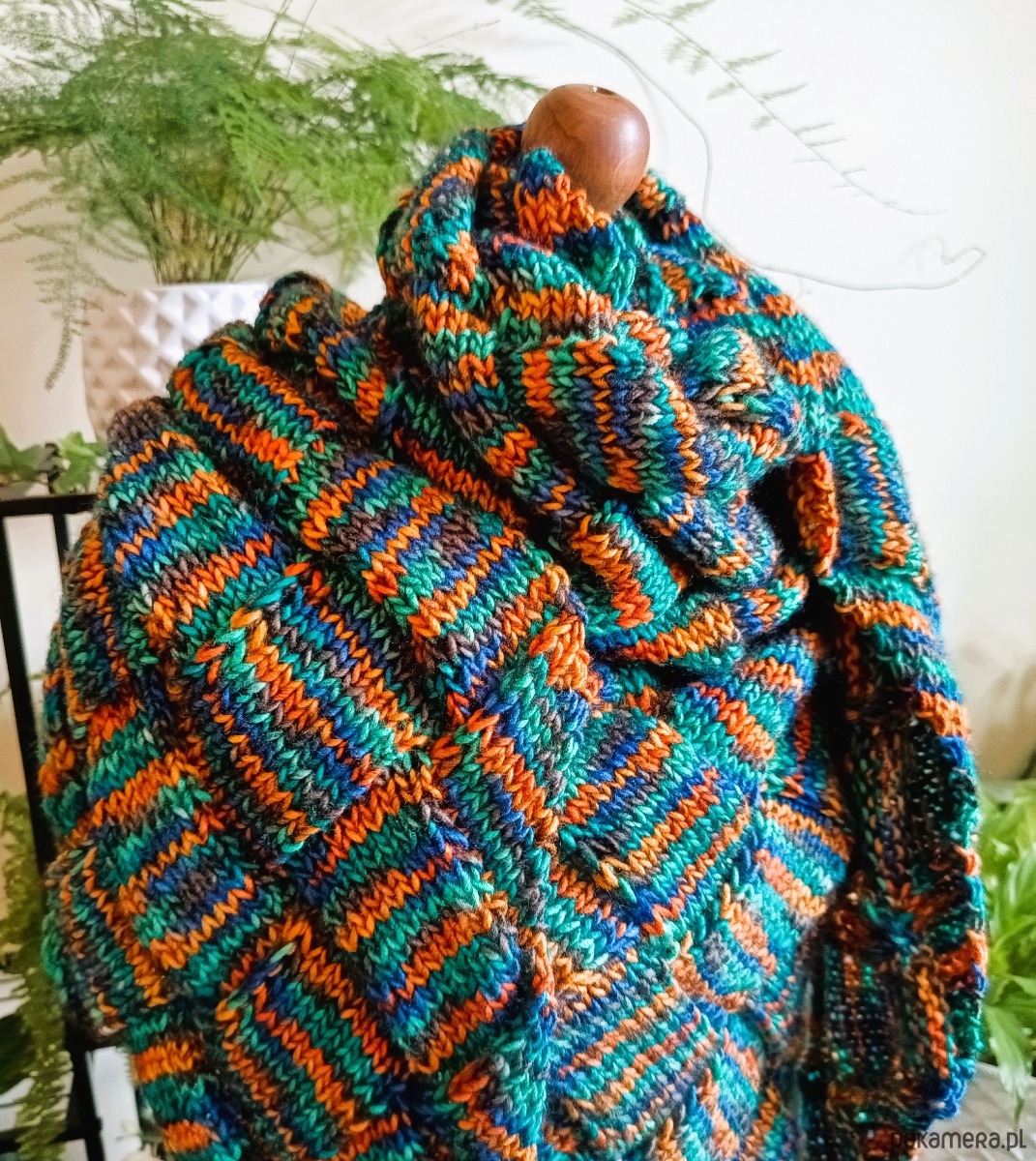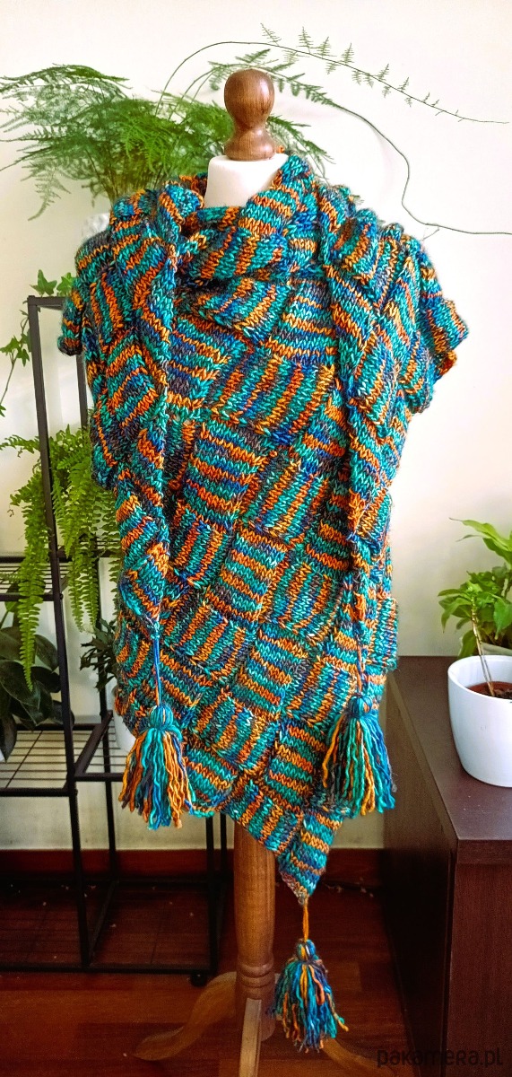 To moja ulubiona chusta. Świetnie się ją dziergało. Wygląda pięknie. Wzór podkreśla żywe kolory. Włóczka jest miękka i niegryząca.