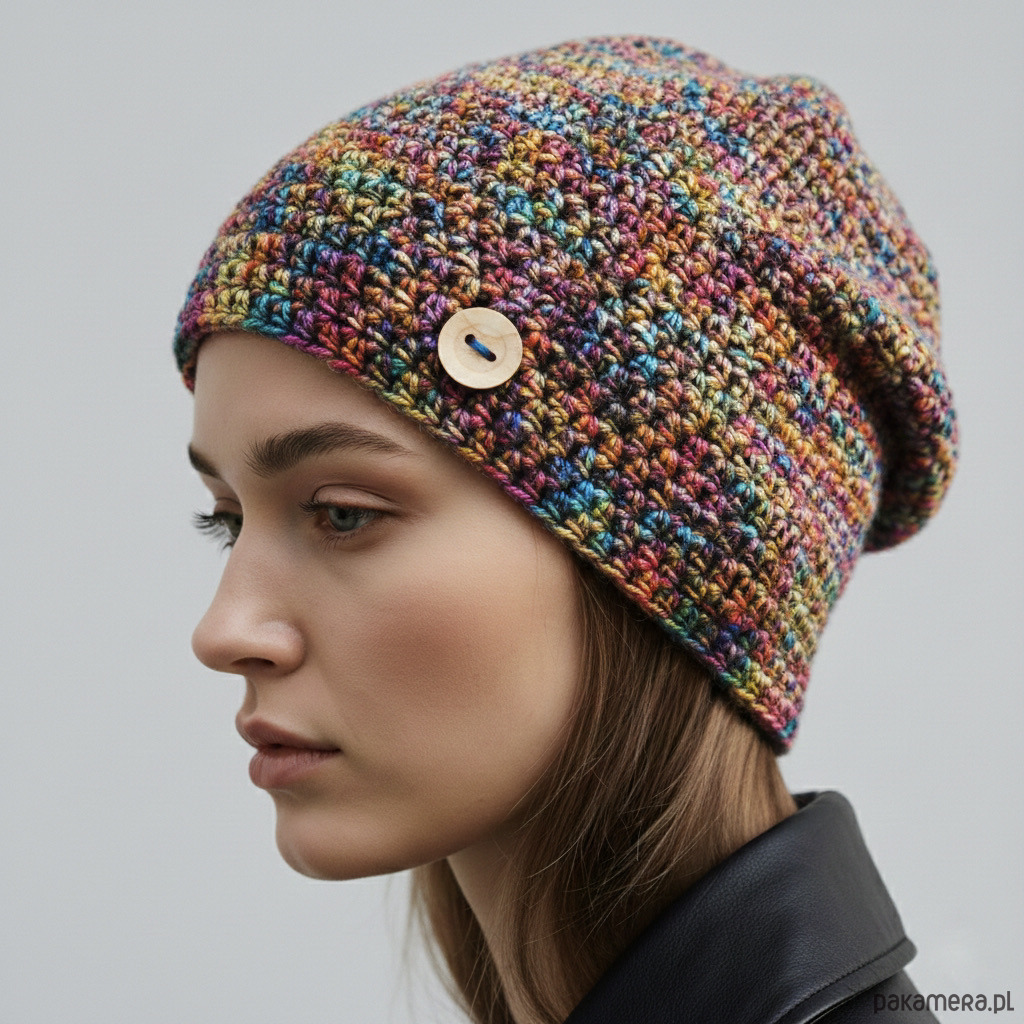 Czapkę wykonałam z wysokiej jakości włóczki bawełniano-akrylowej, która zapewnia wygodę noszenia przez cały dzień.