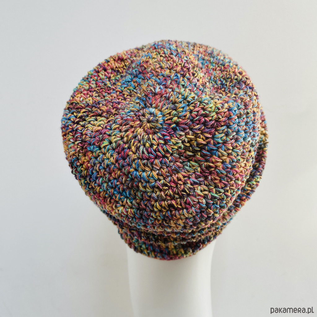 Czapkę wykonałam z wysokiej jakości włóczki bawełniano-akrylowej, która zapewnia wygodę noszenia przez cały dzień.