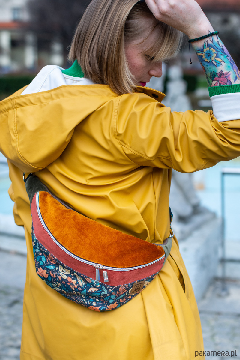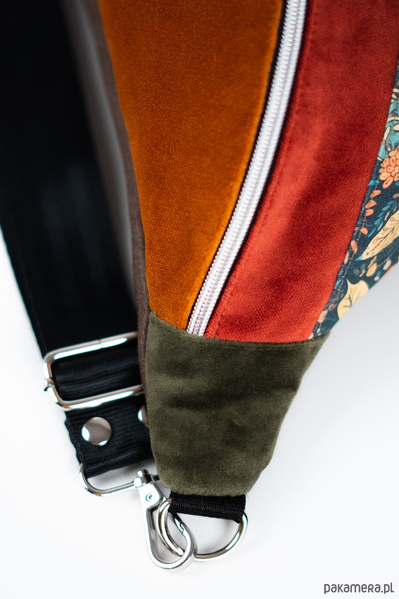MATERIAŁ: gabardyna, tkanina tapicerska welurowa, podszewka bawełniana, pas samoch.25 mm.