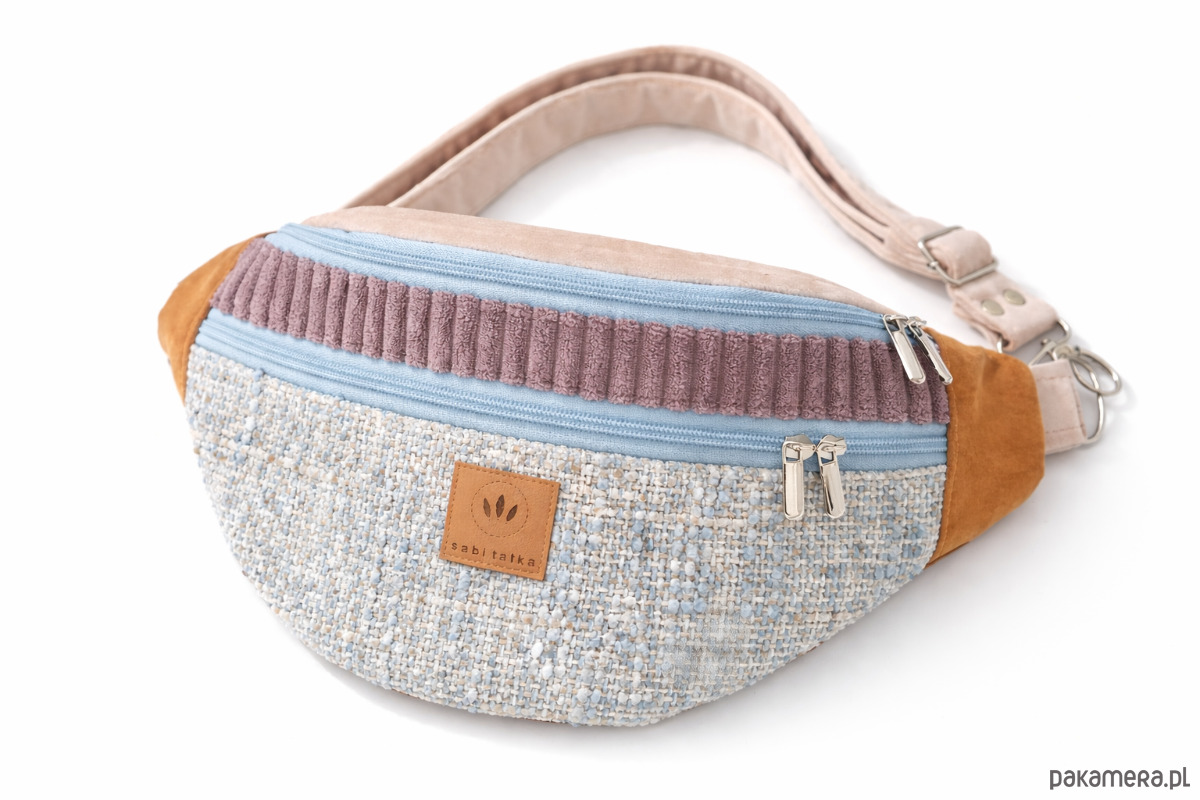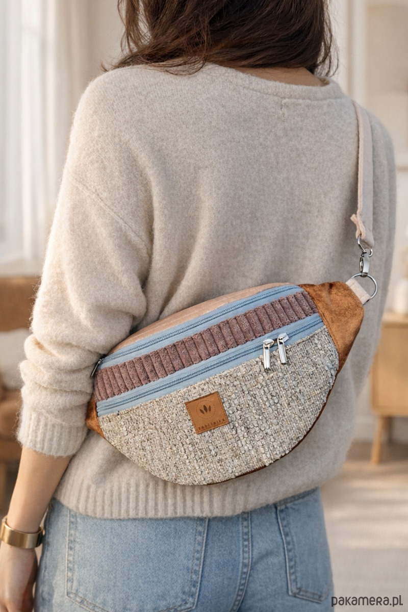 Bardzo duża nerka torebka damska z łączonych materiałów.