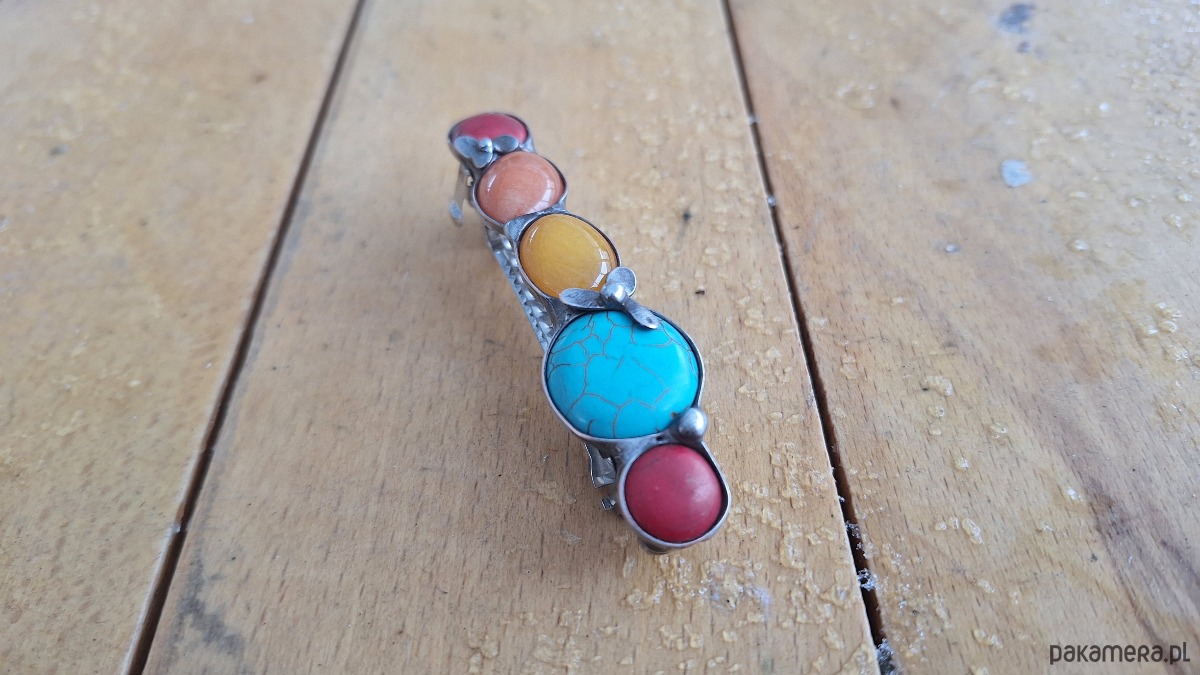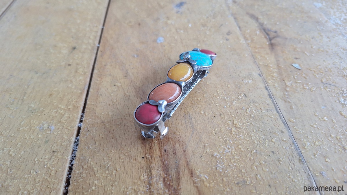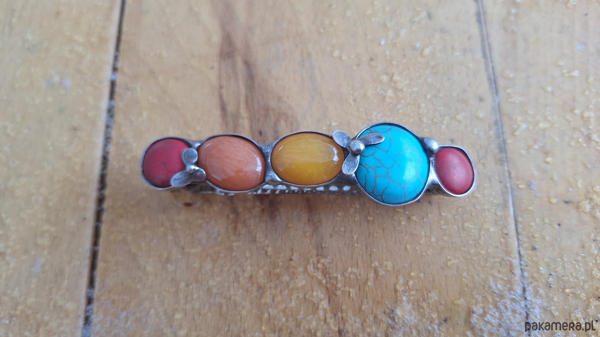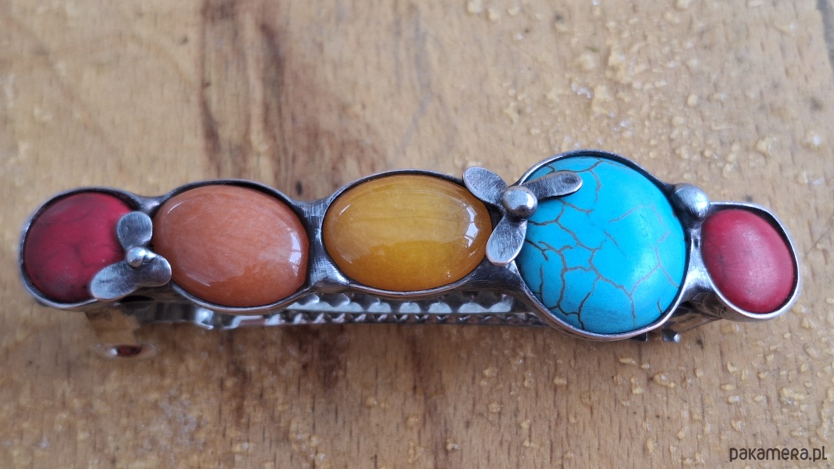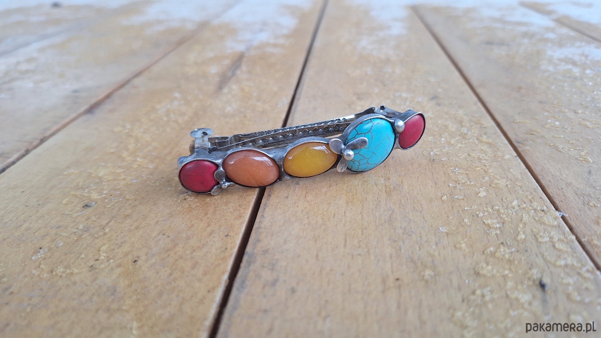 Klamra do włosów, wykonana z miedzi, cyny, jadeitów i howlitów. Wymiary ok. 8 na 2 cm. Zapięcie 6 cm, metalowe.