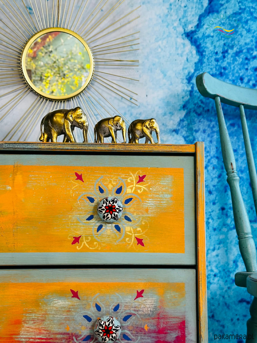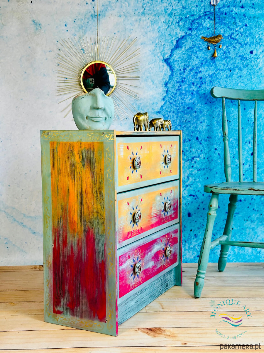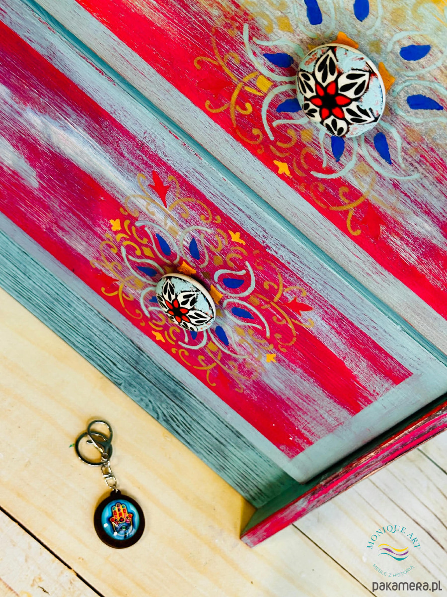 Kolorowa komoda w orientalnym klimacie, trzy szuflady, ceramiczne gałki
