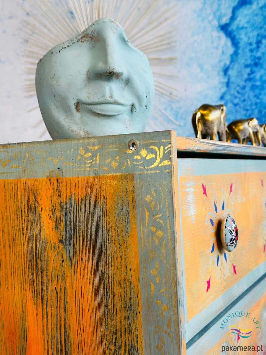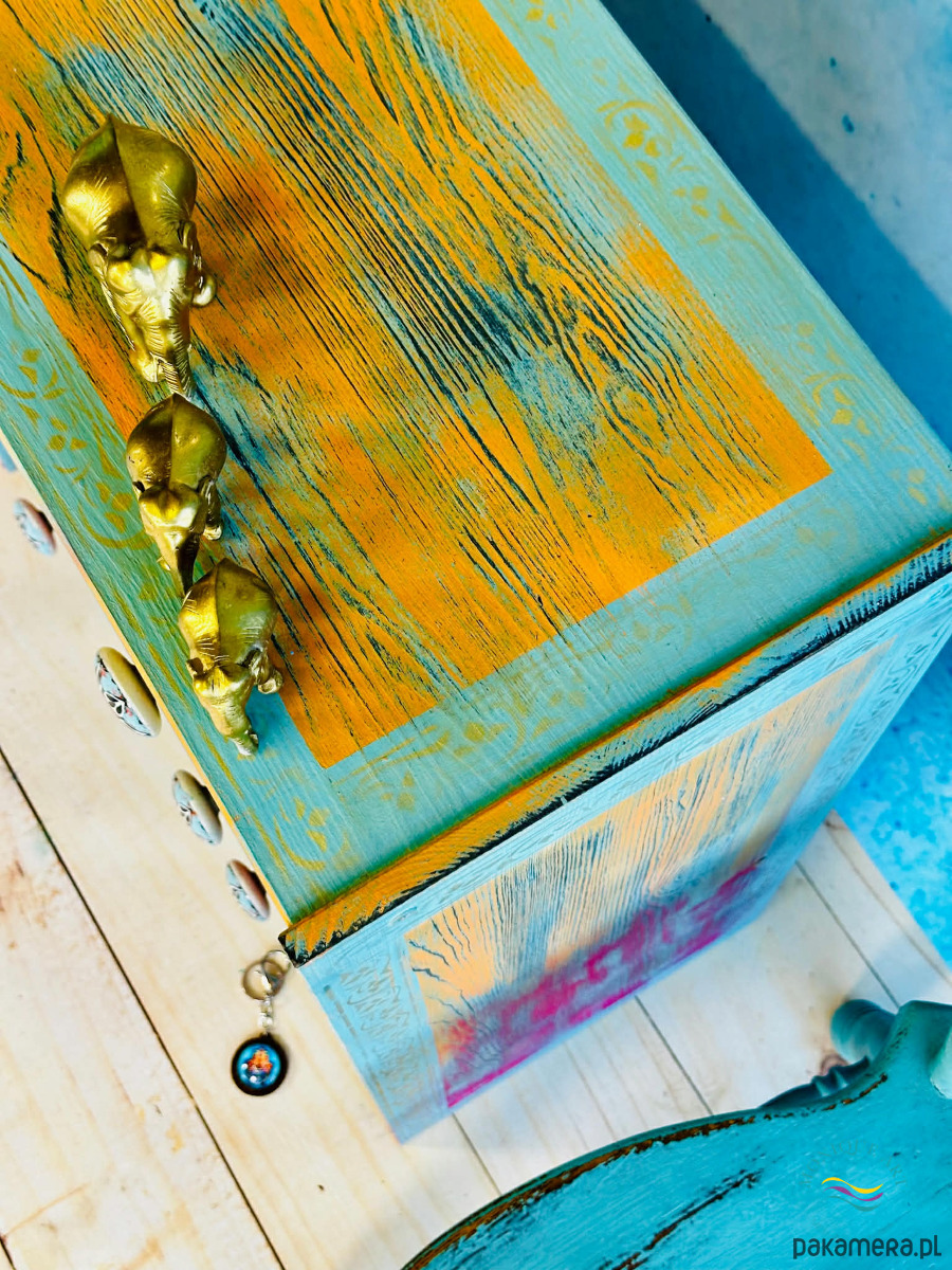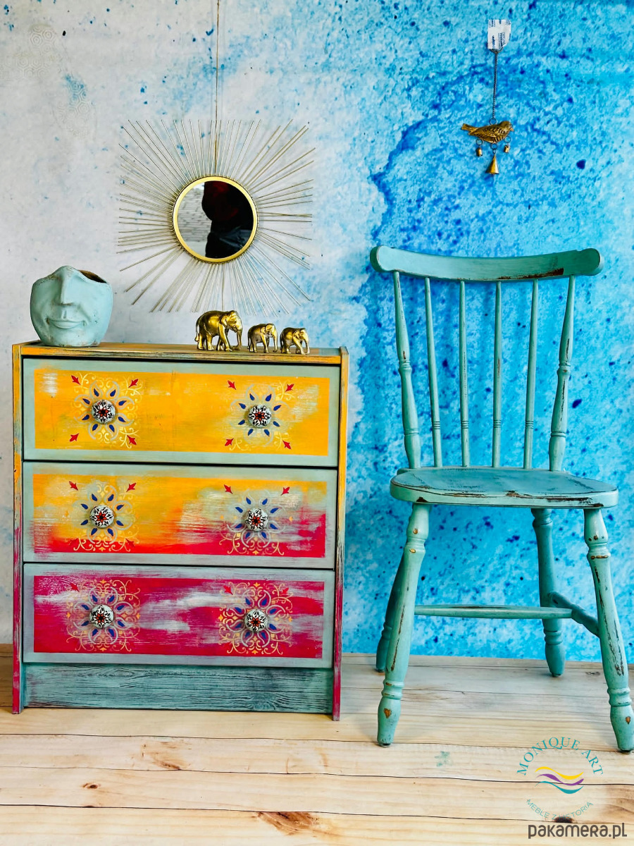 Kolorowa komoda w orientalnym klimacie, trzy szuflady, ceramiczne gałki