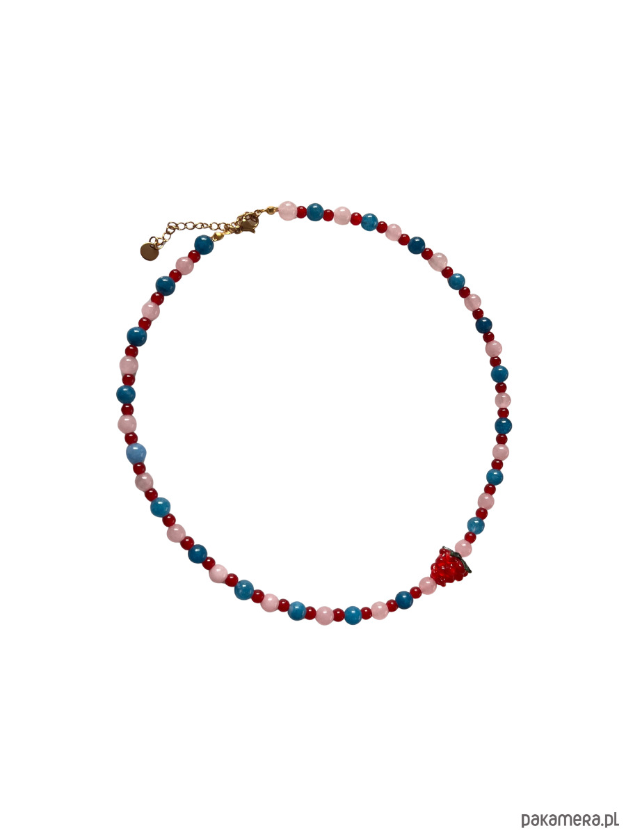 Naszyjnik z naturalnych kamieni w odcieniach różowego, przeplatanych czerwonymi koralikami oraz niebieskim jadeitem.