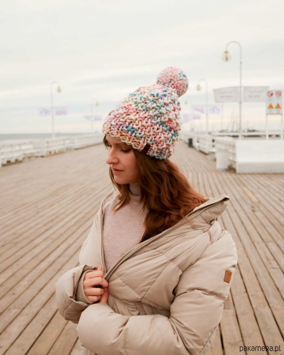 Czapka z miękkiej, grubej, owczej wełny peruwiańskiej to produkt wykonany na drutach z ręcznie farbowanej wełny peruwiańskiej. Czapka jest w kolorze pastelowego różu nakrapianego w różnorodne pastelowe kolory. Tworzy kolorowy komplet z kominem Rainbow.