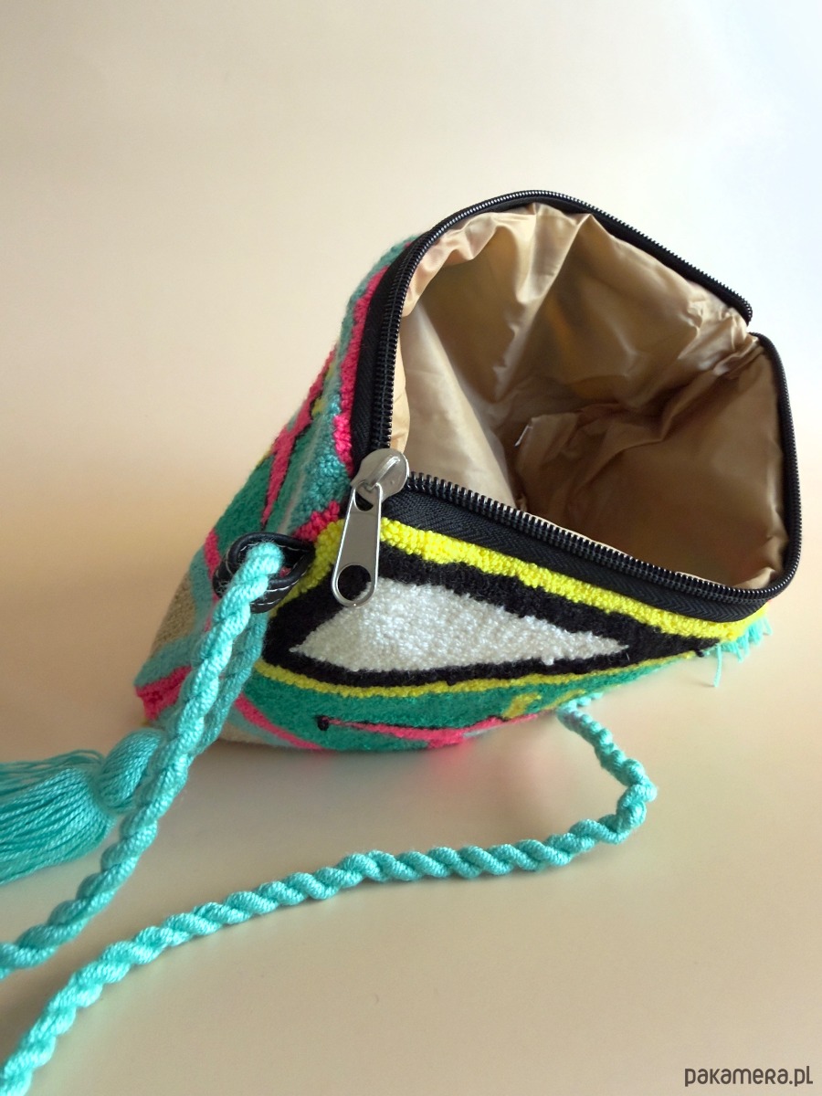 Posiada długi pasek, można nosić ją na ramieniu lub na skos. Zapinana na zamek, w środku podszewka. Sprawdzi się jako lekka torebka na najpotrzebniejsze rzeczy i kolorowy akcent stylizacji.