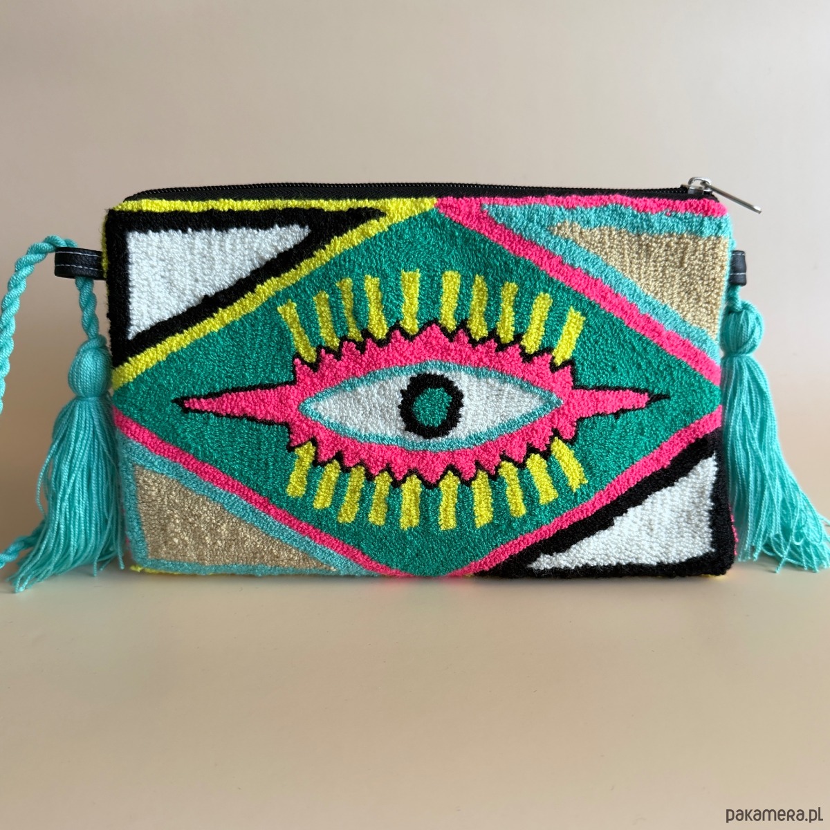 Mała torebka w stylu boho wykonana techniką punch needle, z wyrazistym motywem oka (po obu stronach ten sam) i dekoracyjnymi frędzlami po bokach.