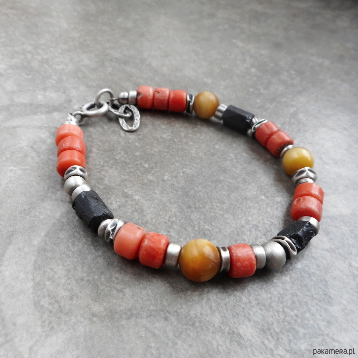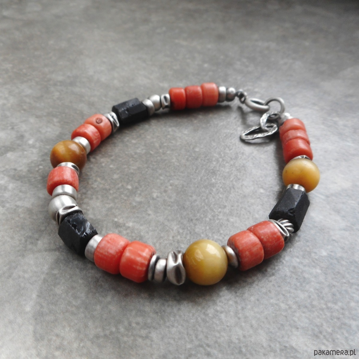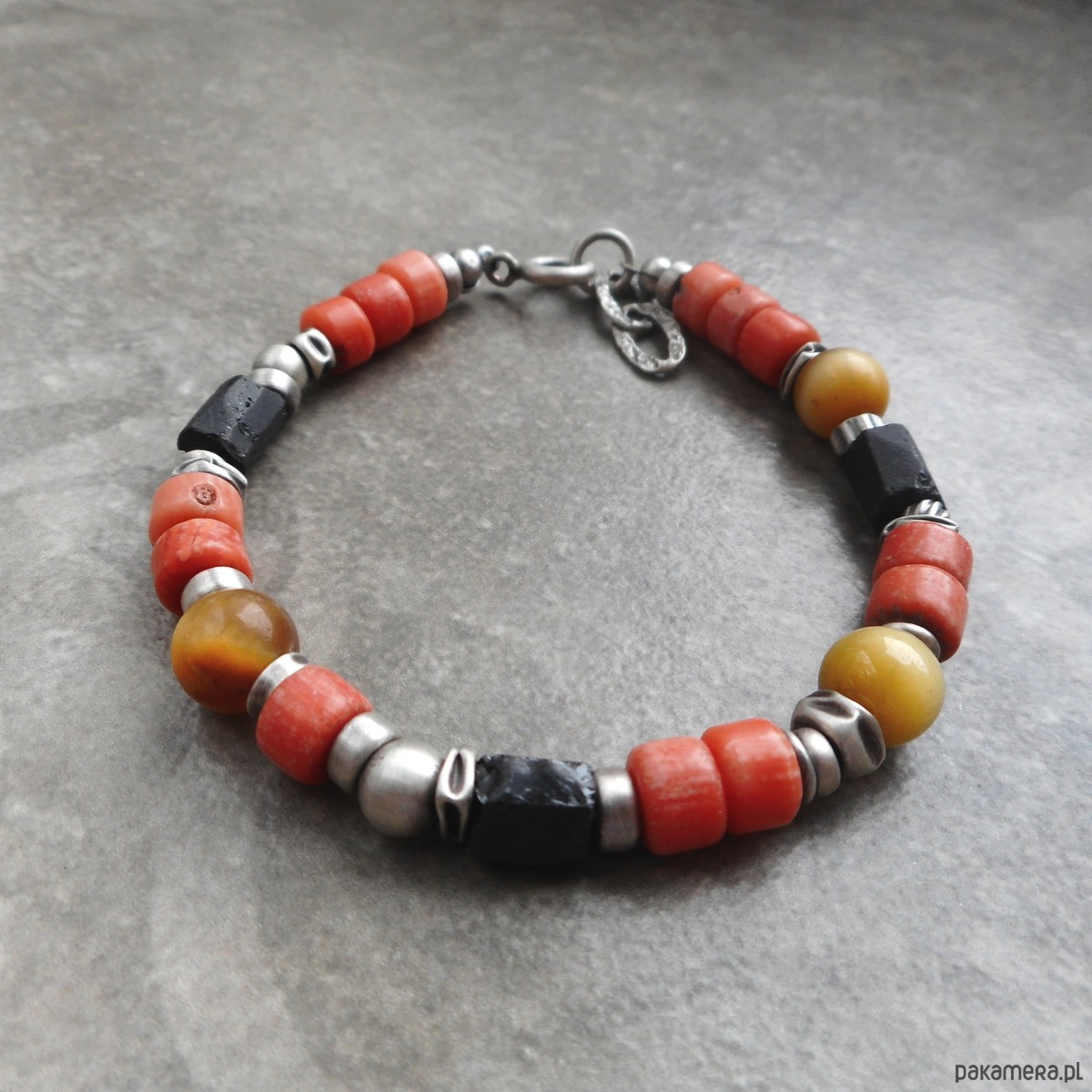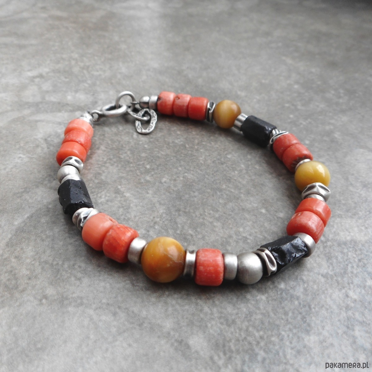 Wyjątkowa bransoletka z kamieni naturalnych i szlachetnego srebra; klasyczna i efektowna, w której kolorowe kamienie poprzeplatane są surowymi, srebrnymi przekładkami.