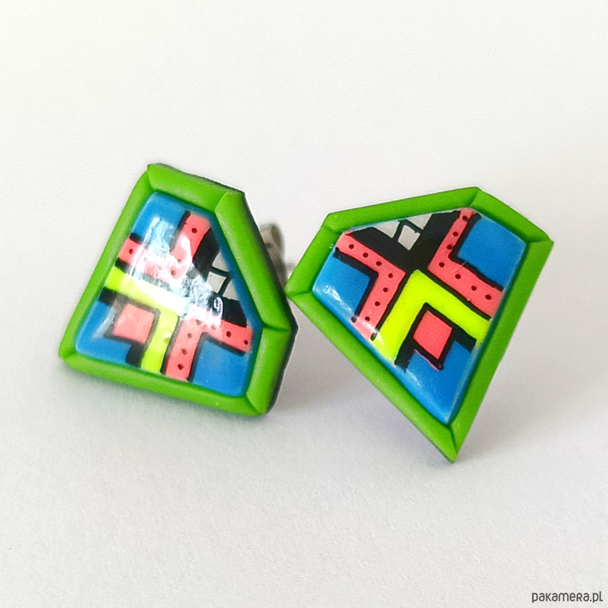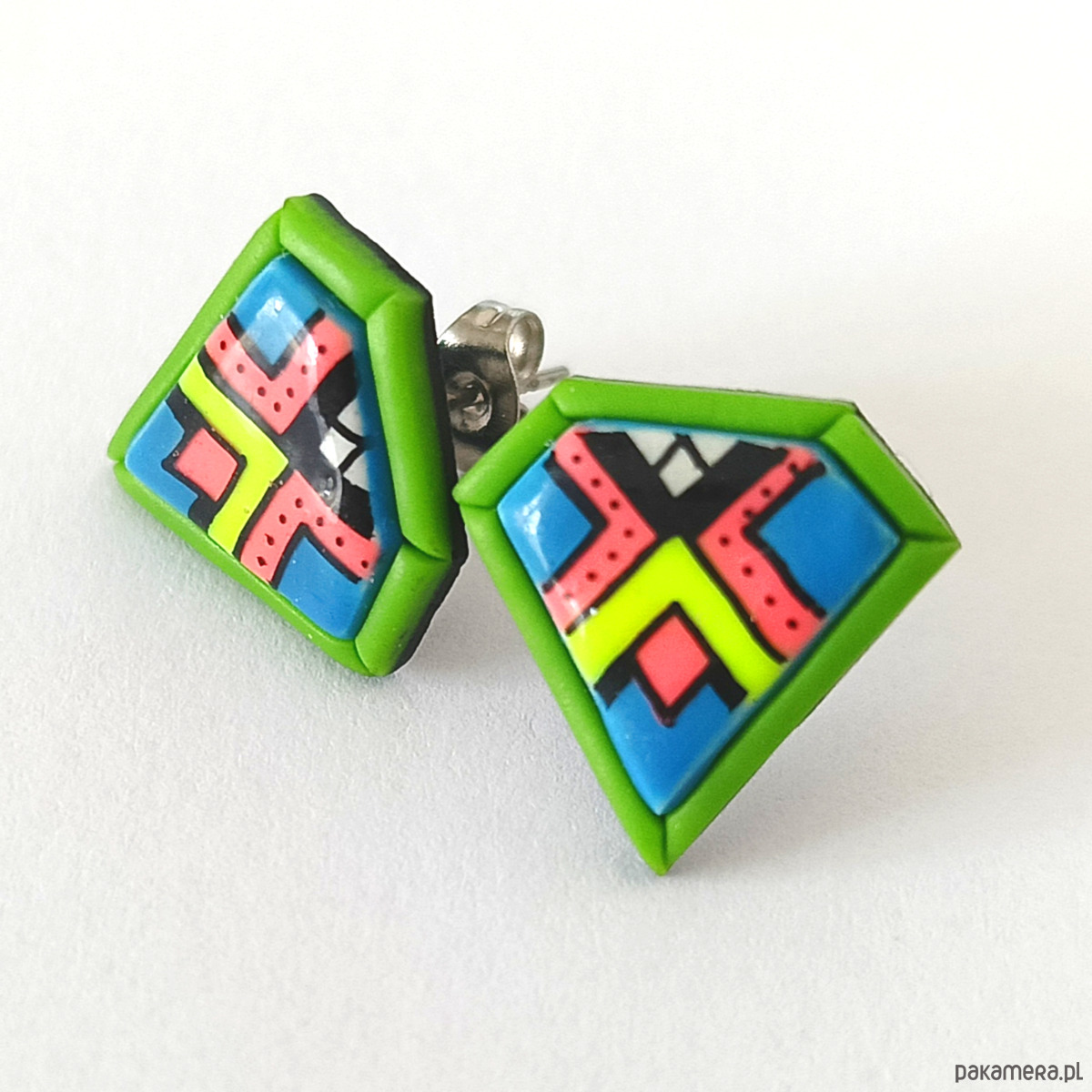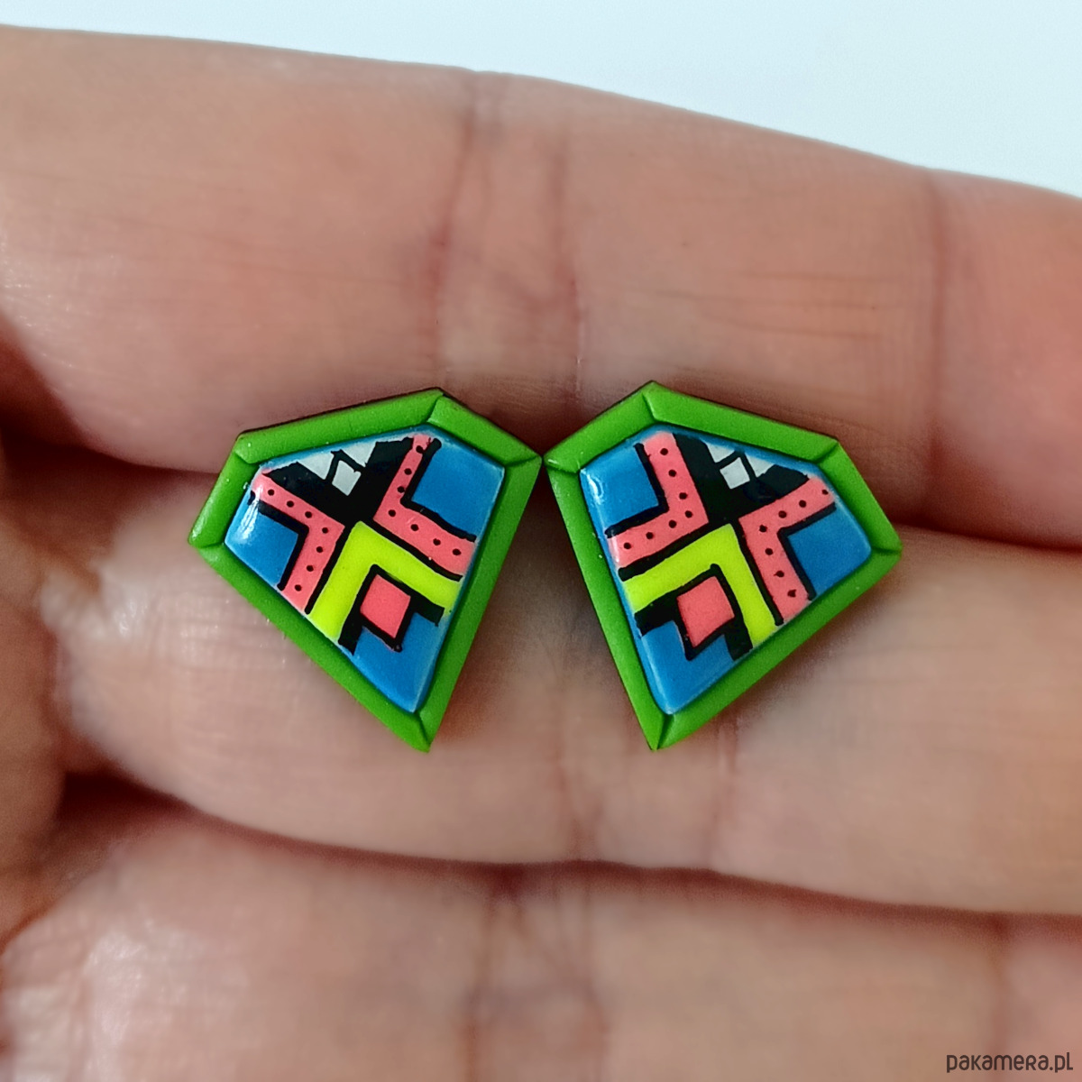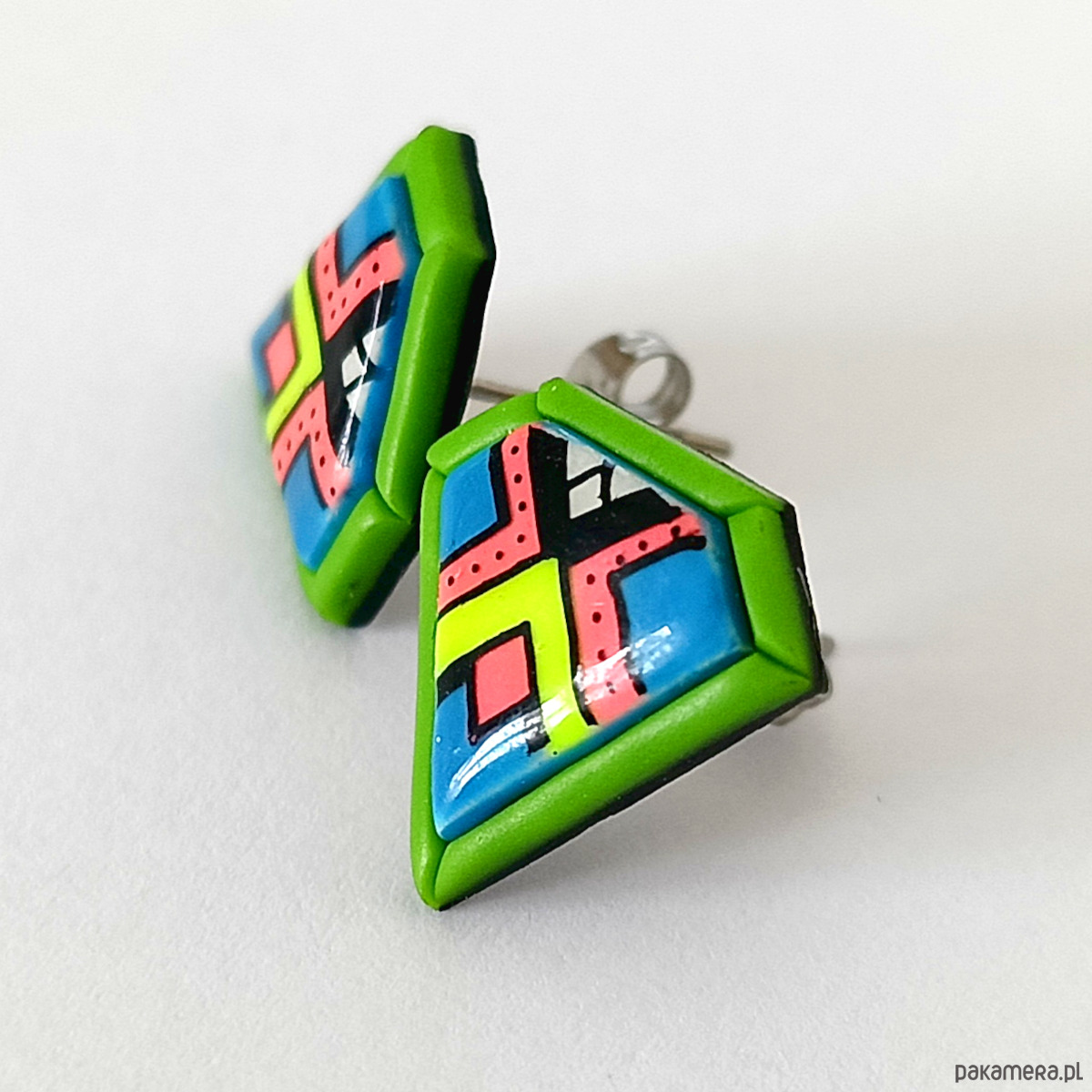 Wyraziste kolczyki w stylu etno z geometrycznym wzorem inspirowanym latami 80. Ręcznie wykonane z modeliny, lekkie i bardzo wygodne w noszeniu. Ich żywe kolory i oryginalna forma sprawdzą się idealnie jako dodatek do artystycznych i codziennych stylizacji.