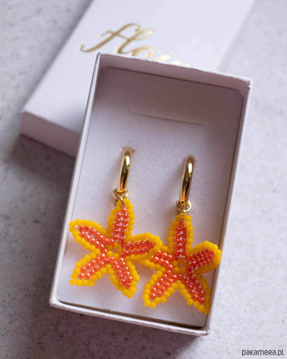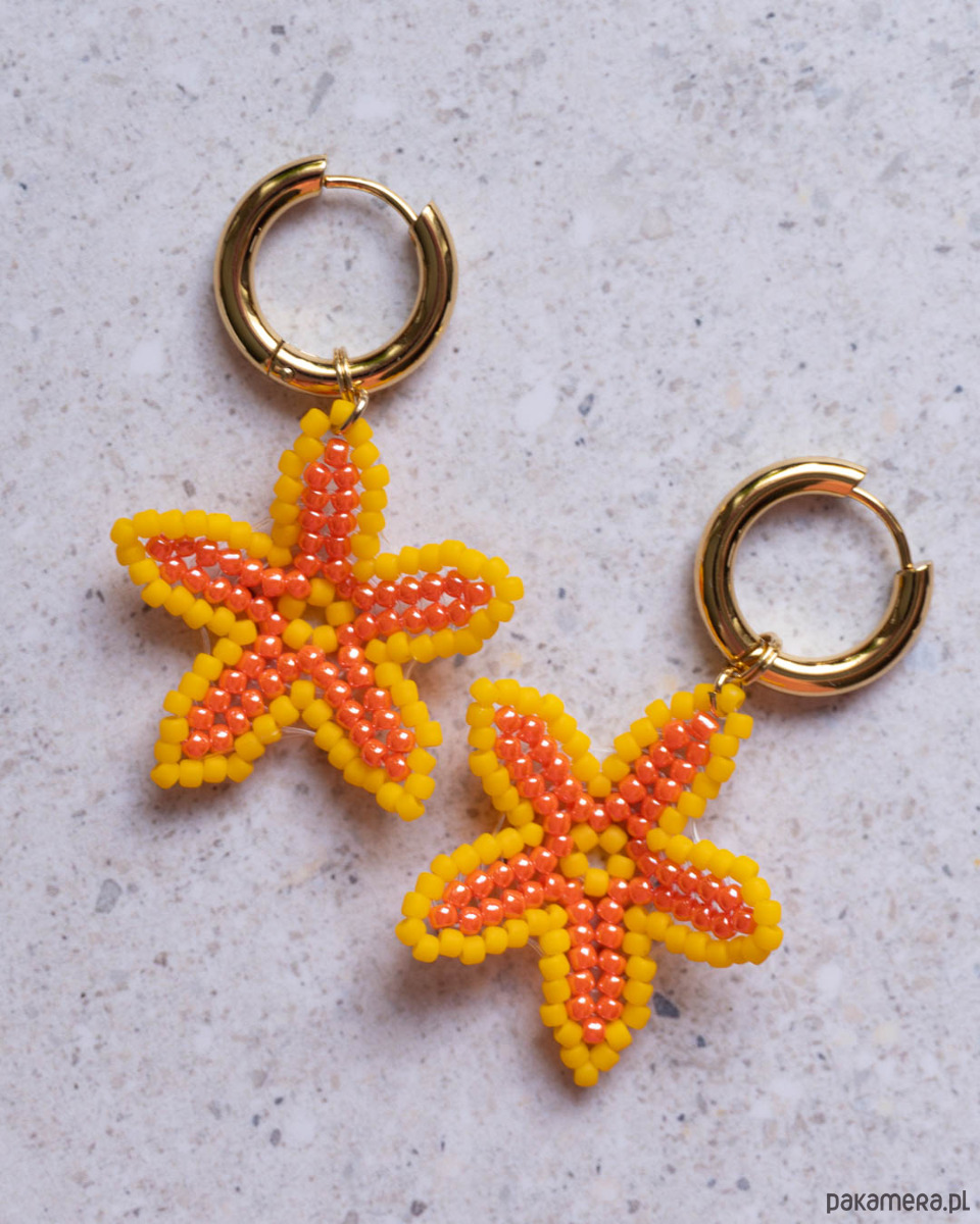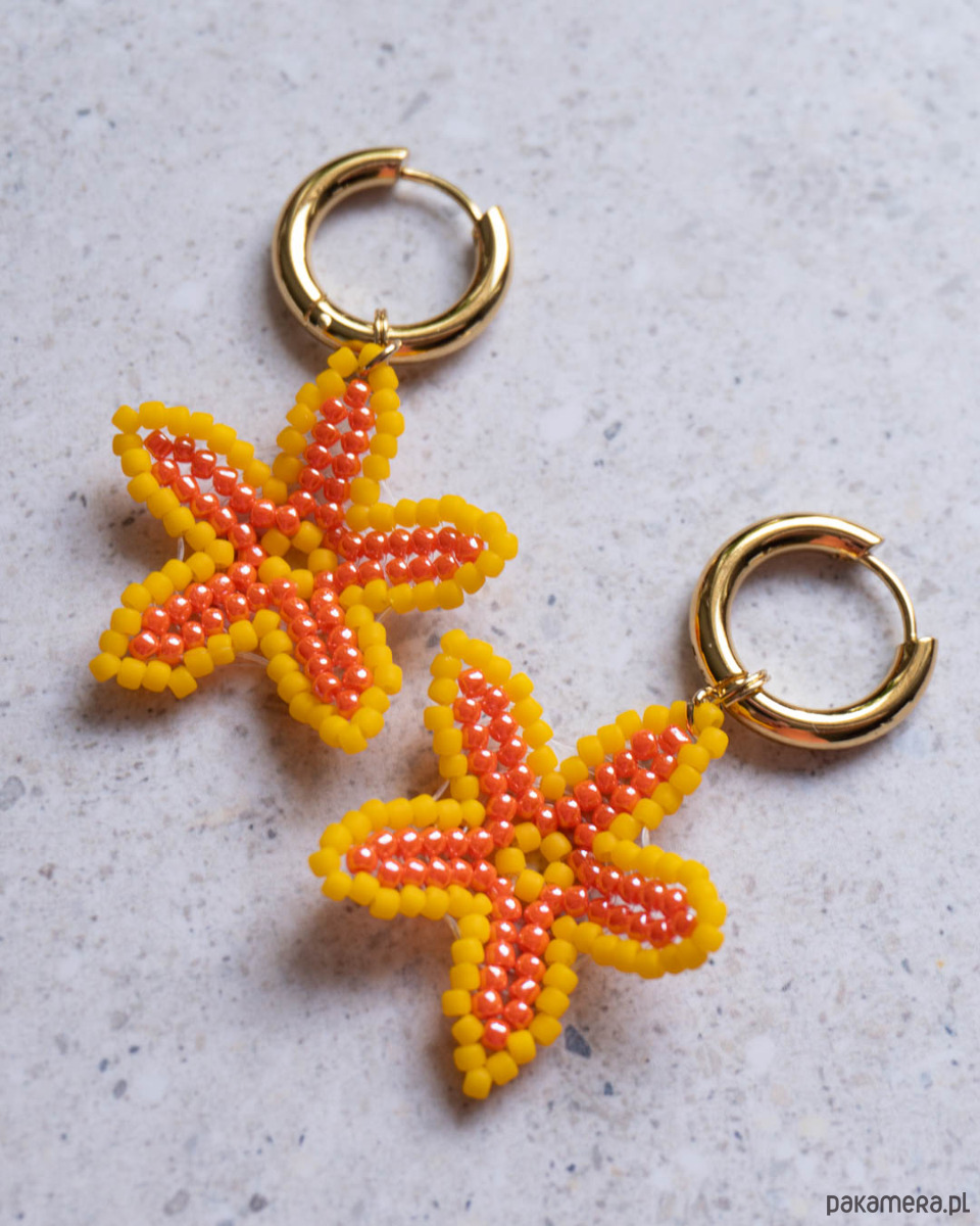 Ręcznie wyplatane kolczyki kwiatki ze szklanych japońskich koralików TOHO, bazy kolczyków wykonane są ze stali chirurgicznej w kolorze złotym.