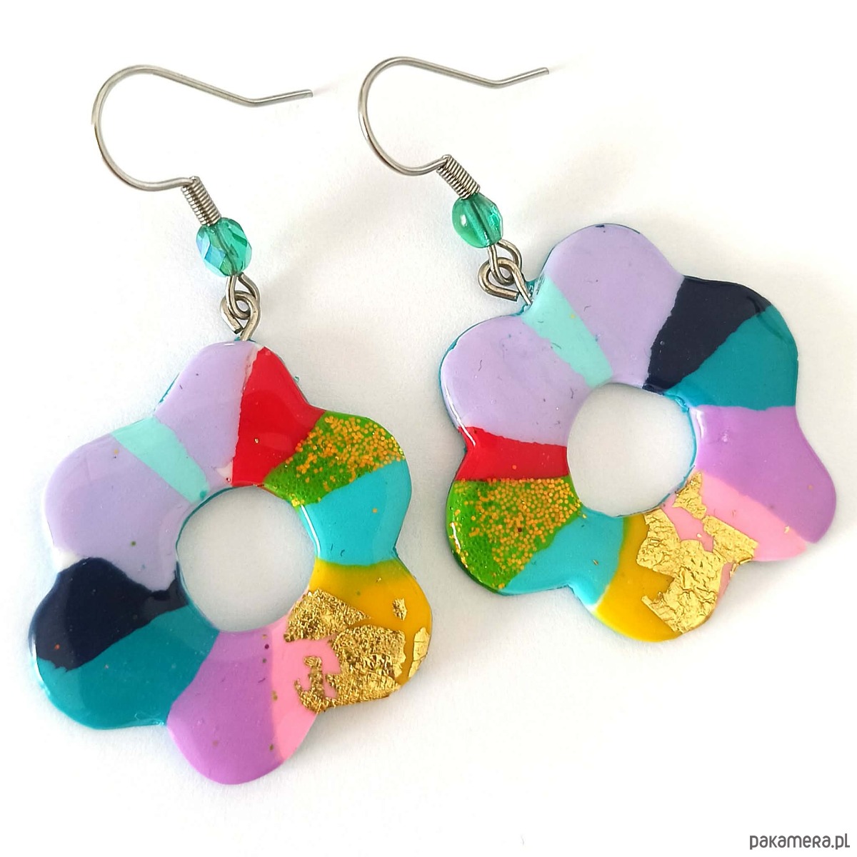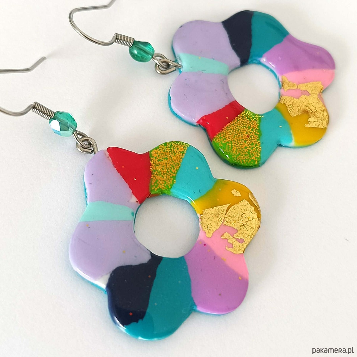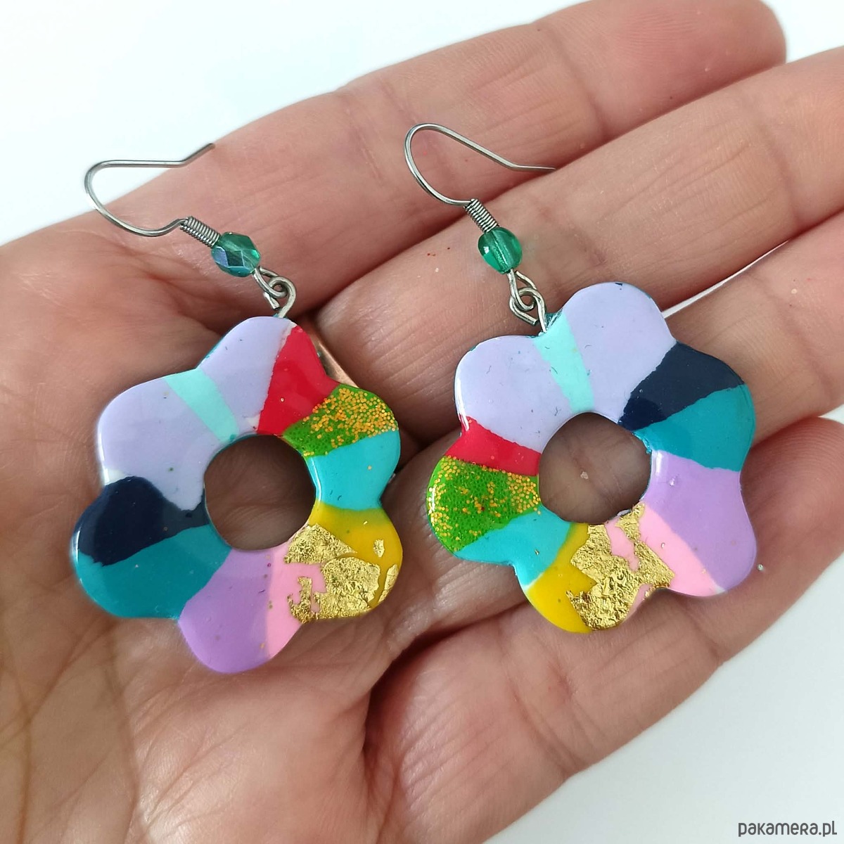 Wyraziste, ręcznie robione kolczyki w kształcie kwiatów, wykonane z lekkiej gliny polimerowej. Każda para to unikatowa kompozycja intensywnych kolorów, przełamana subtelnymi zdobieniami ze złotego płatka.