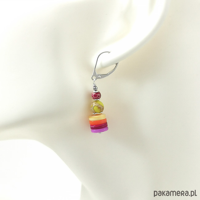 Kolorowe kolczyki z plasterkami masy perłowej (8x1,5mm) i jaspisem cesarskim (6mm i 4mm). Wygodne, zapinane bigle angielskie. Wykonane ze srebra próby 925. Długość całkowita z biglami 4,5cm. Opakowane w pudełeczko firmowe.
