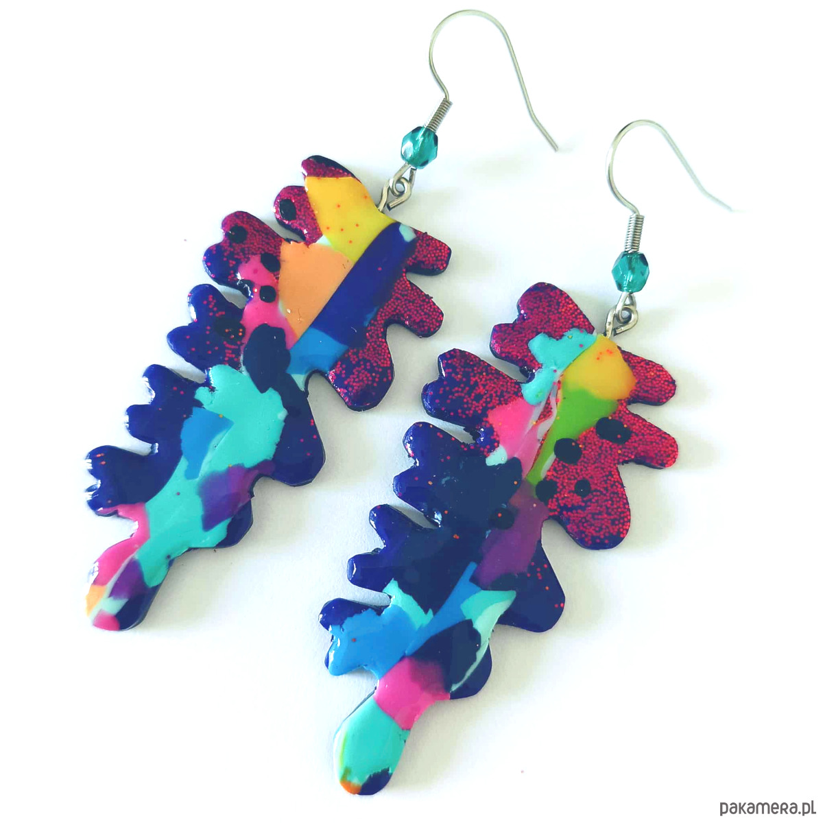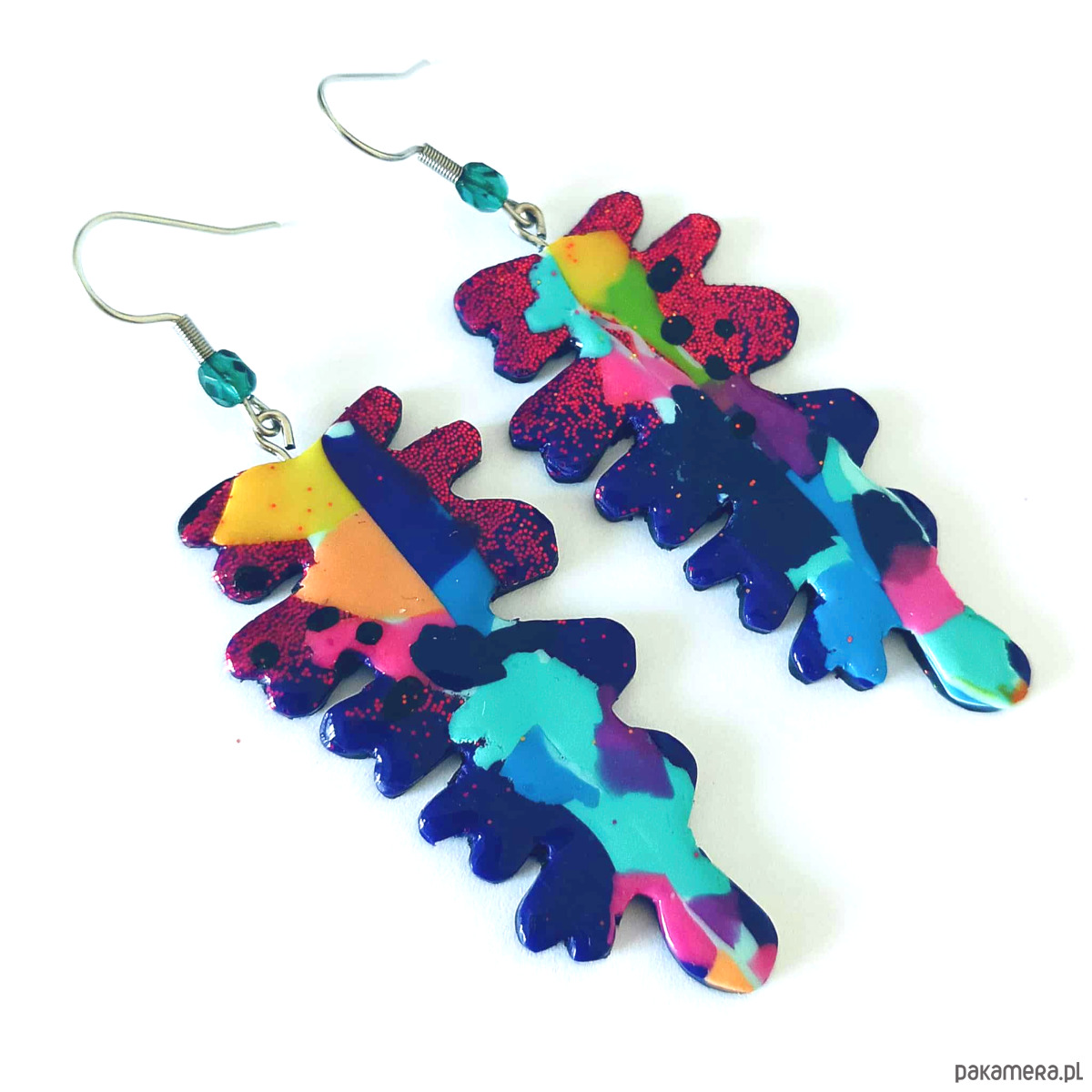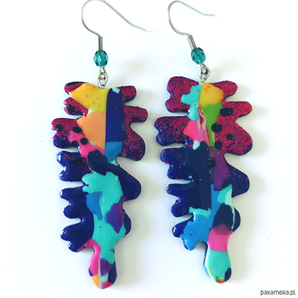 Ręcznie wykonane kolczyki z masy polimerowej w kształcie fantazyjnych liści. Połączenie intensywnych kolorów i różowego brokatu nadaje im energetyczny, radosny charakter. Kolczyki są lekkie i wygodne w noszeniu – idealne na co dzień, do imprezowych i letnich stylizacji lub jako wyjątkowy prezent dla osoby, która lubi wyrazistą, ręcznie robioną biżuterię.