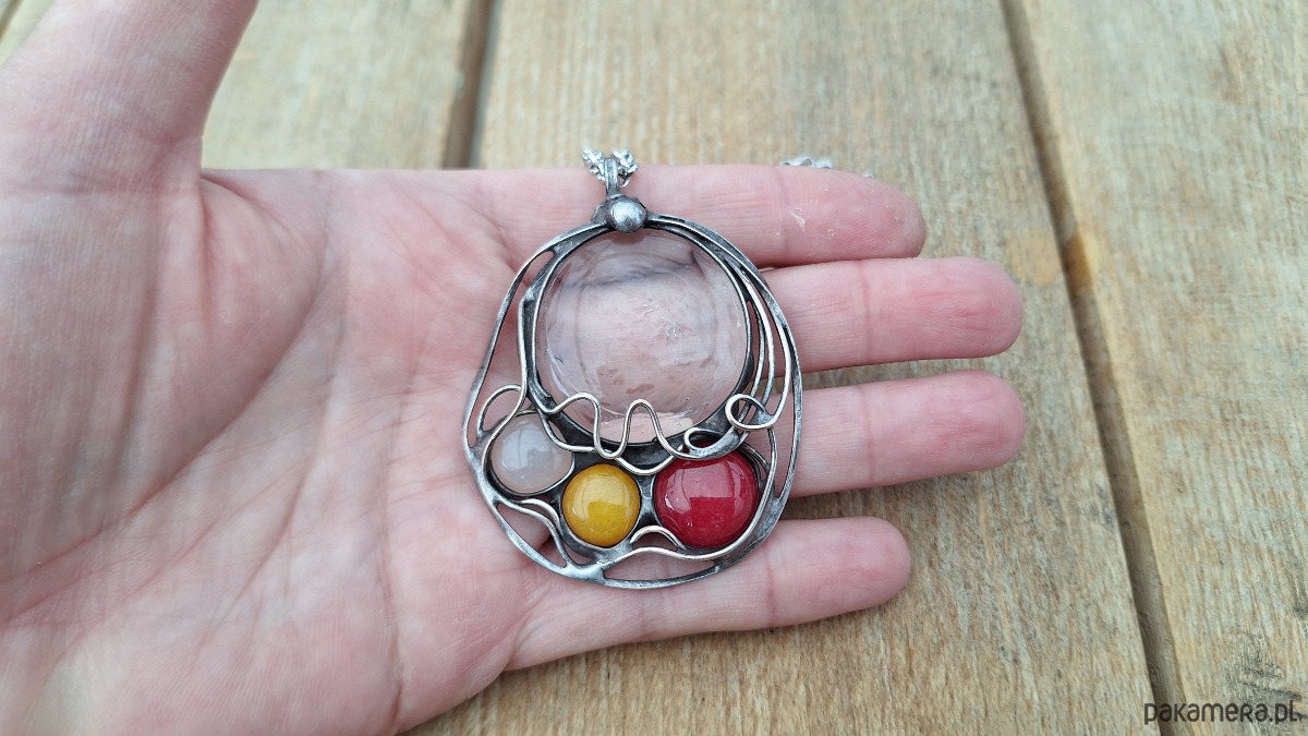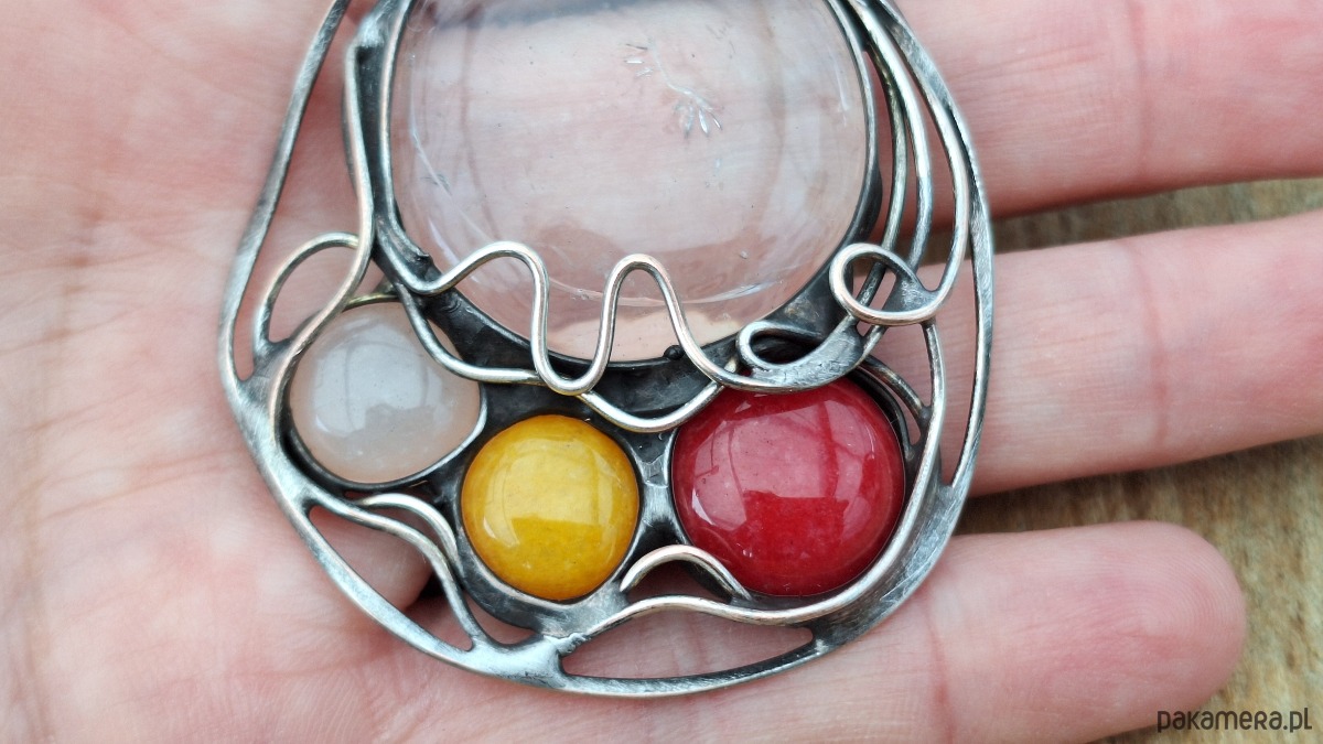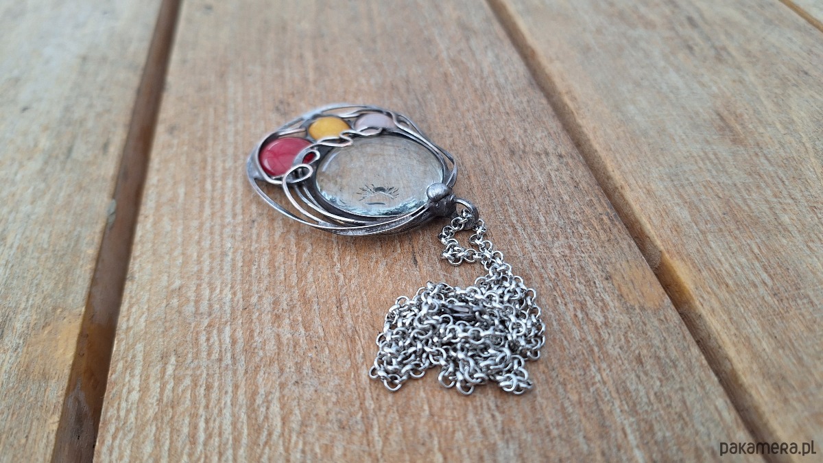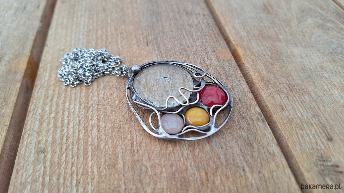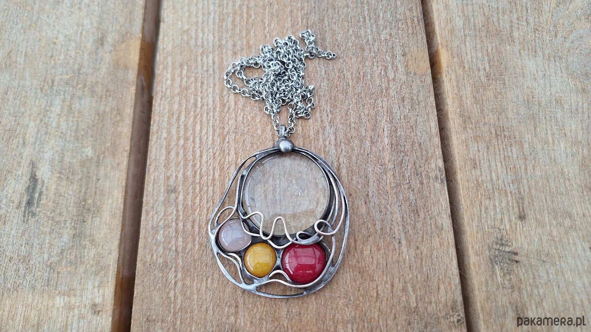 Wisiorek wykonany z miedzi, cyny, szkła, kwarcu i jadeitów. Wymiary ok. 5.5 na 4.5 cm. Zawieszony na łańcuszku o długości ok. 50 cm.