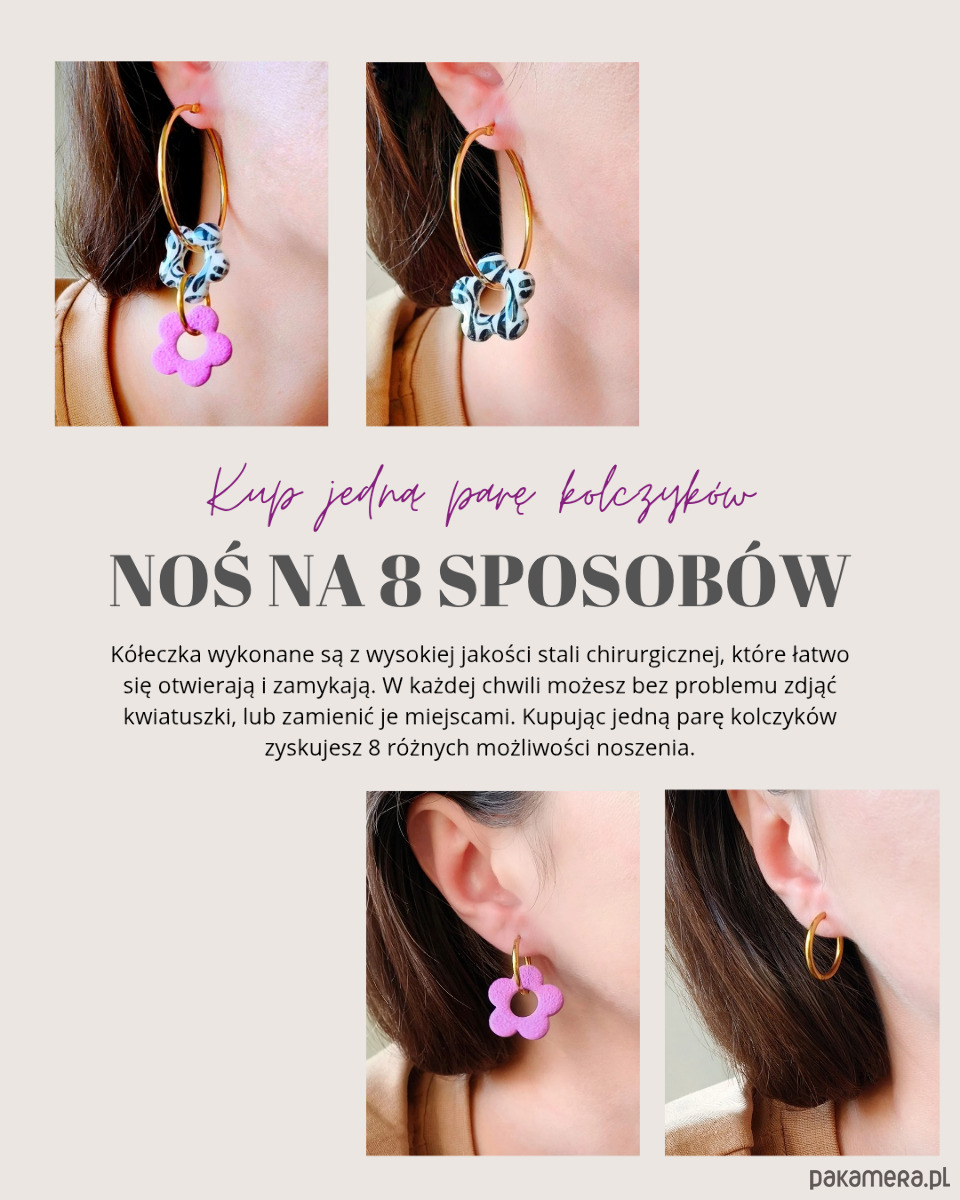 Kolczyki z kwiatuszkami na złotych kółkach to biżuteria, która daje wyjątkowo dużo swobody. Zawieszki można zdejmować i zakładać w dowolnym momencie, dzięki czemu jeden model pozwala stworzyć aż 8 różnych wariantów noszenia - od prostych, minimalistycznych kółek po romantyczne kwiatowe kompozycje.