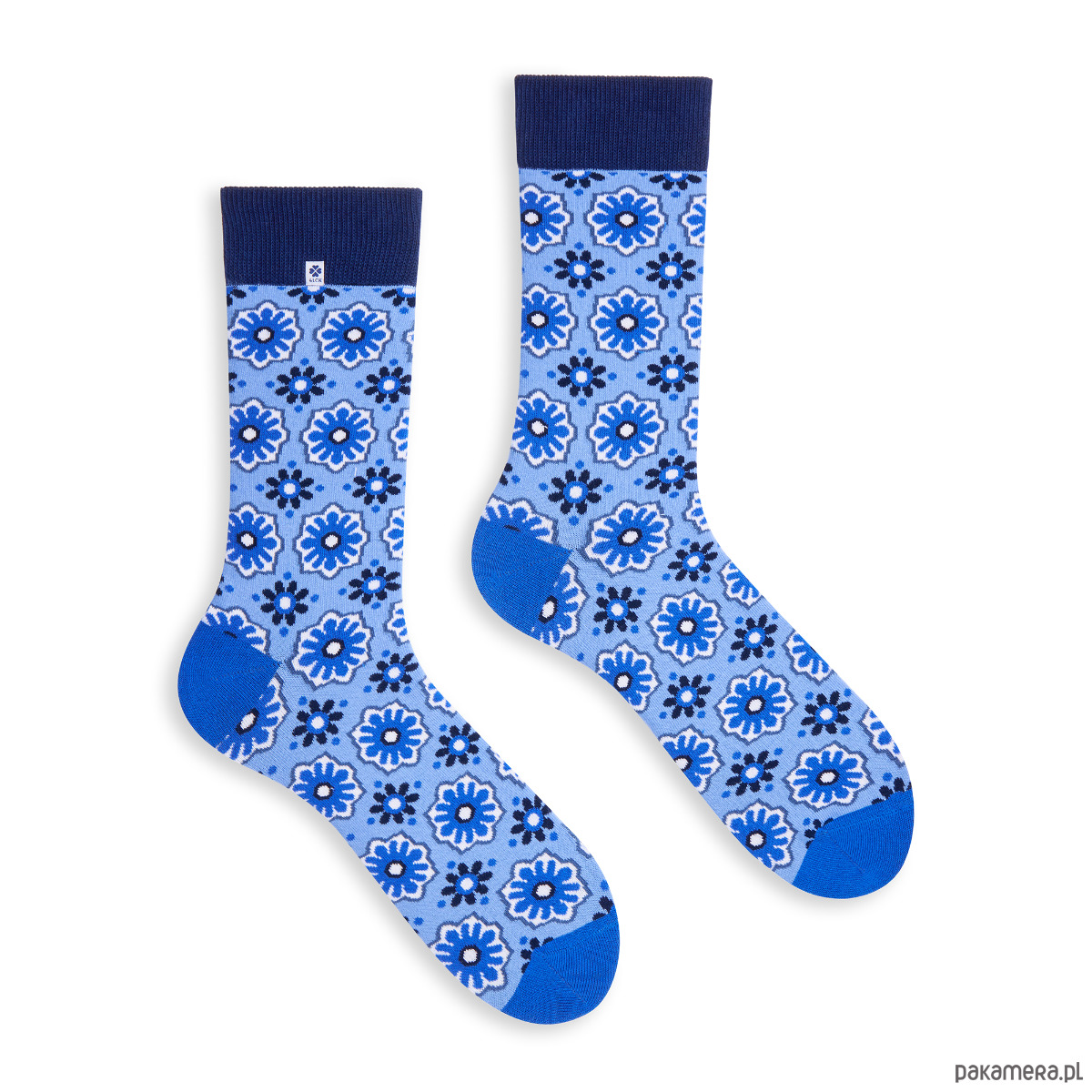 Te skarpetki mają niebieski kolor jako bazę. Na tle tego pięknego odcienia niebieskiego wyróżniają się urocze kwiatowe wzory, które nadają im charakteru i oryginalności.