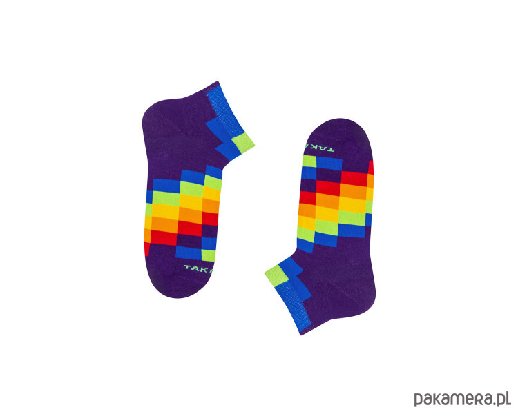 Geometryczna tęcza, a może gra komputerowa? Kolorowe skarpetki każdemu kojarzą się z czymś innym. Najlepsze jest to, że nie ma jednej poprawnej interpretacji. Stopki we wzory pobudzają wyobraźnię i sprawiają, że człowiek zaczyna kreatywnie myśleć. Prezentowany model znakomicie nadaje się na upominek. Mogą to być skarpetki dla dziewczyny, która docenia nieszablonowe rozwiązania albo dla chłopaka, który ma sentyment do starych gier. Nie ma wątpliwości, że podarunek za każdym razem stanie się powodem do szerokiego uśmiechu.