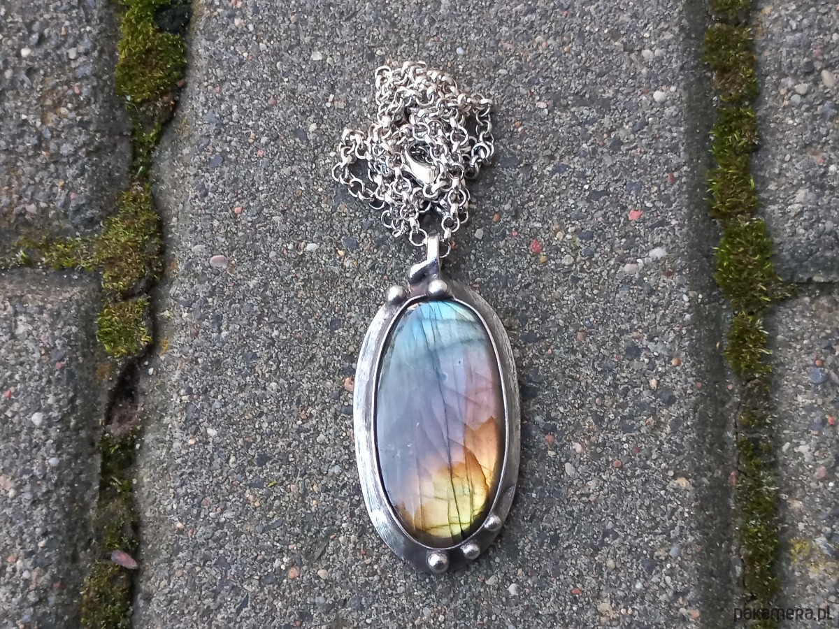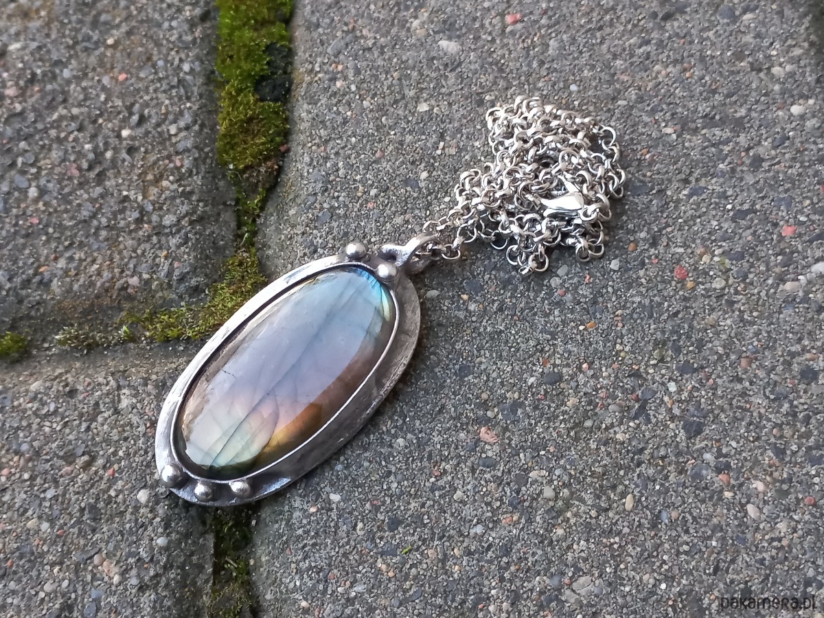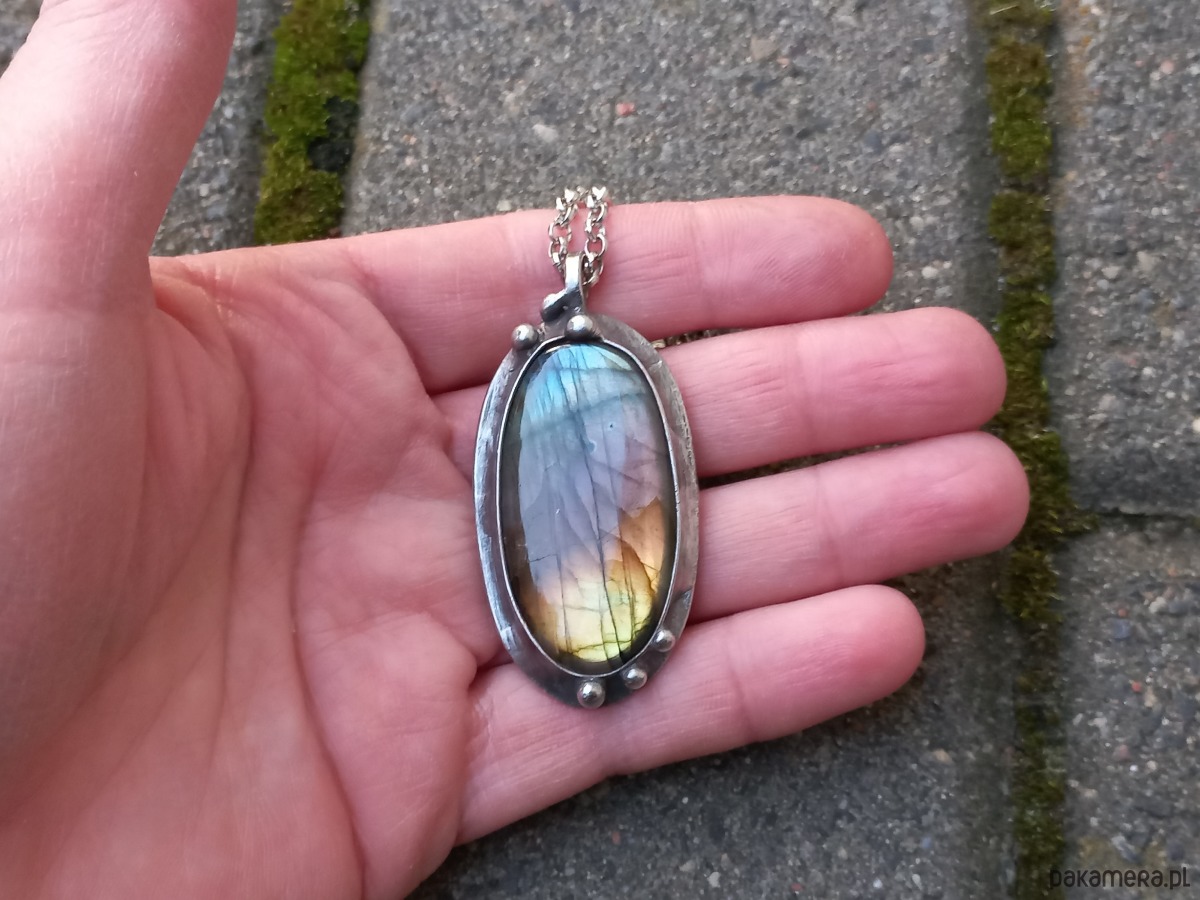 Wisiorek wykonany z miedzi, cyny i labradorytu. Wymiary ok. 5 na 2,7 cm. Zawieszony na łańcuszku o długości ok. 50 cm.