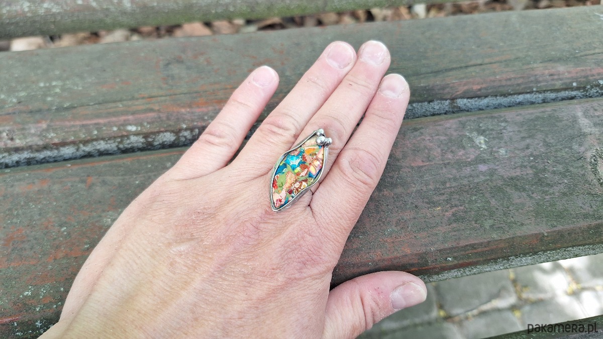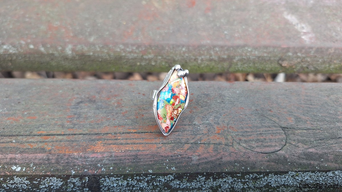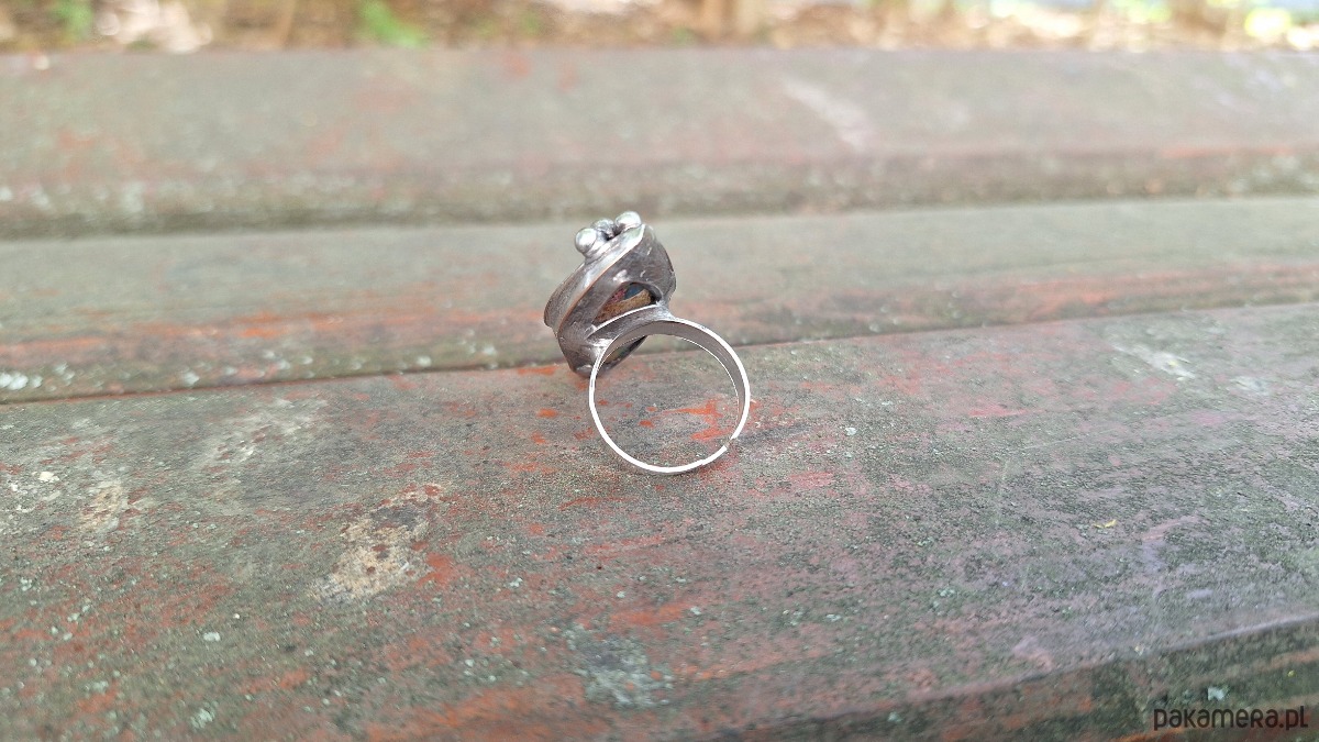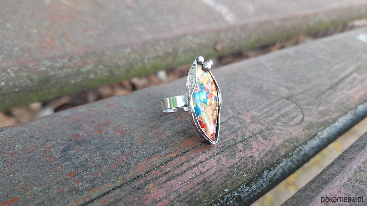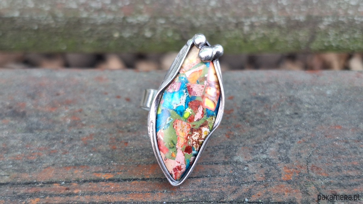Pierścionek wykonany z miedzi, cyny i jaspisu. Wymiary ok. 3.5 na 1.6 cm. Regulowany. Nie jest ciężki.