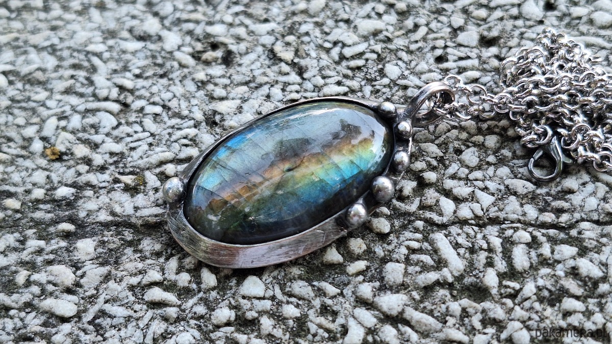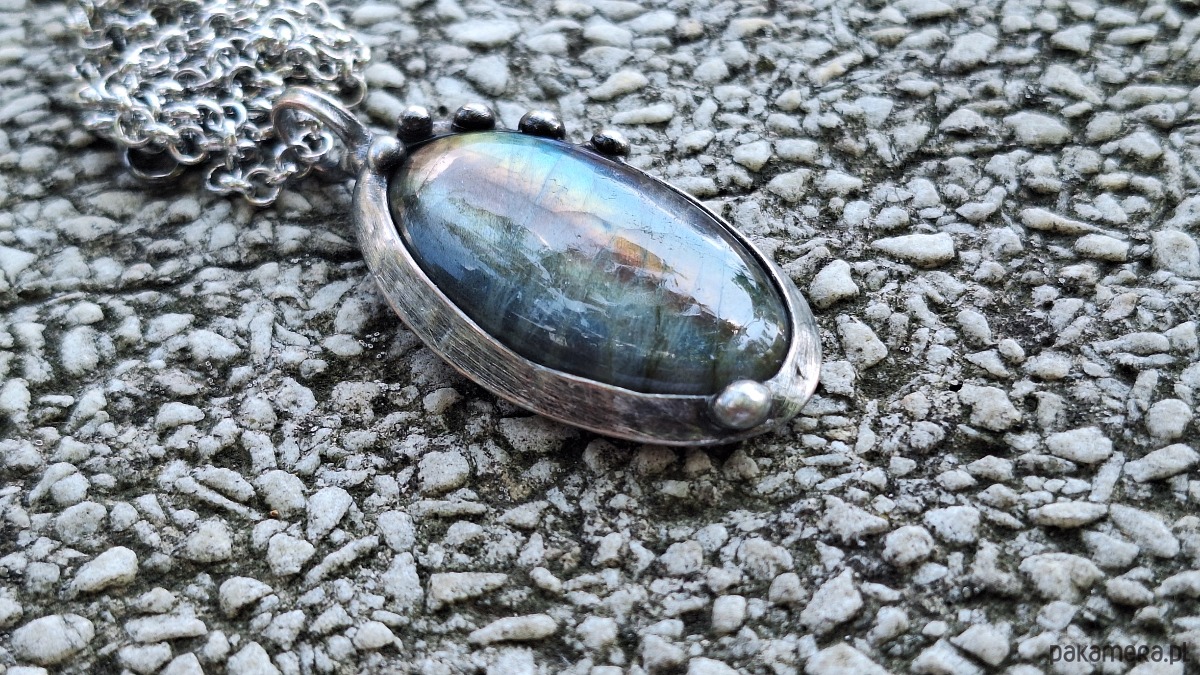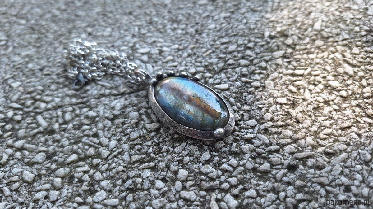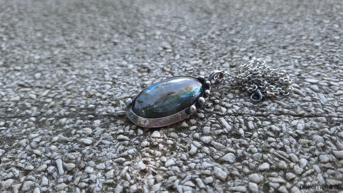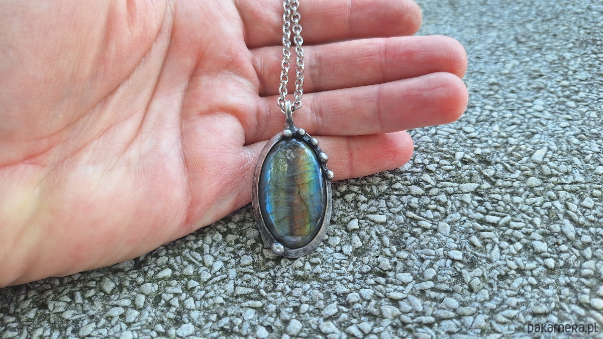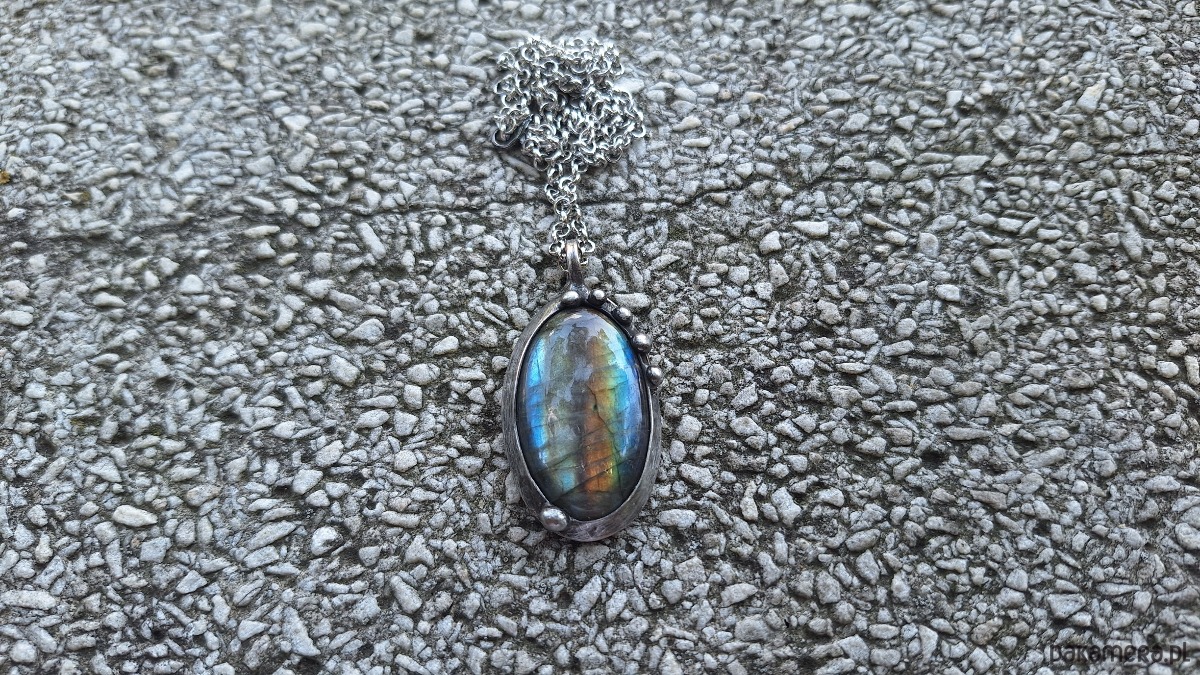 Wisiorek wykonany z miedzi, cyny i labradorytu. Wymiary ok. 4 na 2.5 cm. Zawieszony na łańcuszku o długości ok. 50 cm.