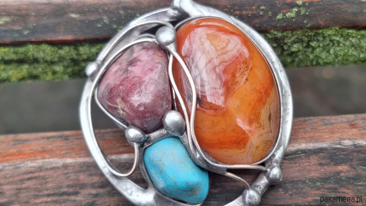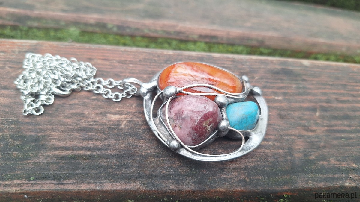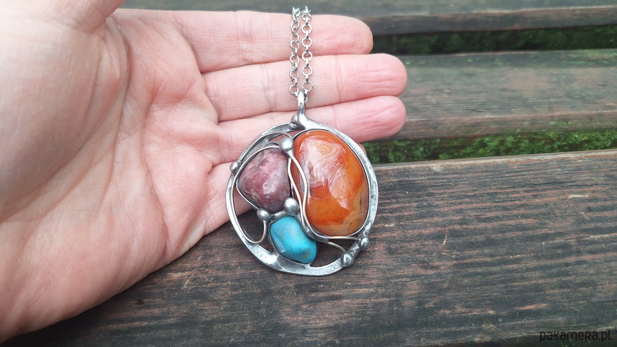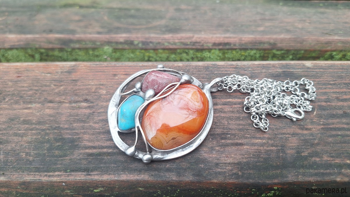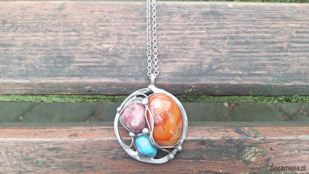 Wisiorek wykonany z miedzi, cyny, rodonitu, howlitu i agatu. Wymiary ok. 5 na 5 cm. Zawieszony na łańcuszku o długości ok. 50 cm.