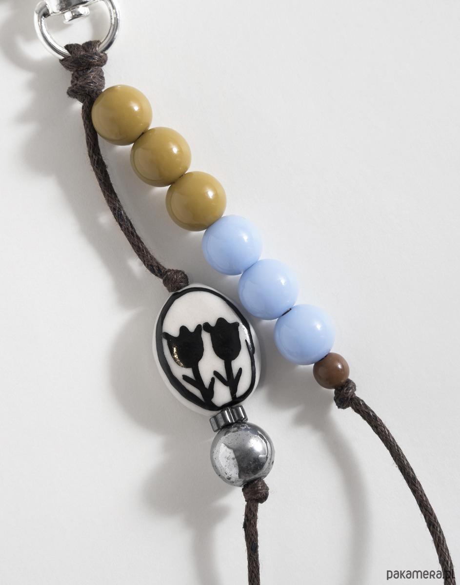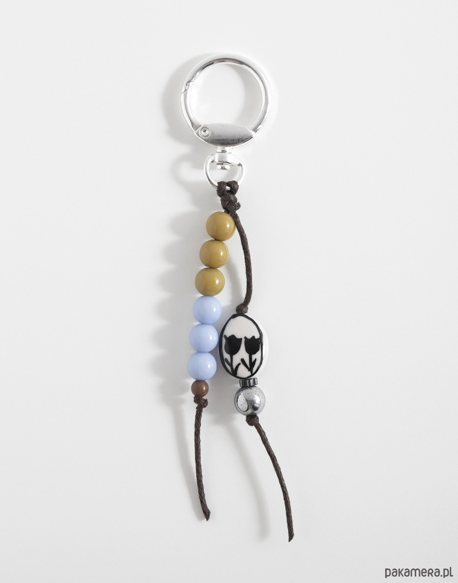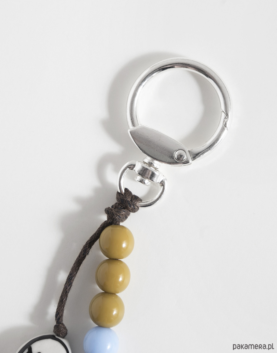 Brelok do torebki, plecaka lub kluczy wykonano ręcznie na sznurku bawełnianym z koralików akrylowych w odcieniach musztardowym i baby blue, elementów ceramicznych oraz kamieni naturalnych - hematytu. To niewielki dodatek, który subtelnie dopełni codzienne stylizacje.