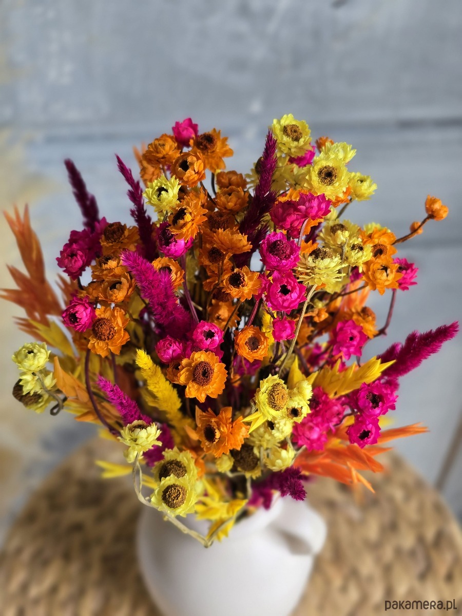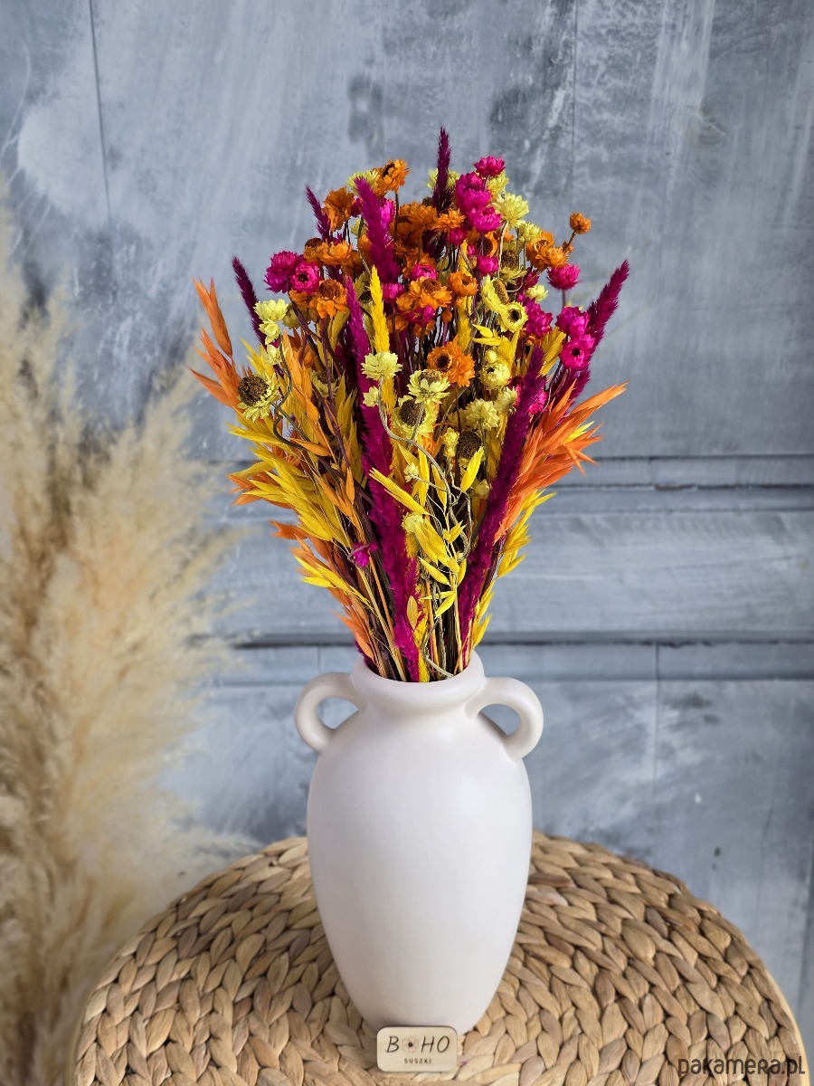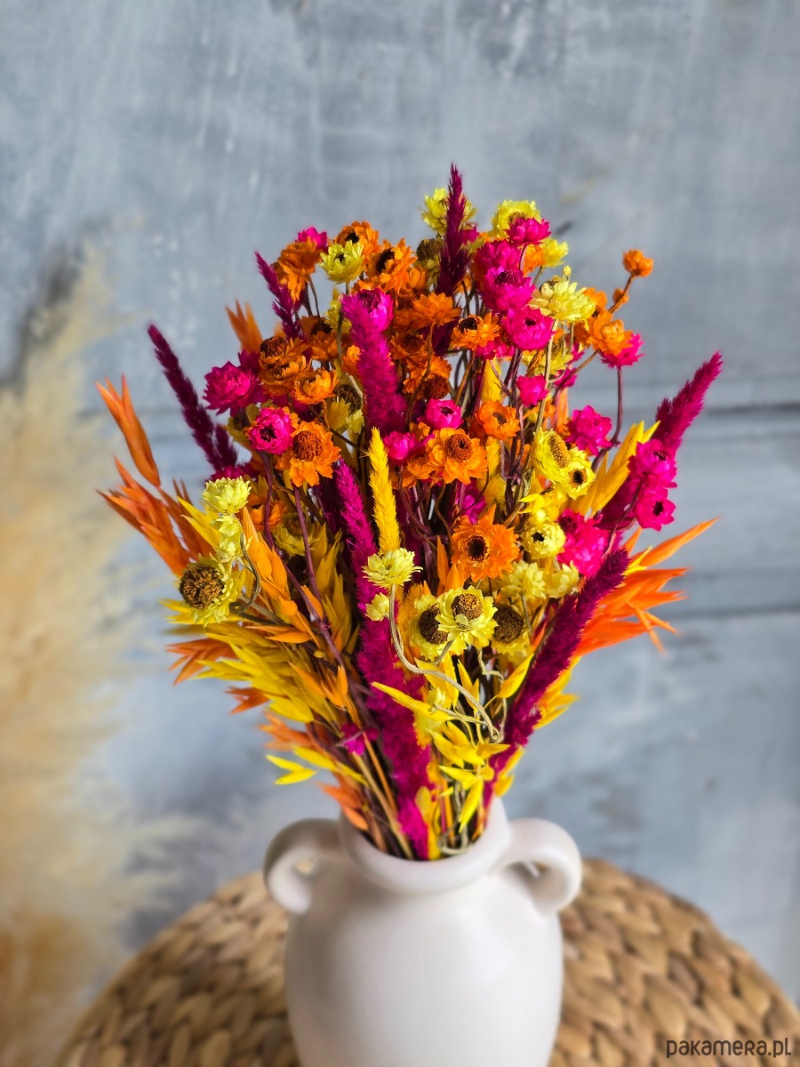 💐 Wyrazisty bukiet z suszonych kwiatów w odcieniach różu, pomarańczu i żółci – energetyczna dekoracja do salonu, sypialni lub domowego biura. Wprowadza radość, ciepło i odrobinę szaleństwa. Świetnie pasuje do stylu boho, eklektycznego lub maksymalistycznego – wszędzie tam, gdzie nie boimy się koloru.