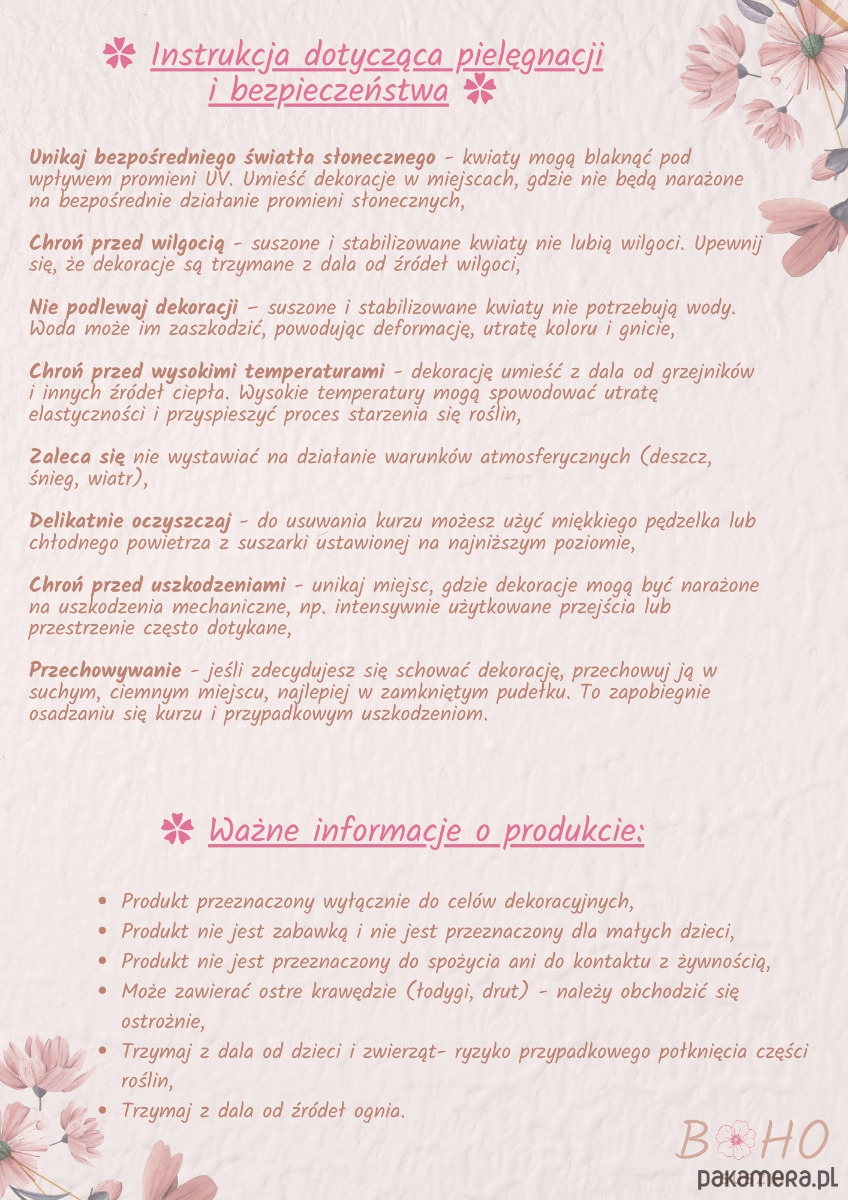 Oferta dotyczy samego bukietu, bez wazonu. Bukiet ma około 40 cm wysokości. Pojedyncze gałązki mają różne długości, co nadaje kompozycji naturalny, dynamiczny wygląd. W zależności od kształtu i wielkości wazonu, bukiet może układać się nieco inaczej.