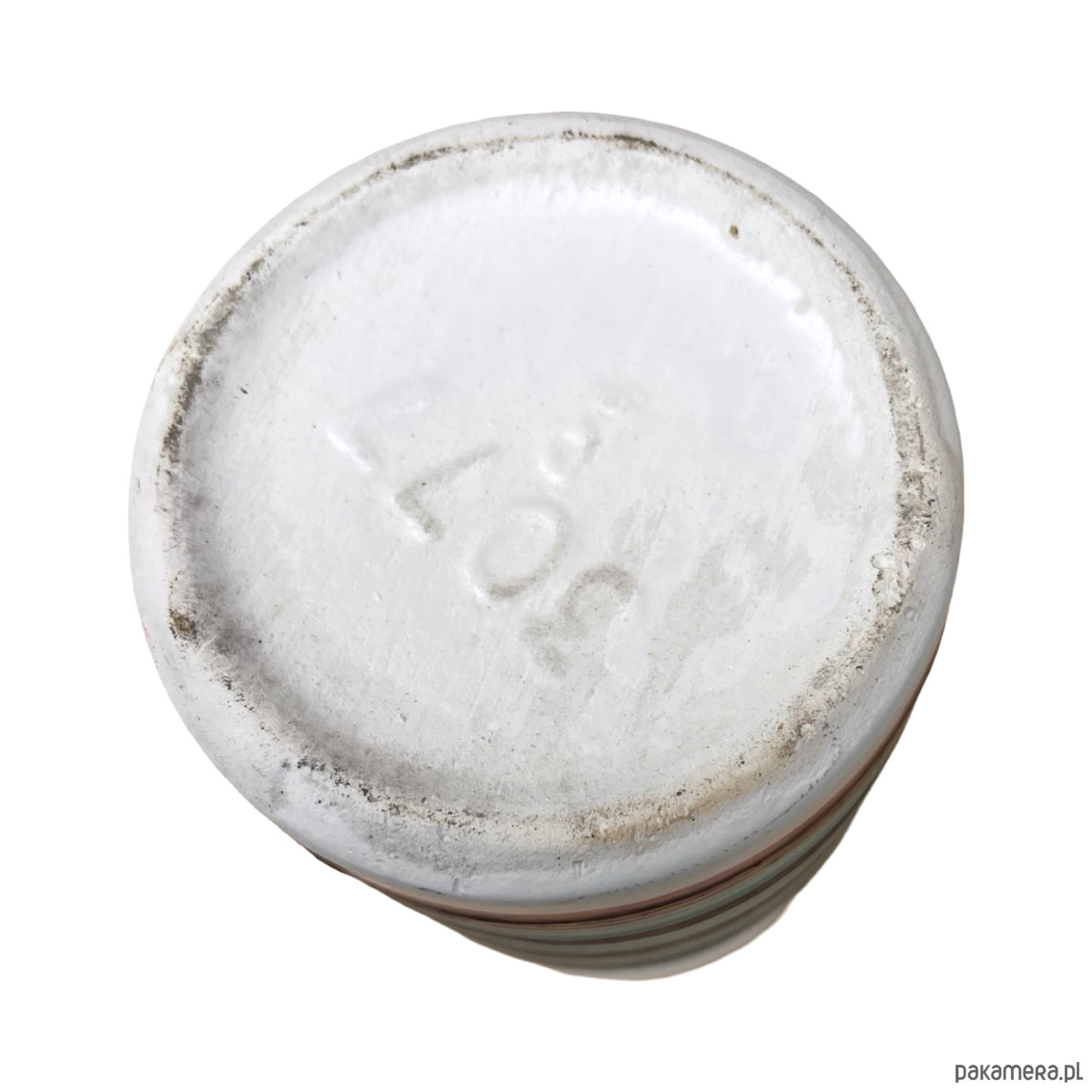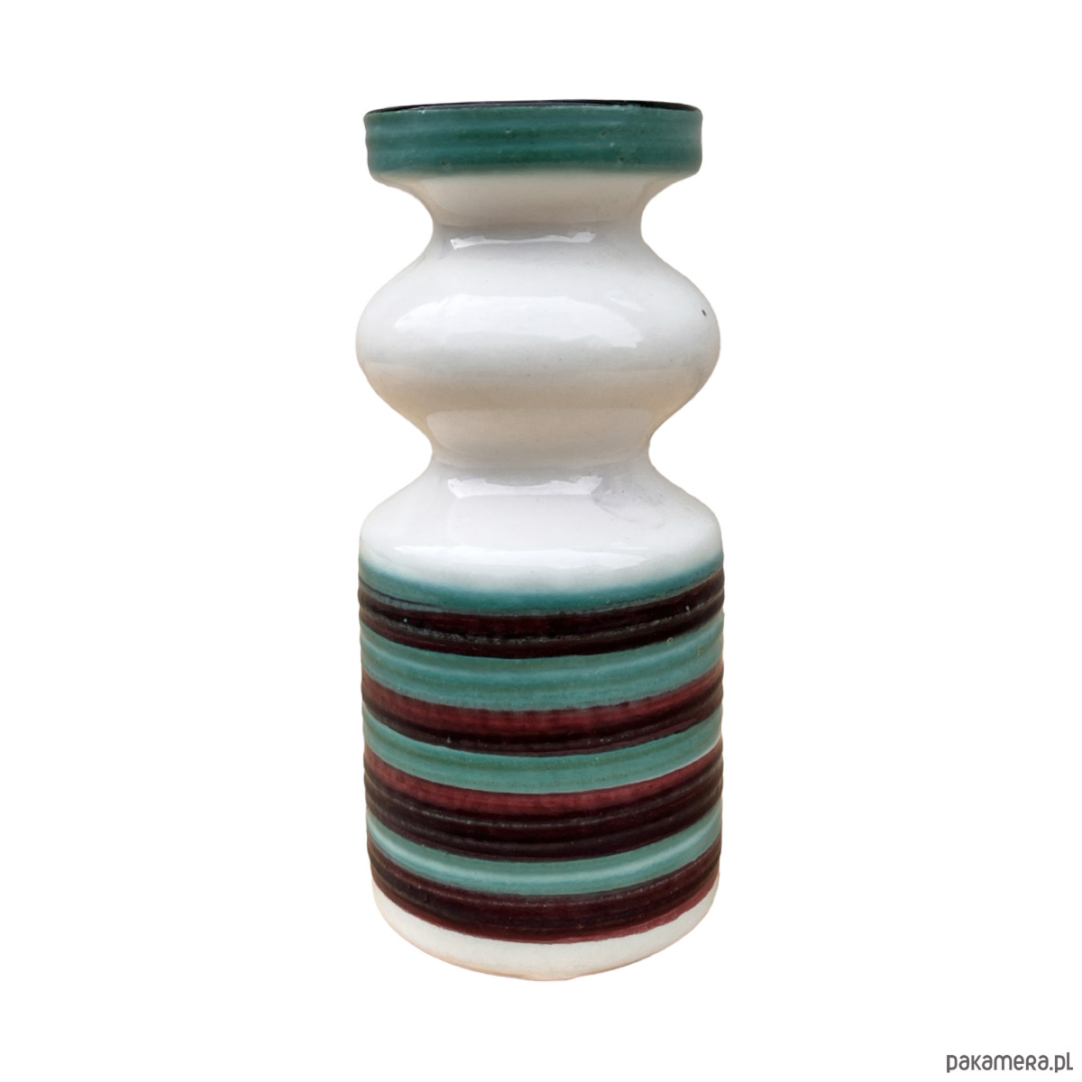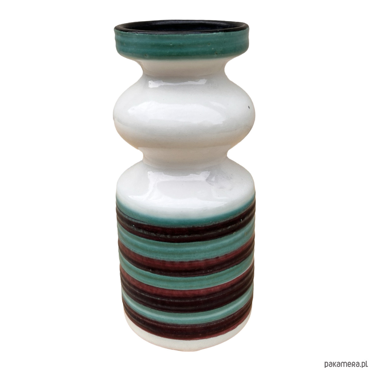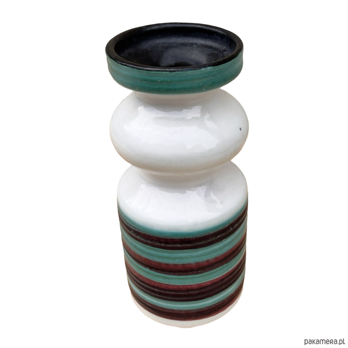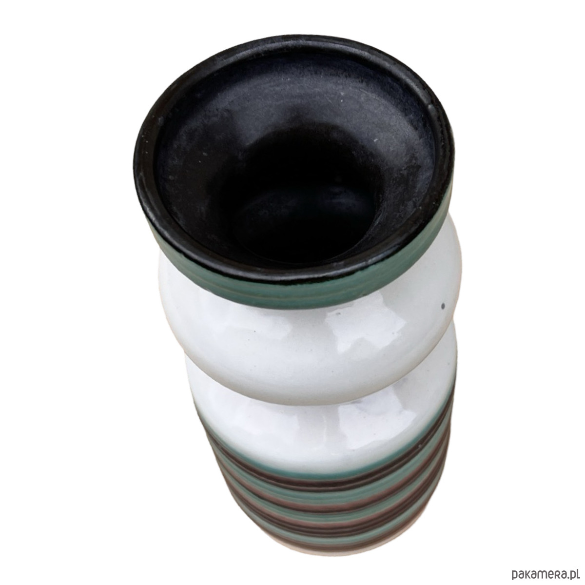 Ręcznie malowany wazon ceramiczny w stylu New Look z kolorową malaturą wyprodukowany przez Strehla Keramik w Niemczech w latach 60. Wazon o malaturze z ciekawymi, prymitywistycznymi ornamentami, wewnętrz czarny. Wazon w stanie oryginalnym, bardzo dobrym, nosi minimalne ślady użytkowania. Sygnowany od spodu "Strehla export 3077".