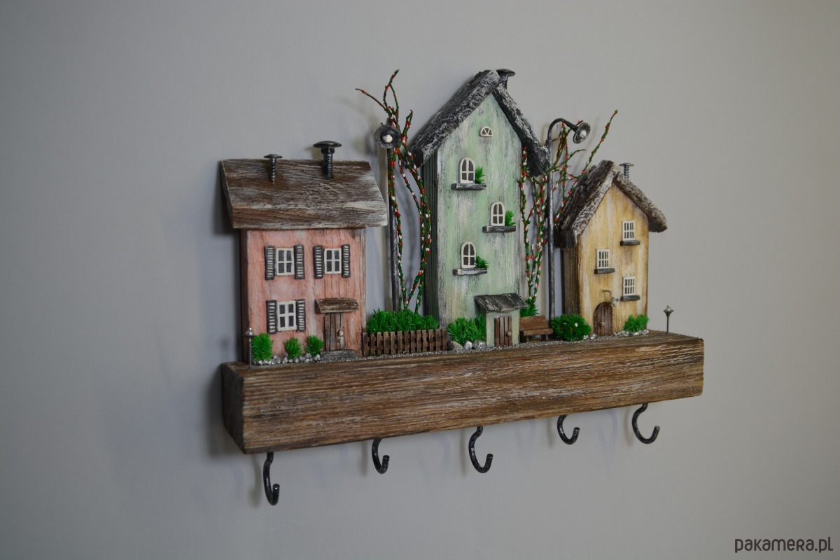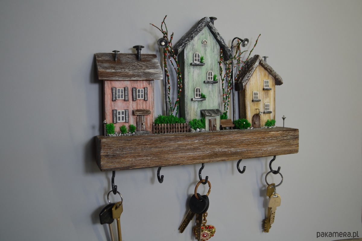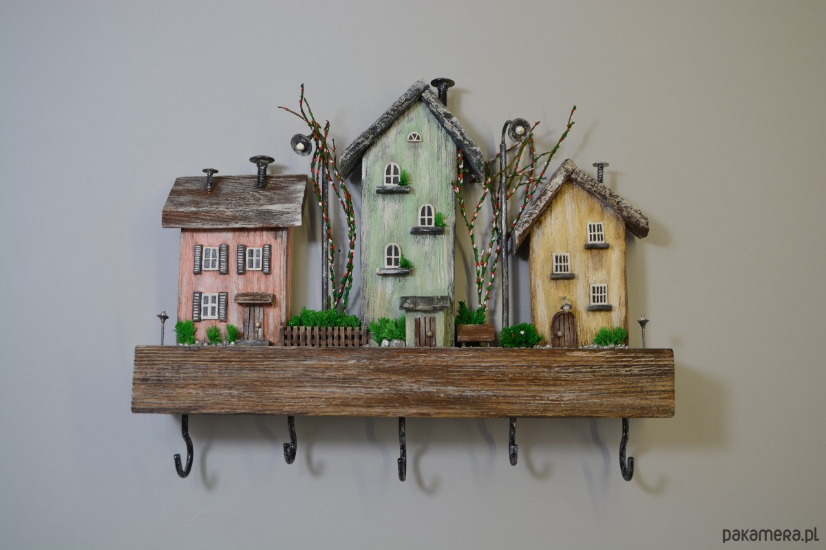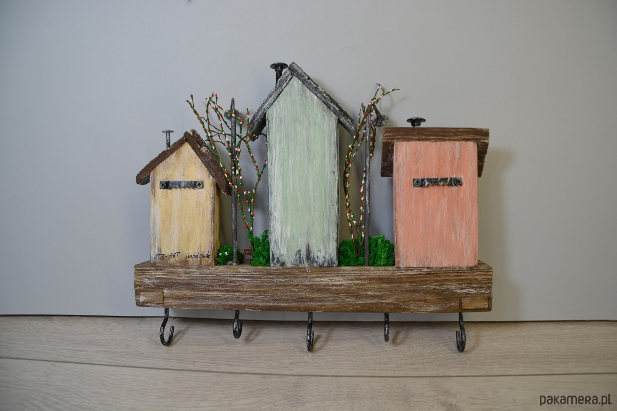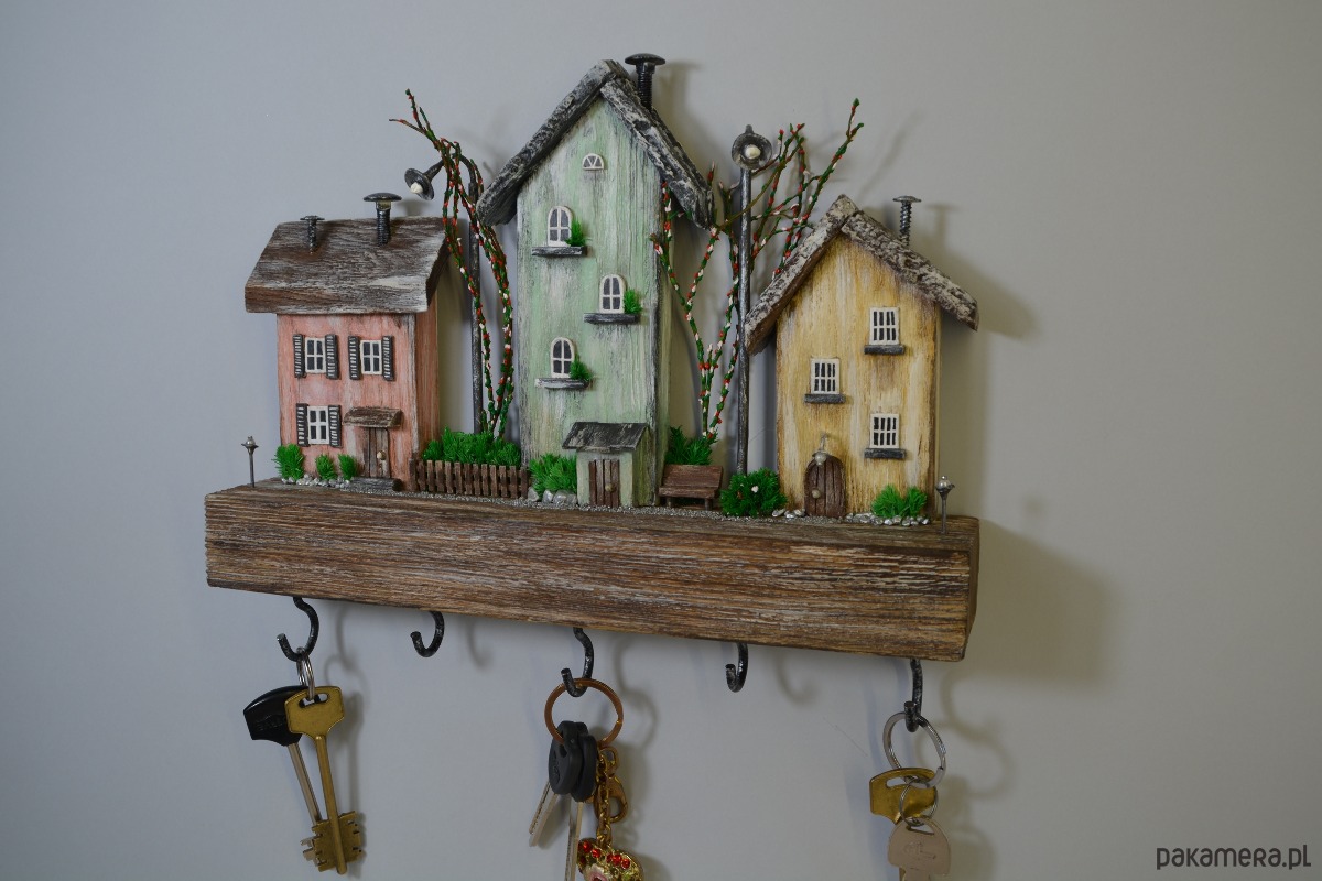 Ten uroczy, ręcznie wykonany wieszak na klucze łączy funkcję praktyczną z dekoracyjną. Składa się z drewnianej belki ozdobionej kilkoma kolorowymi mini domkami – każde domki zostały starannie wyrzeźbione, pomalowane ekologicznymi farbami i zabezpieczone lakierem. Organizator posiada 5 haków do zawieszenia kluczy, co czyni go praktycznym rozwiązaniem do przedpokoju, kuchni lub holu. Dzięki uchwytom montażowym z tyłu łatwo zawiesisz go na ścianie. Ten wieszak będzie świetnym dodatkiem w przedpokoju lub holu, a także pięknym pomysłem na prezent dla miłośników rękodzieła i oryginalnych dekoracji.